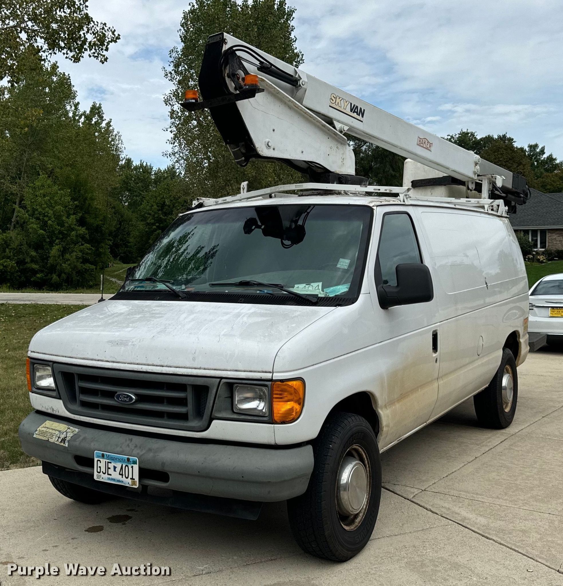 2006 Ford E350 Super Duty van with bucket lift. Miles: 151,641 on odometer, VIN: 1FTSE34L86HB21885. Engine Displacement: 5.4L V8 SOHC, Cylinders: 8, Fuel type: Gas. Transmission Automatic. Chassis Axles: Single, Suspension: Spring, Brakes: Hydraulic. Interior AC, Heat. Features Boom 2006 Baker UVN35A, Serial: 10487228-0206, Maximum lift height: 35', Boom type: Articulating, Telescopic, Man basket, Boom controls Platform/ basket, Remote control. Tires Size: 245/75R16. Notes Contents not included, Cable plow not included, Contents will be removed prior to auction end, Dash warning indicator: Check engine, Dash warning indicator: Low fuel. Minnesota title. Title distribution may be delayed up to 30 days from verification of funds. Lemont, IL 60439