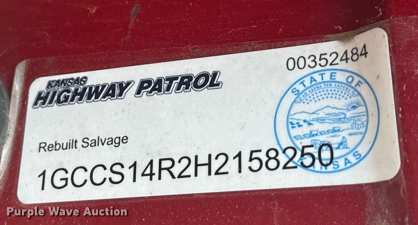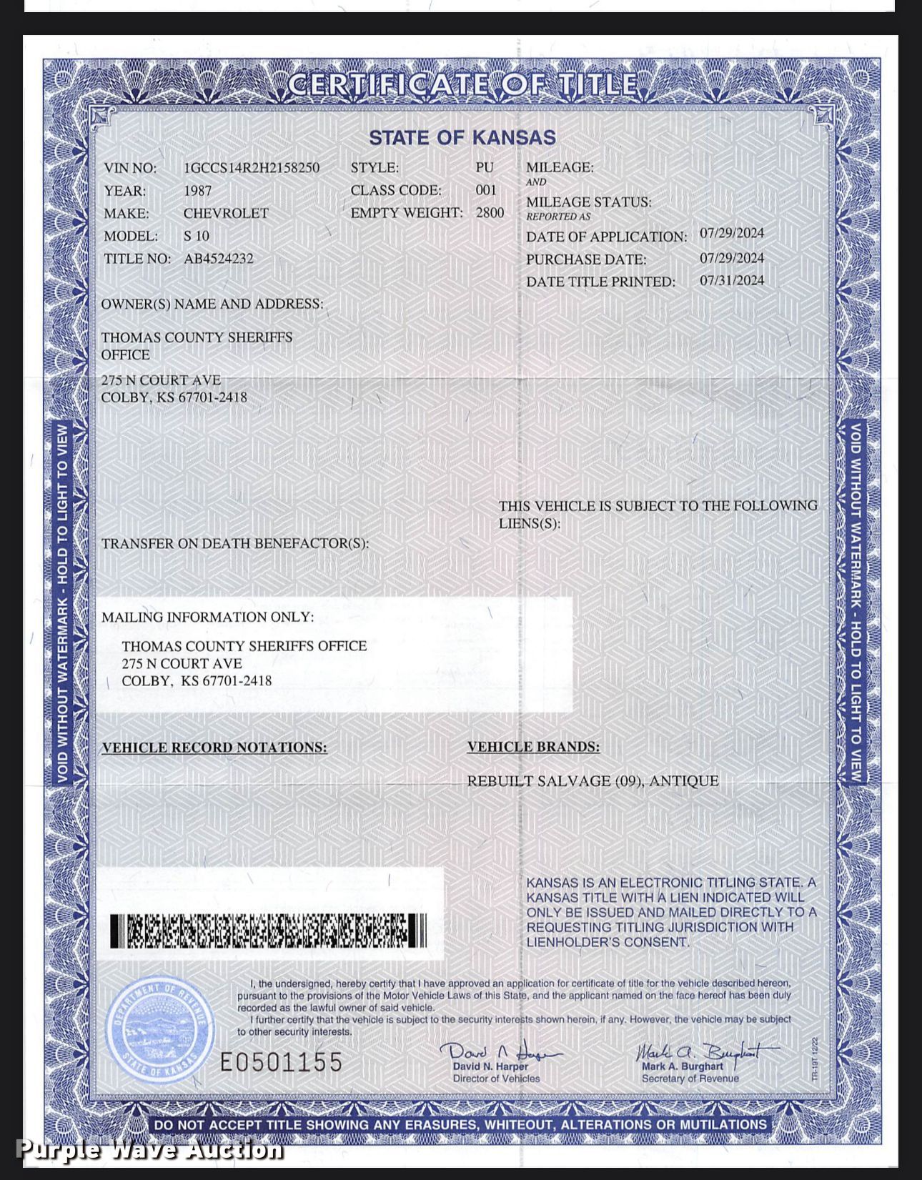 1987 Chevrolet S10 Ext. Cab pickup truck. Miles: 208,409 on odometer, VIN: 1GCCS14R2H2158250. Engine Displacement: 2.8L V6 OHV, Cylinders: 6, Fuel type: Gas. Transmission Automatic. Interior AC, Heat. Tires Size: 205/75R14. Notes Ignition switch issues, will not turn, Rust damage, Flat tire, Non-operational unit. Kansas rebuilt salvage, antique title. Seller is a government entity who will be assigning and distributing the title. Please contact the seller for distribution questions. Thomas County Sheriffs Office. Colby, KS 67701
