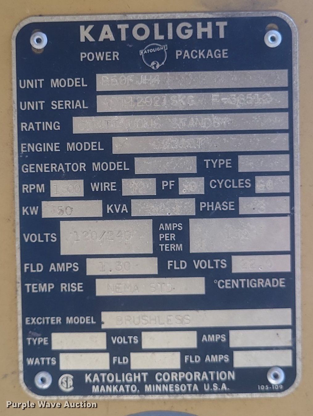 Purple Wave is selling a used Generator Set in Missouri. This item is a Katolight D50F JH4 generator with the following: Hours: 677 on meter, Serial: AD112921SKGF-36512, Dimensions: 120" L x 40" W x 84" T