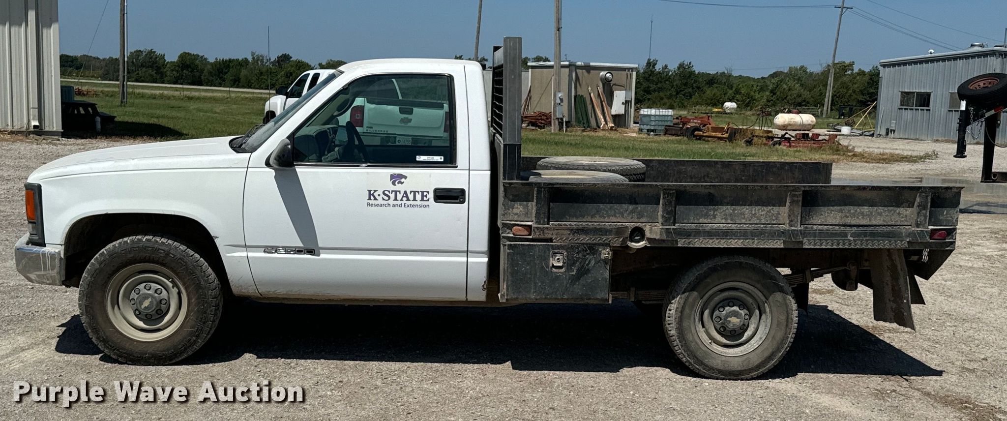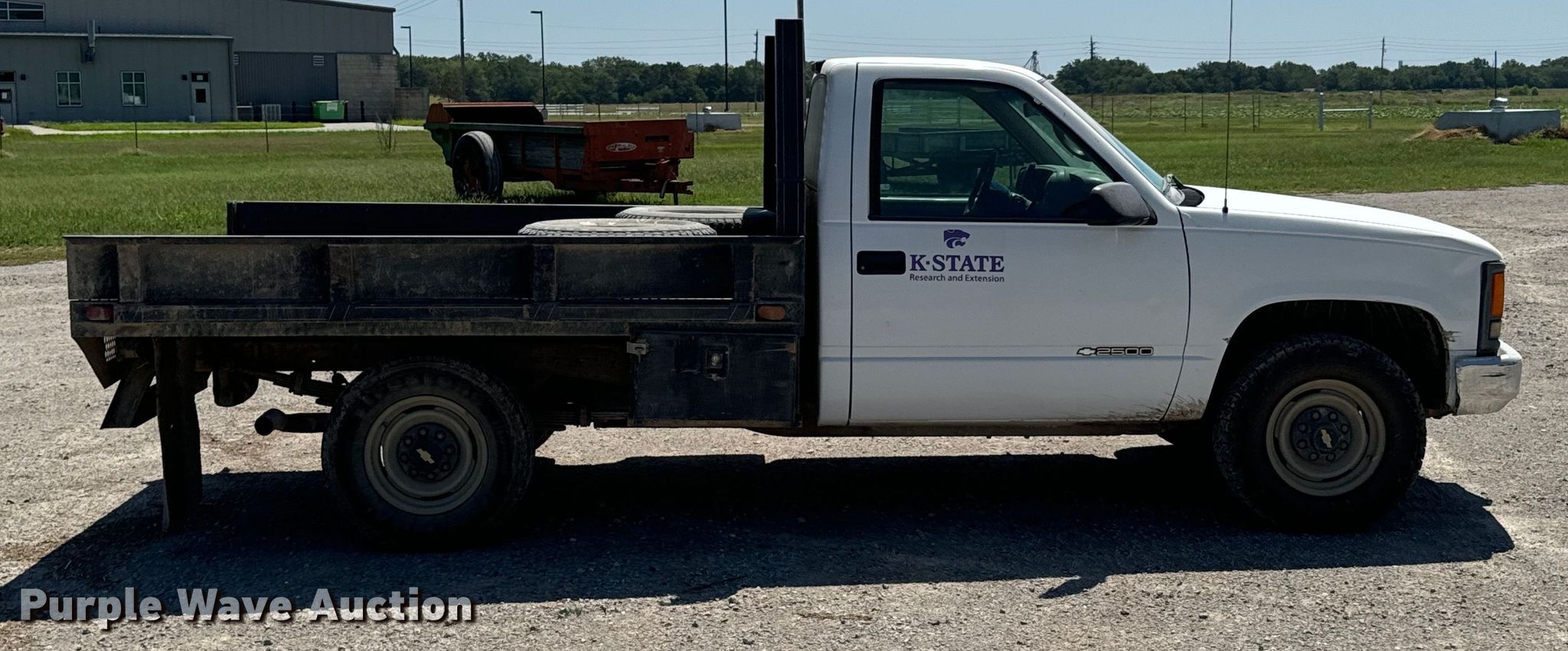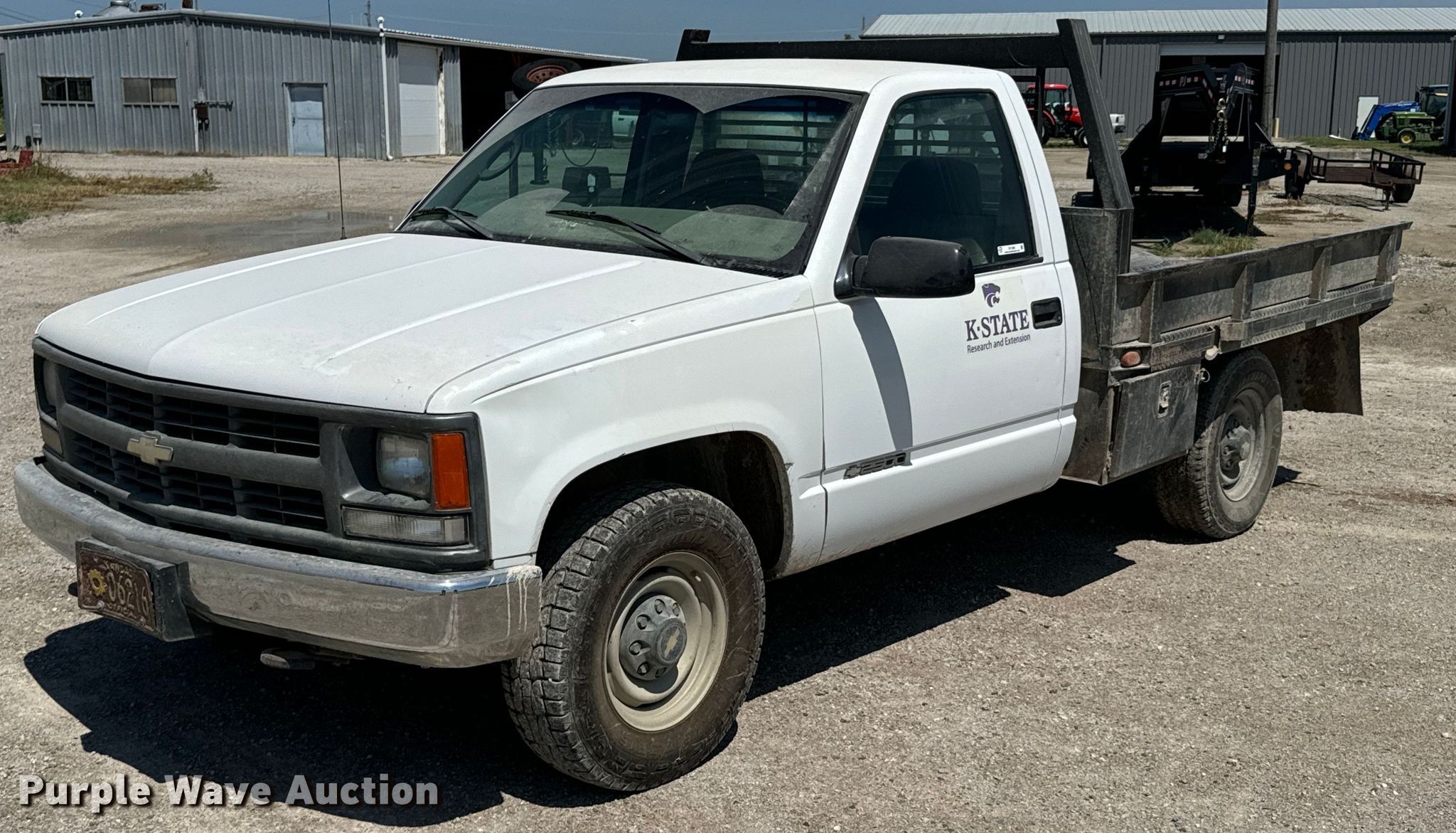 1999 Chevrolet C2500 flatbed pickup truck. Miles: 159,726 on odometer, VIN: 1GCGC24R7XR706740. Engine Displacement: 5.7L V8 OHV, Cylinders: 8, Fuel type: Gas. Transmission Automatic. Interior AC, Heat. Features Flatbed 8' 6" L x 82" W, Hitch: Gooseneck. Tires Size: LT245/75R16. Notes Windshield chipped or cracked. Kansas title. K-State Southeast Research and Extension Center. Parsons, KS 67357