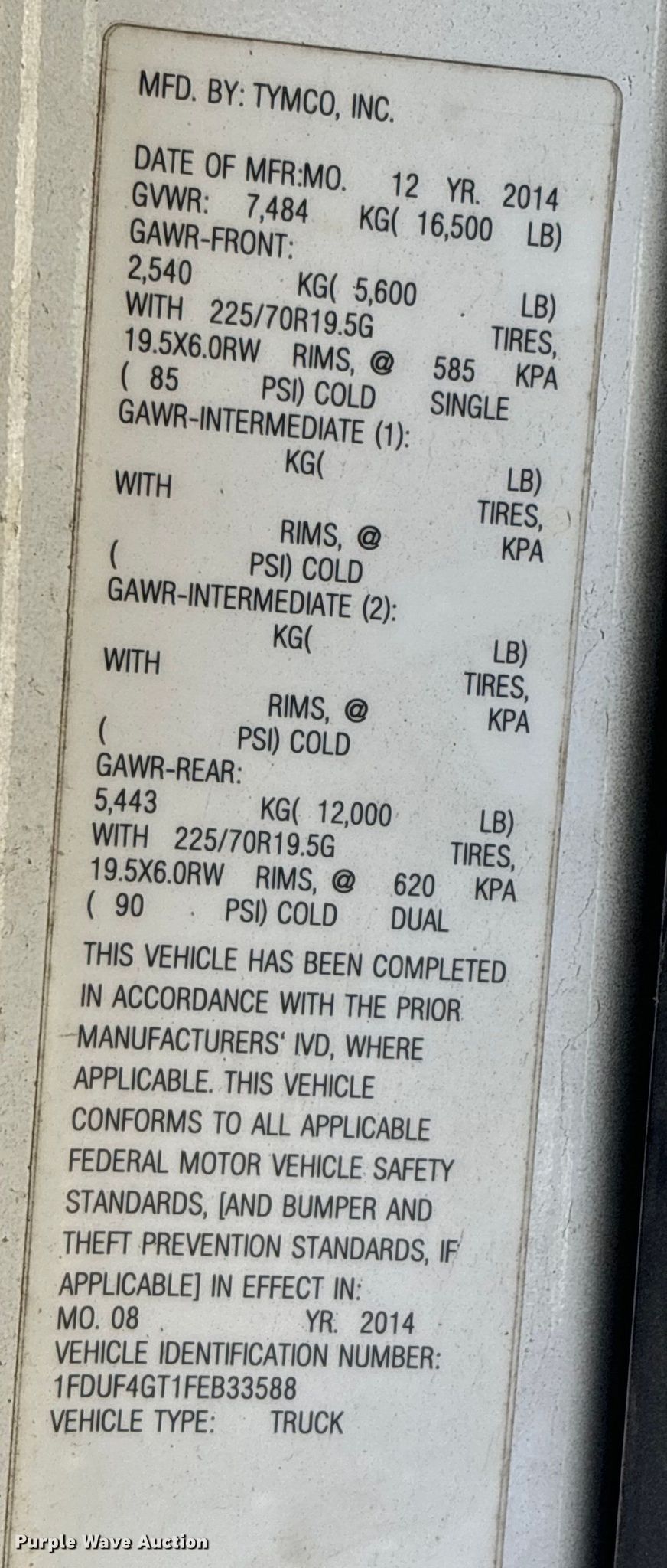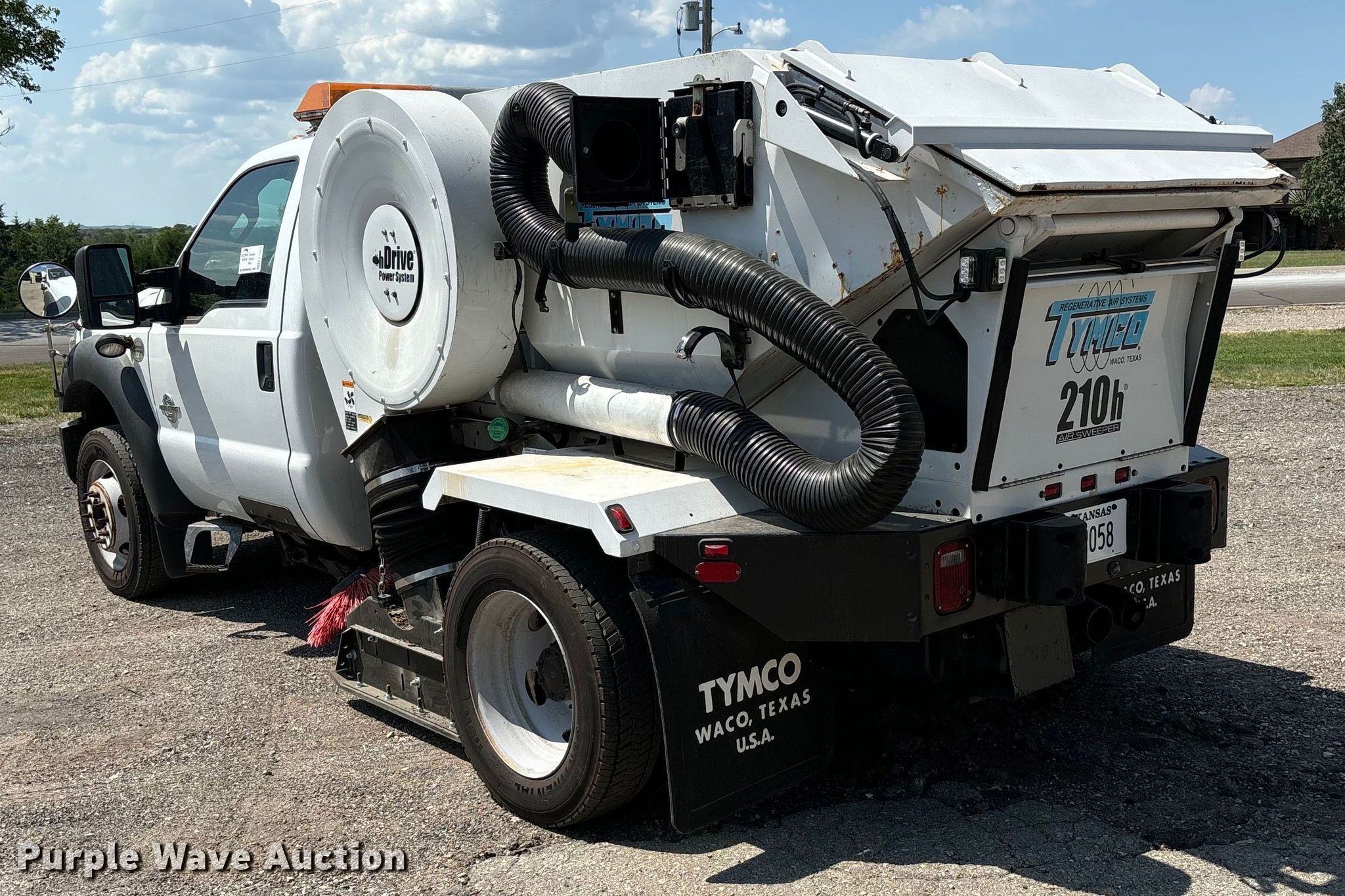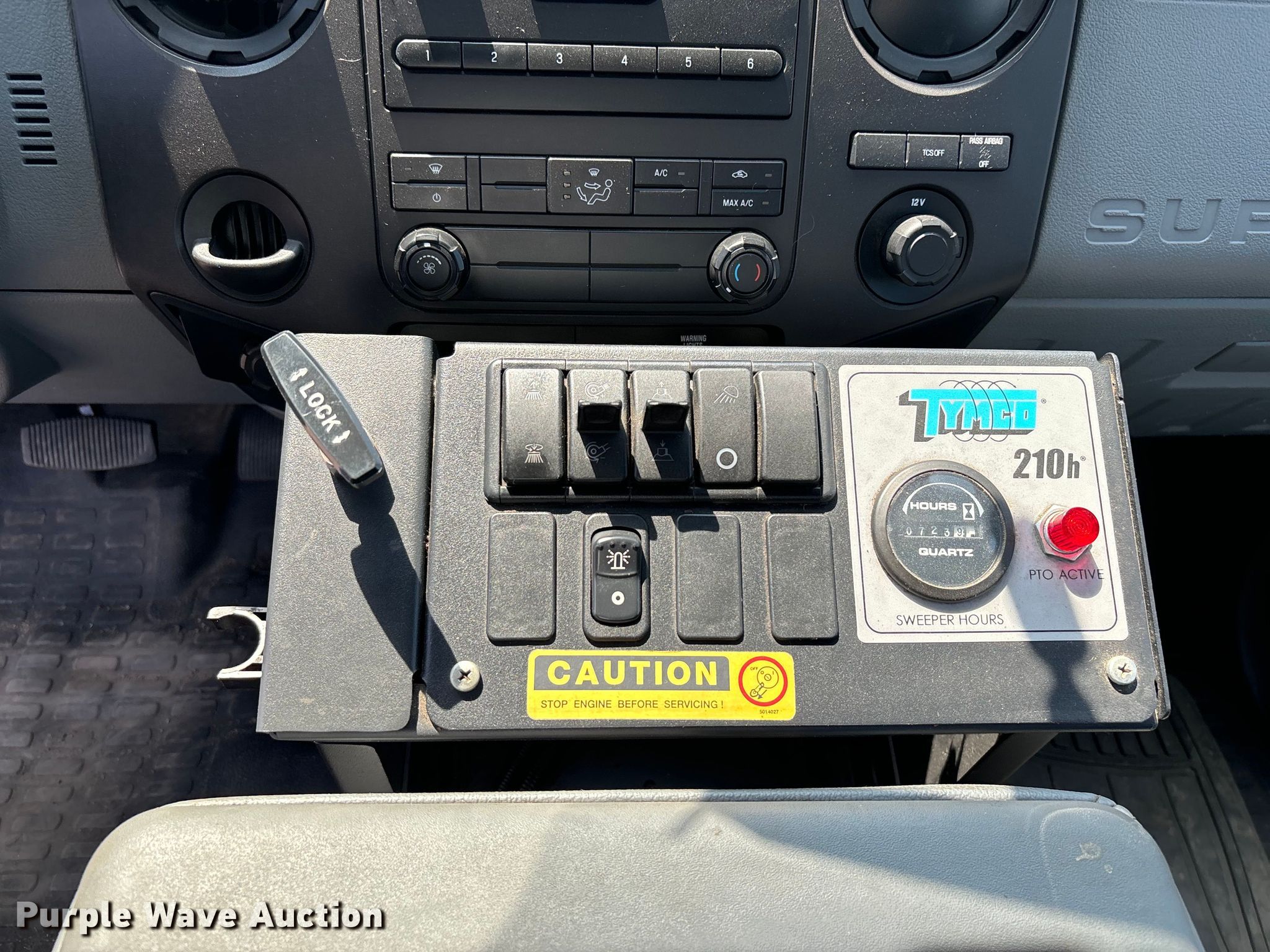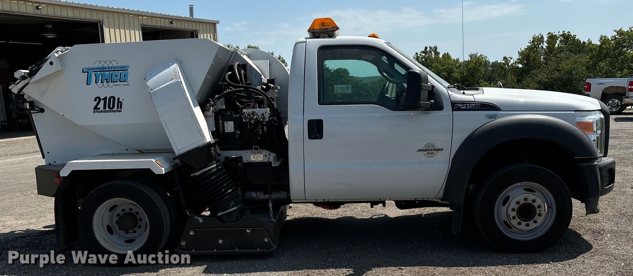2015 Ford F450 Super Duty XL street sweeper truck. Miles: 5,444 on odometer, Hours: 724 on meter, VIN: 1FDUF4GT1FEB33588, Serial: 2015123NH237550. Engine Displacement: 6.7L, Cylinders: 8, Fuel type: Diesel. Transmission Automatic. Chassis Suspension: Spring, Brakes: Hydraulic, GVWR: 16,500 lbs. Operators station AC, Heat. Features Width: 78", Sweeper bed Sweeper bed type: Vacuum Tymco 210H, Serial: 201512SNH23755H, Left gutter broom Diameter: 24".. Tires Size: 225/70R19.5. Notes Dash warning indicator: Check engine. Kansas title. City of Alma. Alma, KS 66401