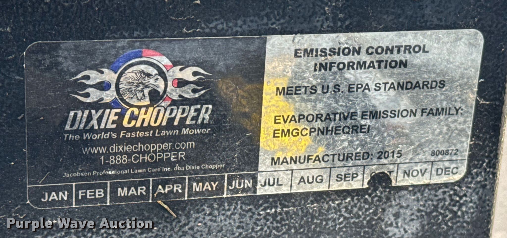 Purple Wave is selling a used Lawn Mower in Kansas. This item is a 2015 Jacobsen Dixie Chopper ZTR lawn mower with the following: Hours: 1,833 on meter, Cutting width: 60", Serial: 10069