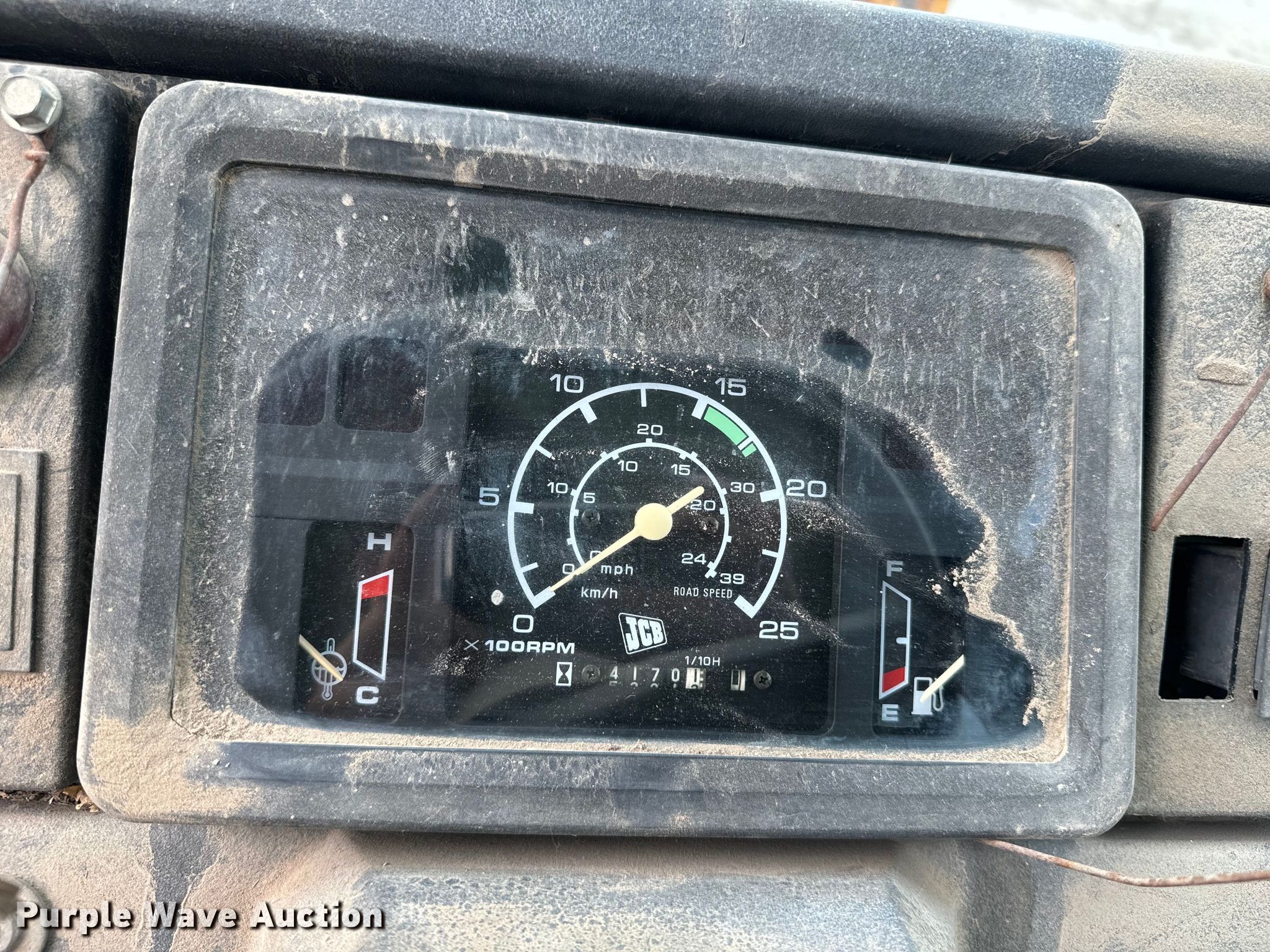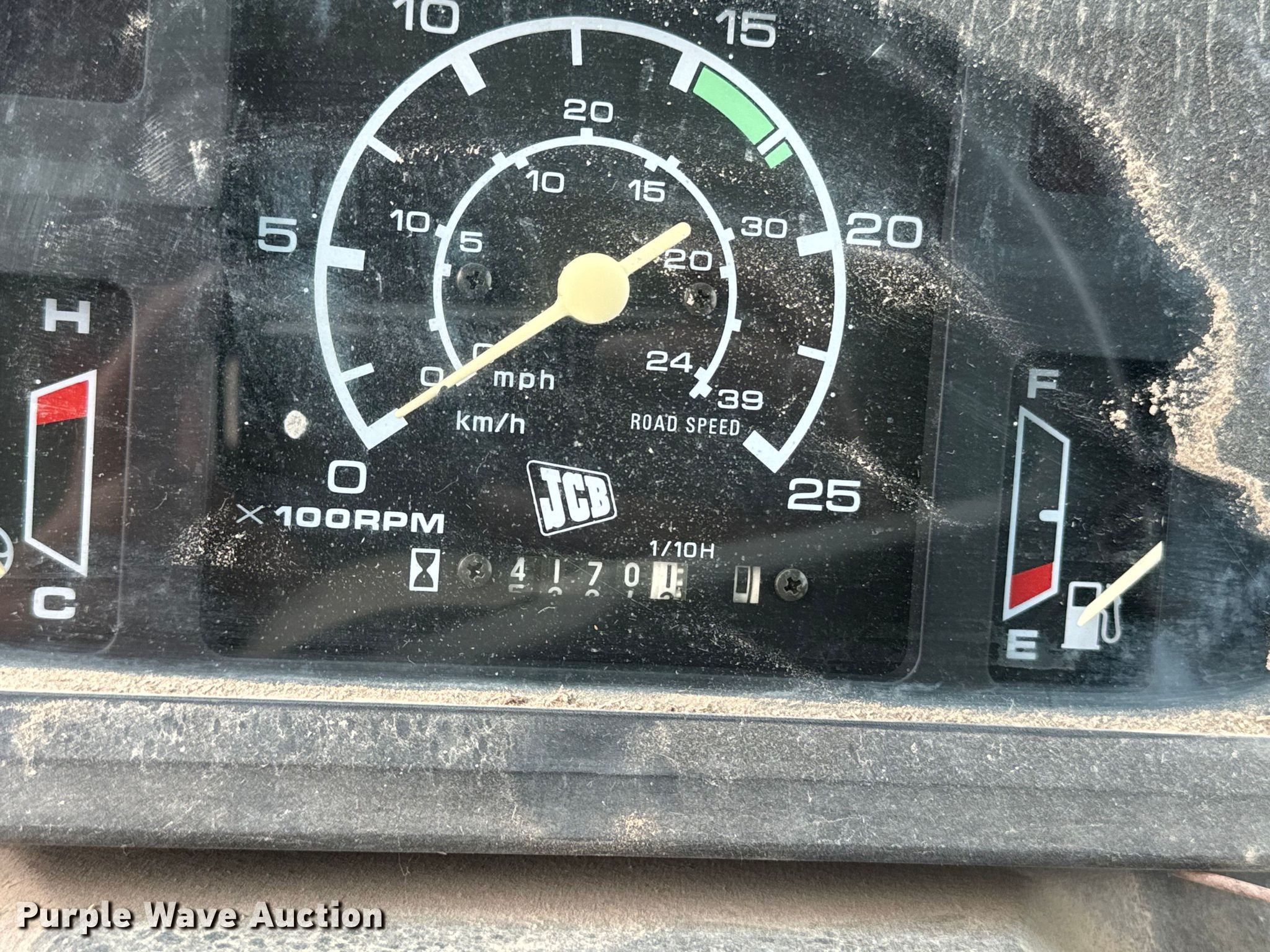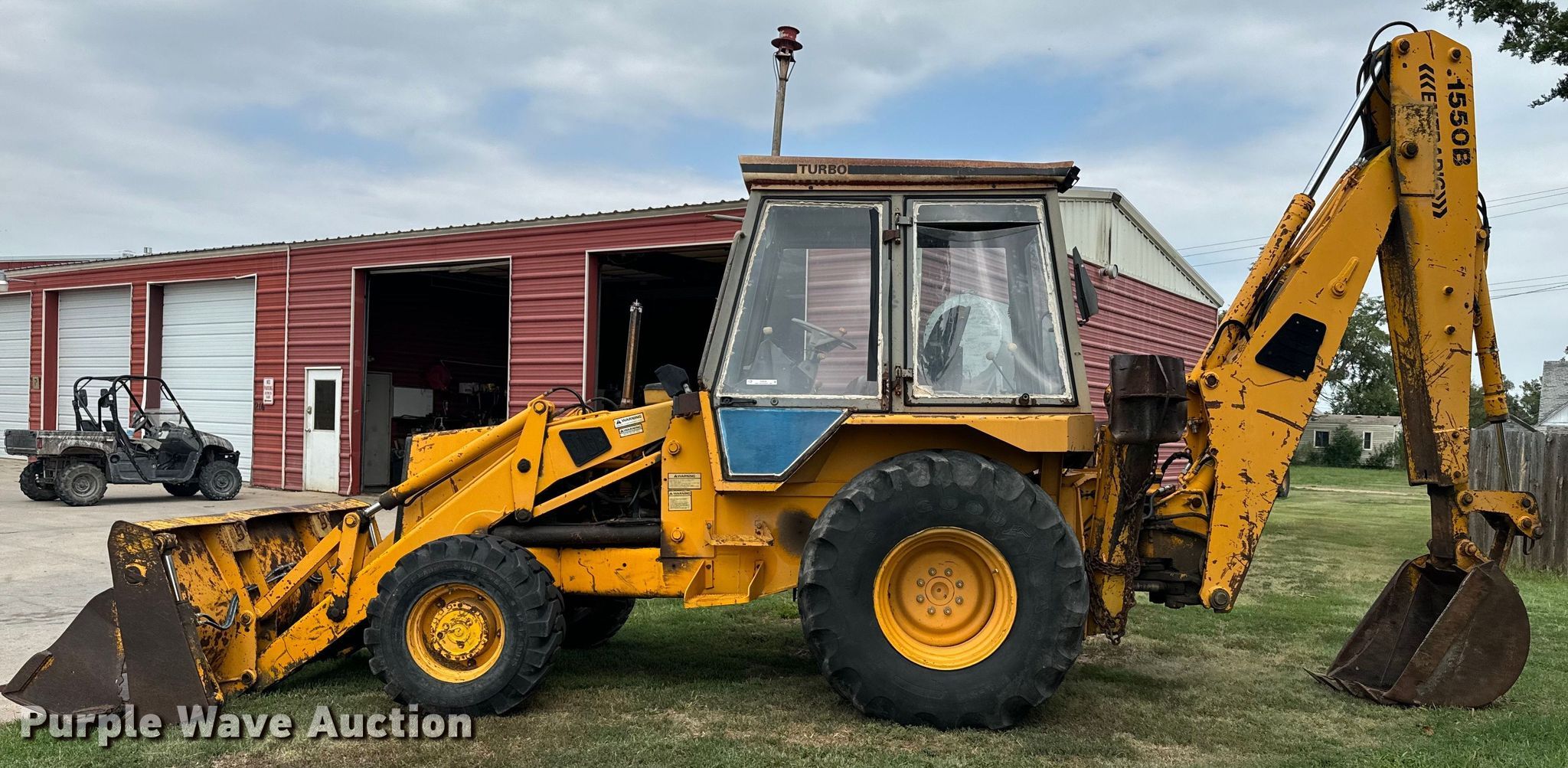 1988 JCB 1550B backhoe. Hours: 4,170 on meter, Serial: 15BT4049/346617/7. Engine Perkins, Cylinders: 4, Fuel type: Diesel. Transmission Shuttle shift, 4F - 4R. Chassis Four wheel drive. Operators station Enclosed cab, Backhoe controls: Wobble stick / two stick. Features Loader Bucket Four-in-one, Width: 96", Teeth: 9, Backhoe Extendable stick, Bucket Width: 24", Teeth: 4.. Tires Front: 14-17.5, Rear: 21L-24. Notes Door hinge broken, Hydraulic oil leak. Agra, KS 67621