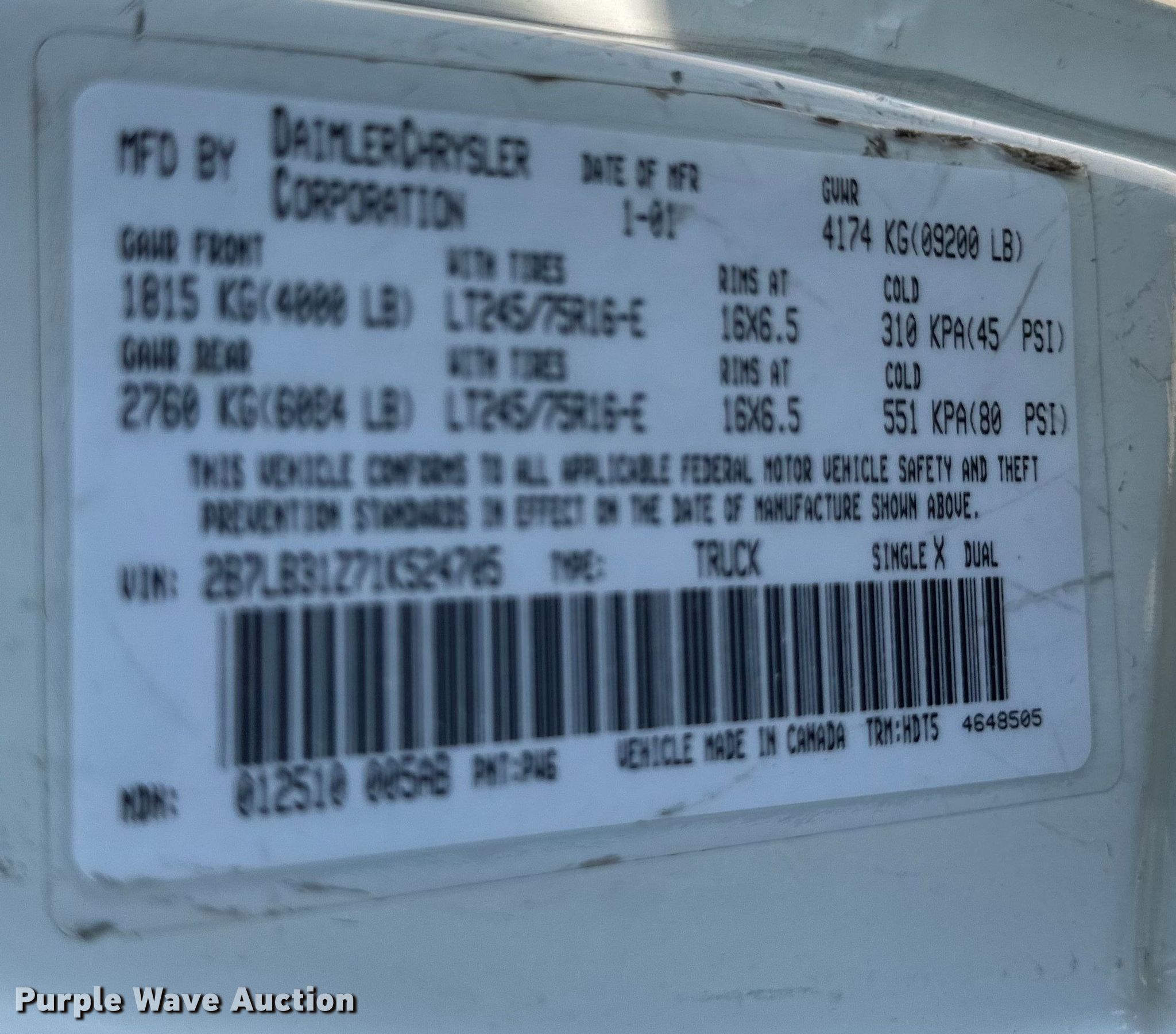 2001 Dodge Ram 3500 van. Miles: 25,784 on odometer, VIN: 2B7LB31Z71K524705. Engine Displacement: 5.9L V8 OHV, Cylinders: 8, Fuel type: Gas. Transmission Automatic. Interior AC, Heat, Power windows, Power locks. Tires Size: 245/75R16. Missouri title. Title distribution may be delayed up to 14 days from verification of funds. City of North Kansas City. North Kansas City, MO 64116