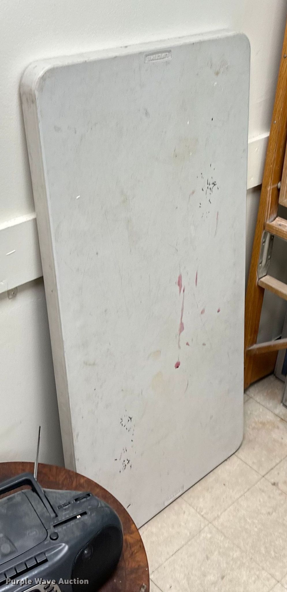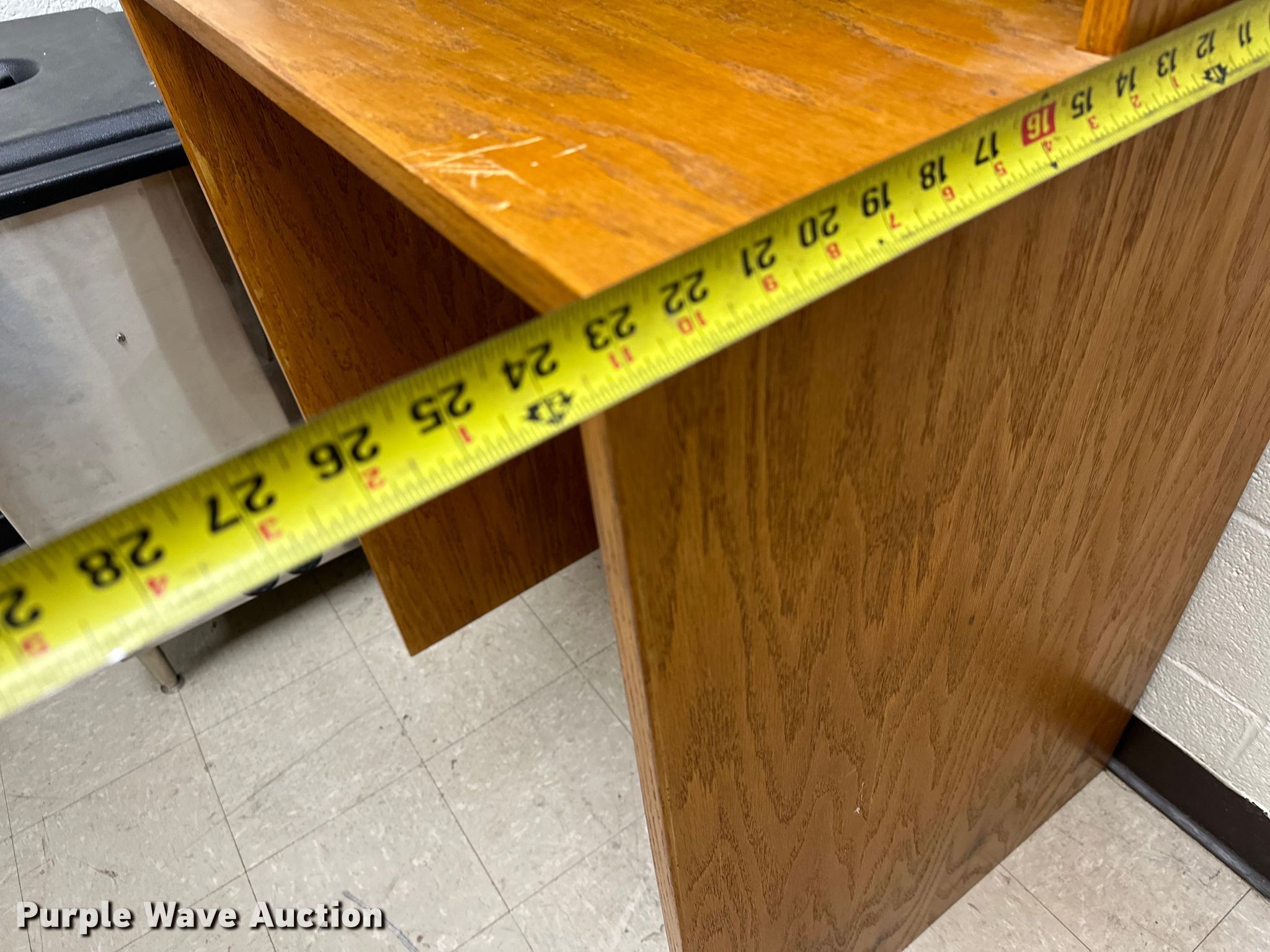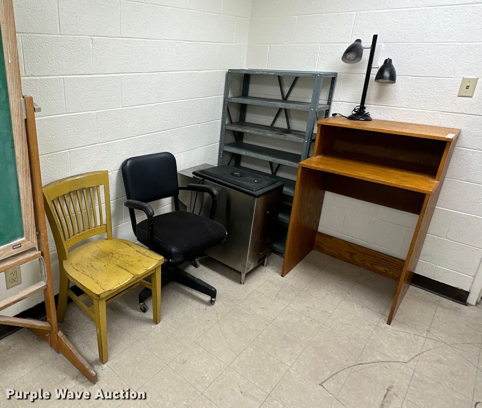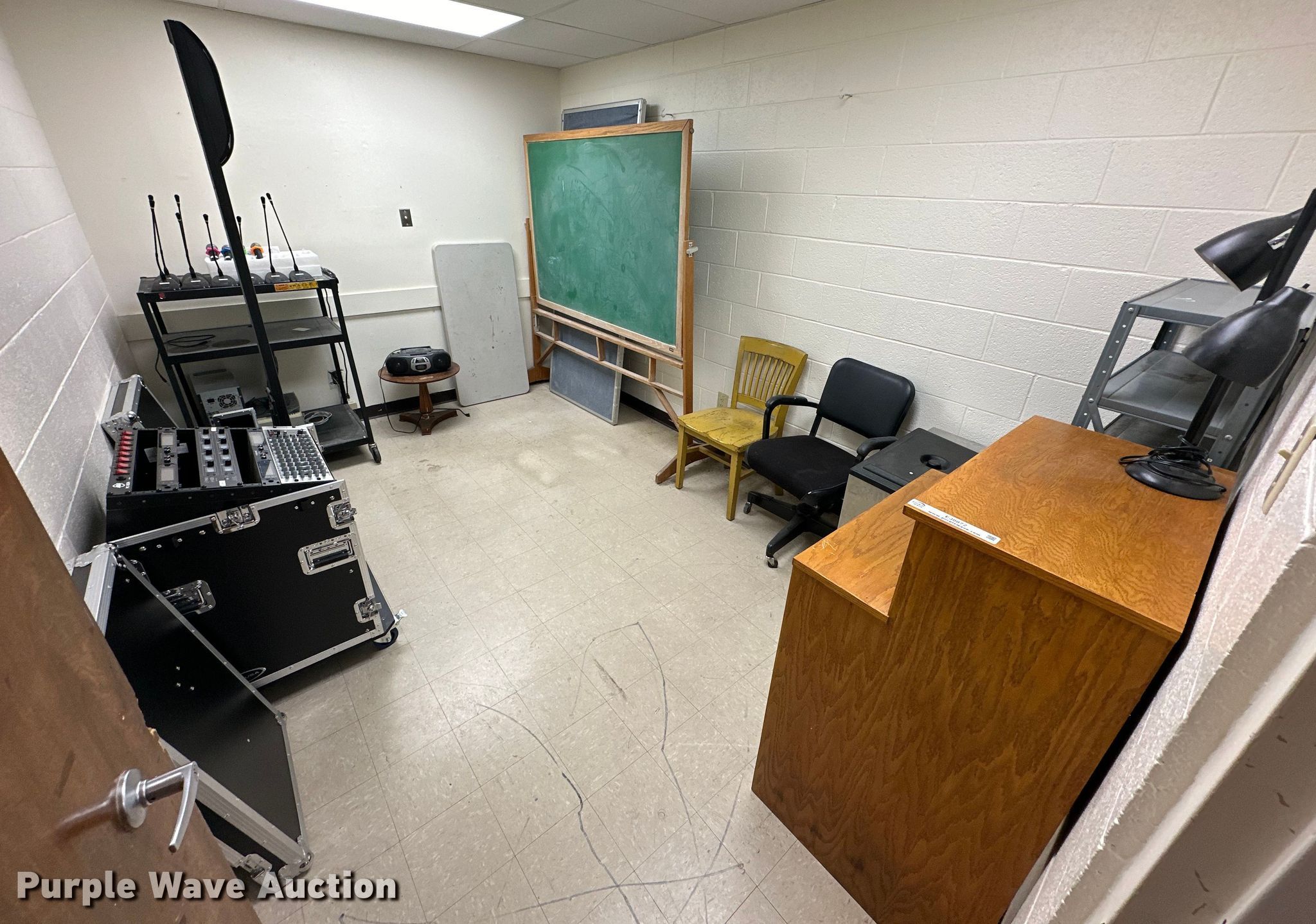 Electronics. (2) Phenyx Pro PTU-5000 microphones, Beringer EuroRack Pro RX 1202FX mixer, Pyle PDWM 8880 wireless receiver, ADJ PC-100A microphone control, (8) Pyle PDWM 8880 conference microphones, (4) microphones, JBL sound system, Ice cream maker, Radio, Desk, Lamp, Cabinet, (2) chairs, Chalk board, (2) pin boards, (2) tables. Notes Unknown operating condition. Stilwell, OK 74960