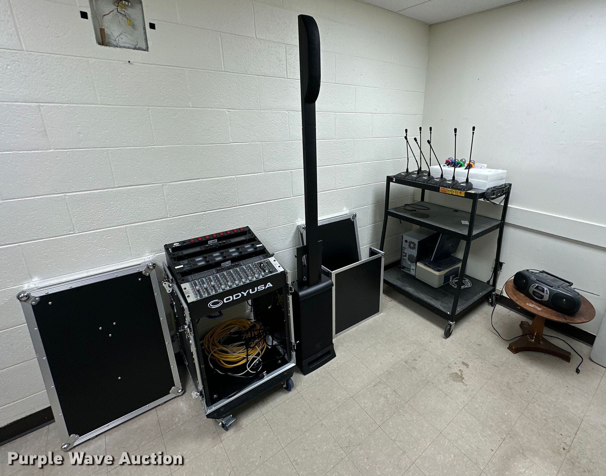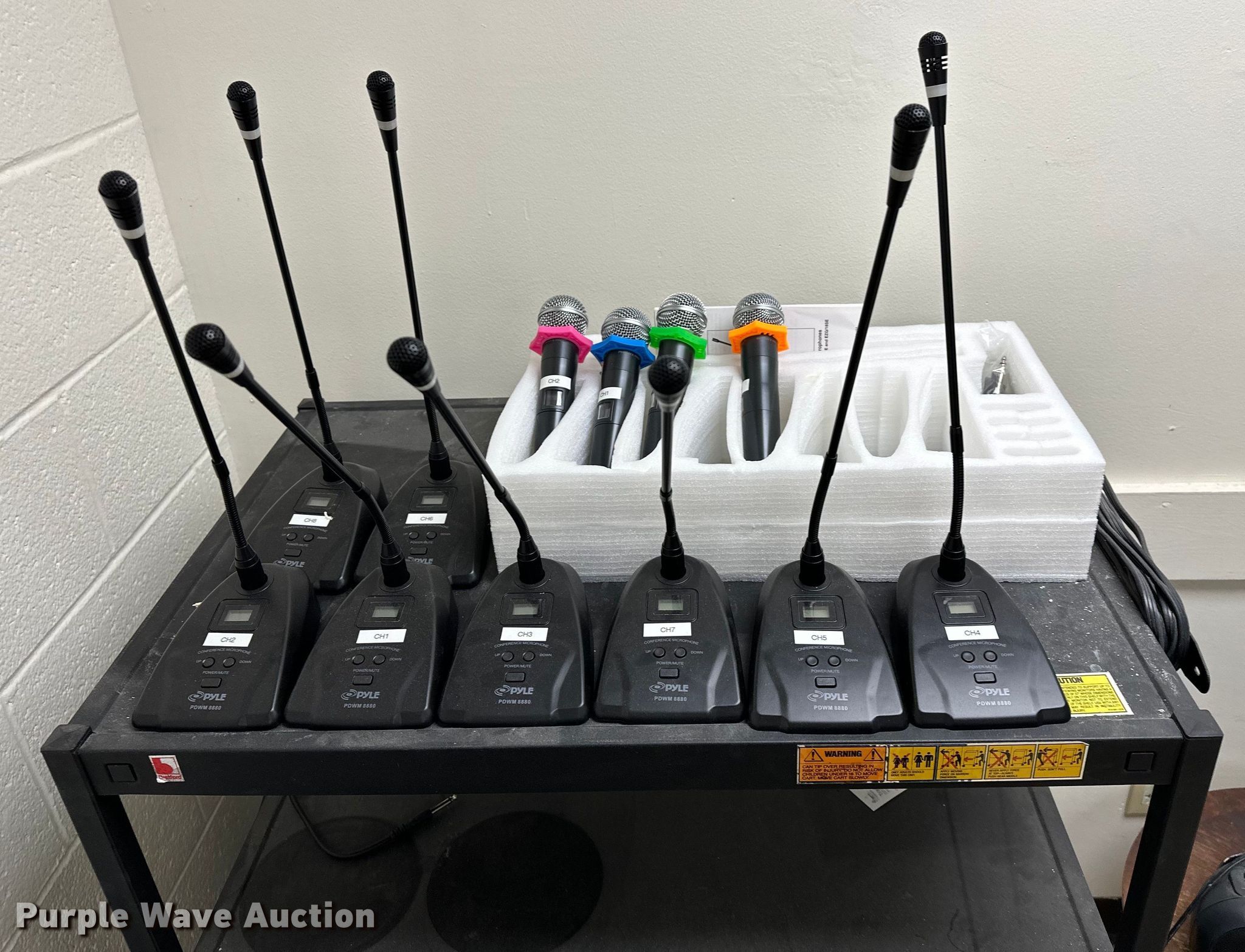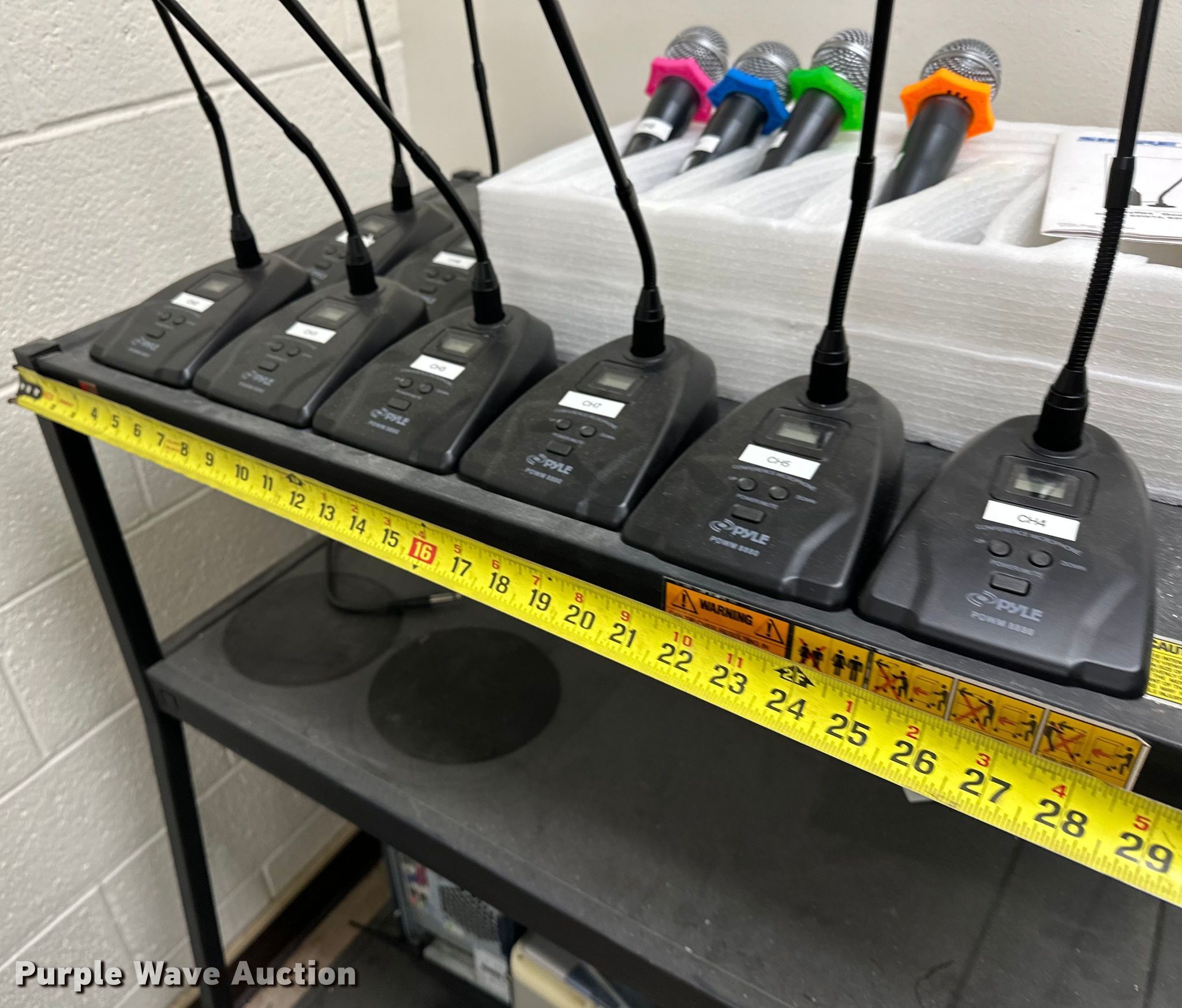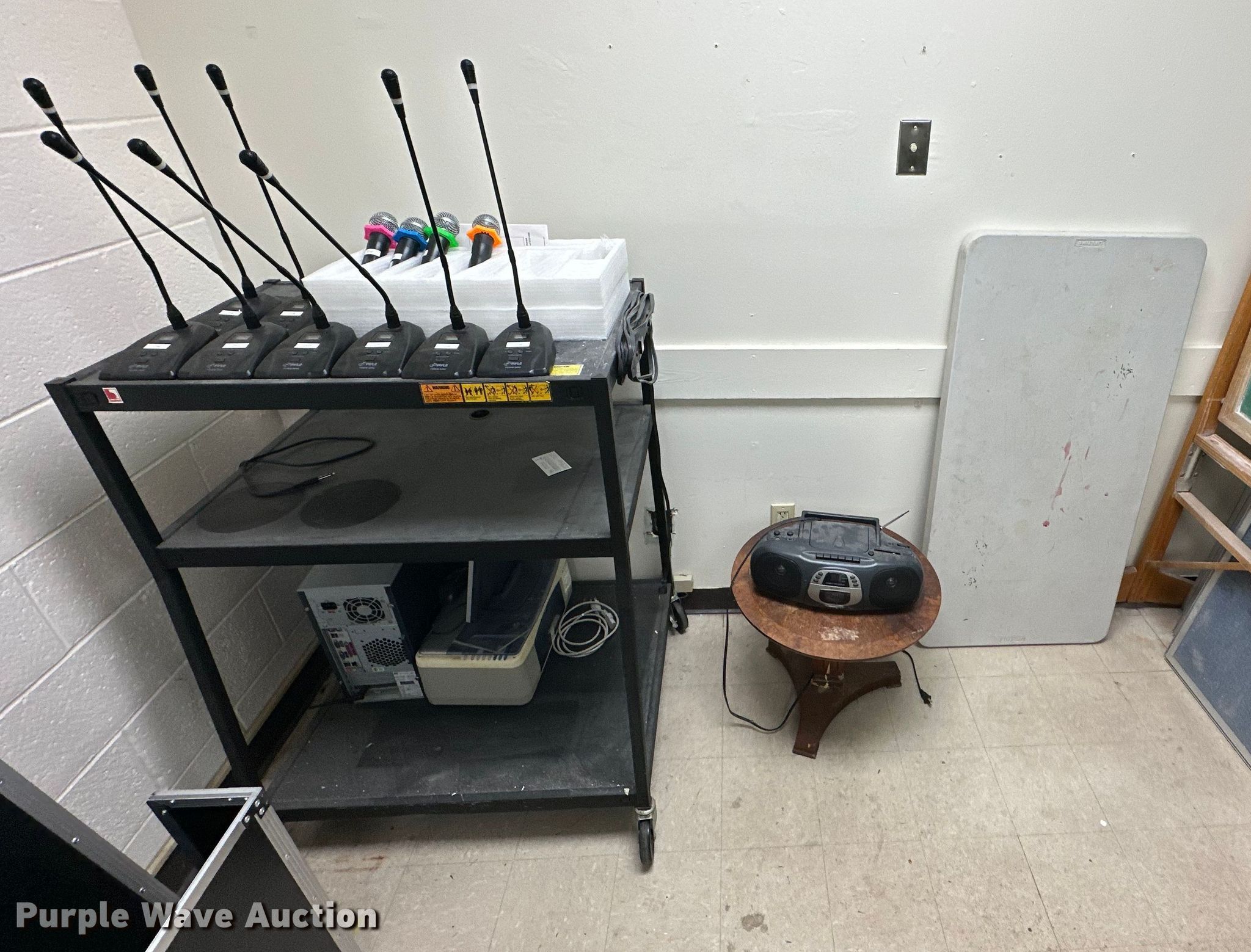 Purple Wave is selling a used Electronics in Oklahoma. This item is a Electronics with the following: (2) Phenyx Pro PTU-5000 microphones, Beringer EuroRack Pro RX 1202FX mixer, Pyle PDWM 8880 wireless receiver, ADJ PC-100A microphone control, (8) Pyle PDWM 8880 conference microphones, (4) microphones, JBL sound system, Ice cream maker, Radio, Desk, Lamp, Cabinet, (2) chairs, Chalk board, (2) pin boards, (2) tables