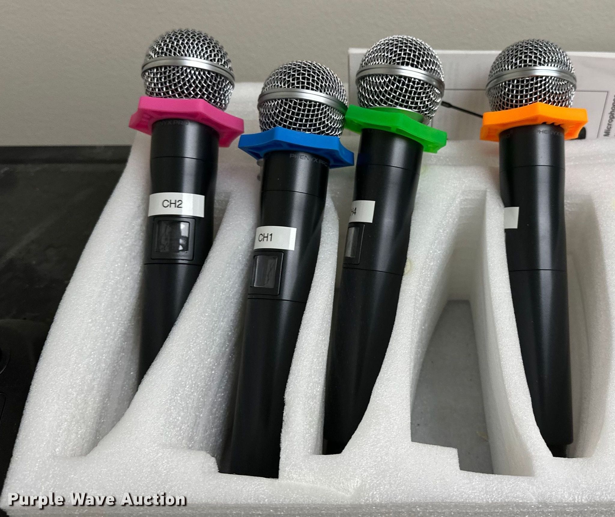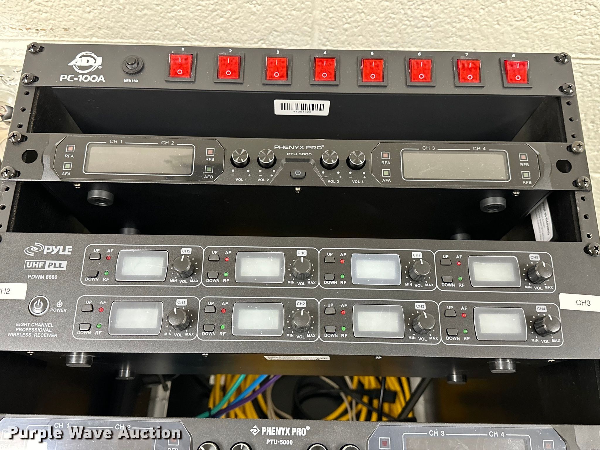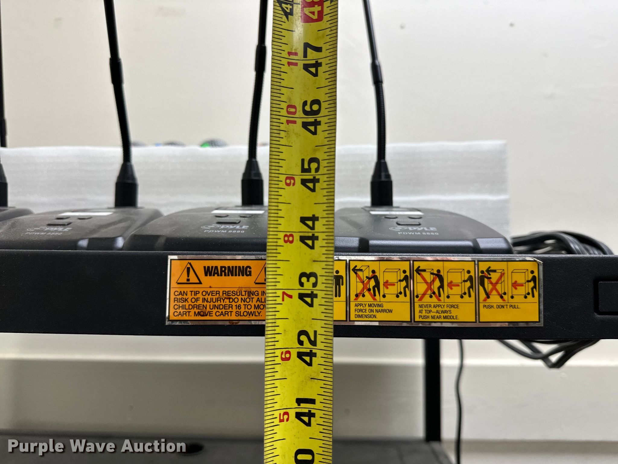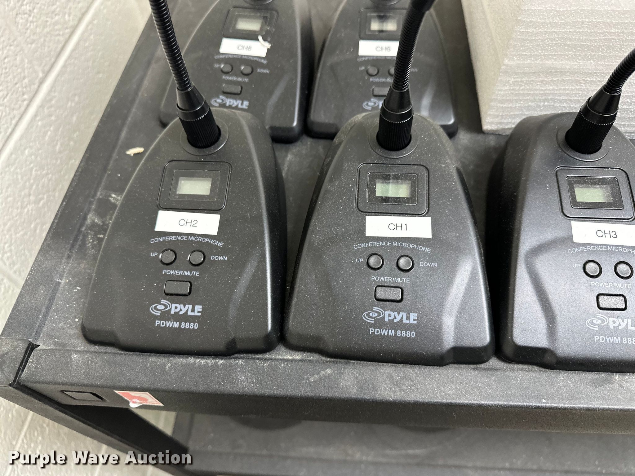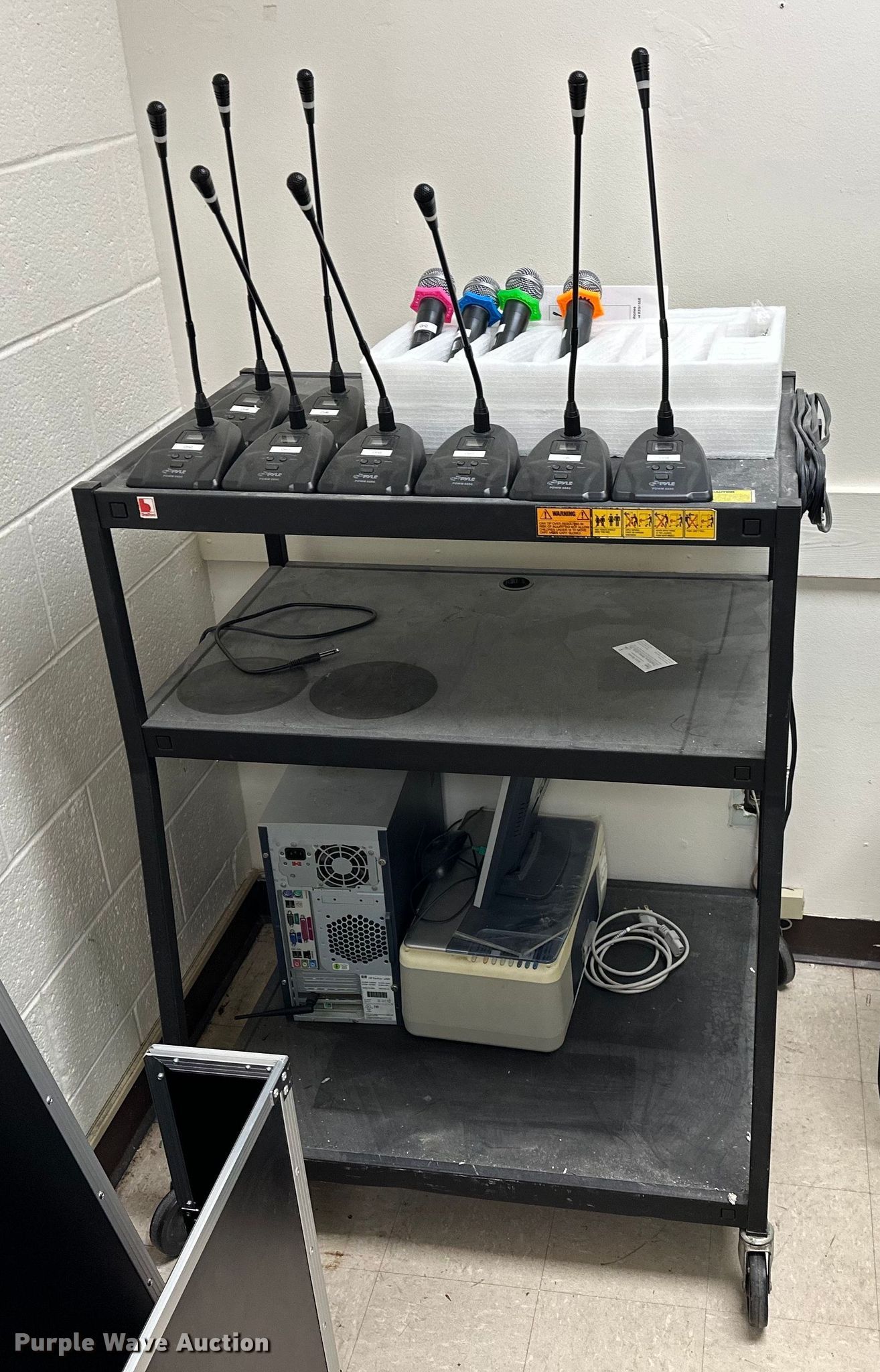 Purple Wave is selling a used Electronics in Oklahoma. This item is a Electronics with the following: (2) Phenyx Pro PTU-5000 microphones, Beringer EuroRack Pro RX 1202FX mixer, Pyle PDWM 8880 wireless receiver, ADJ PC-100A microphone control, (8) Pyle PDWM 8880 conference microphones, (4) microphones, JBL sound system, Ice cream maker, Radio, Desk, Lamp, Cabinet, (2) chairs, Chalk board, (2) pin boards, (2) tables