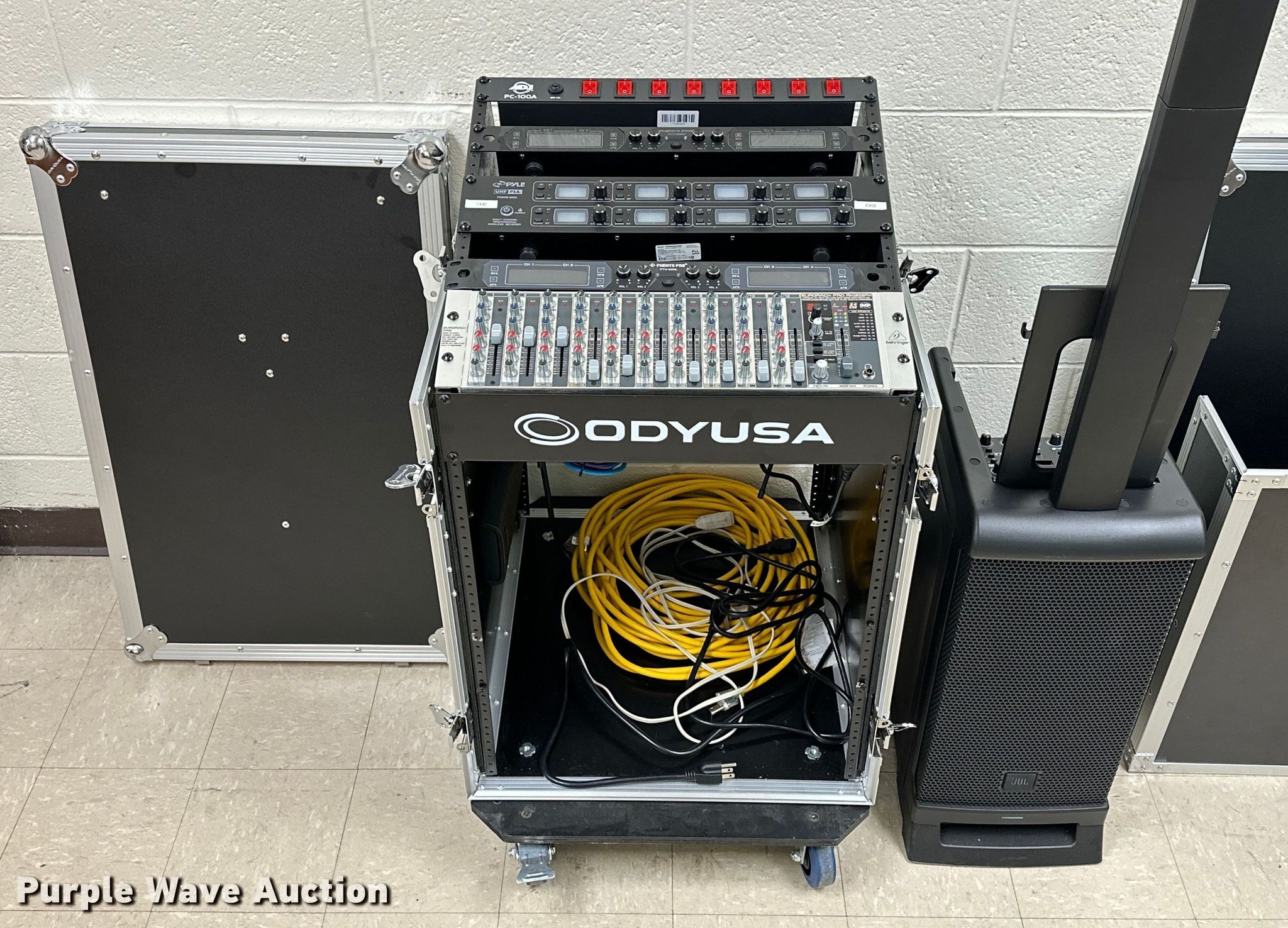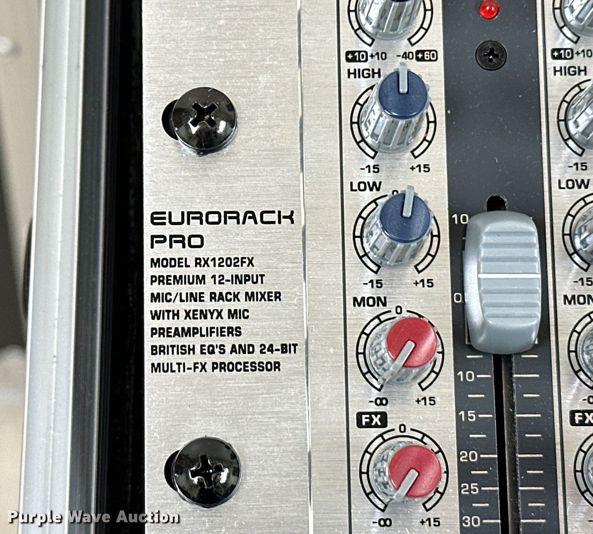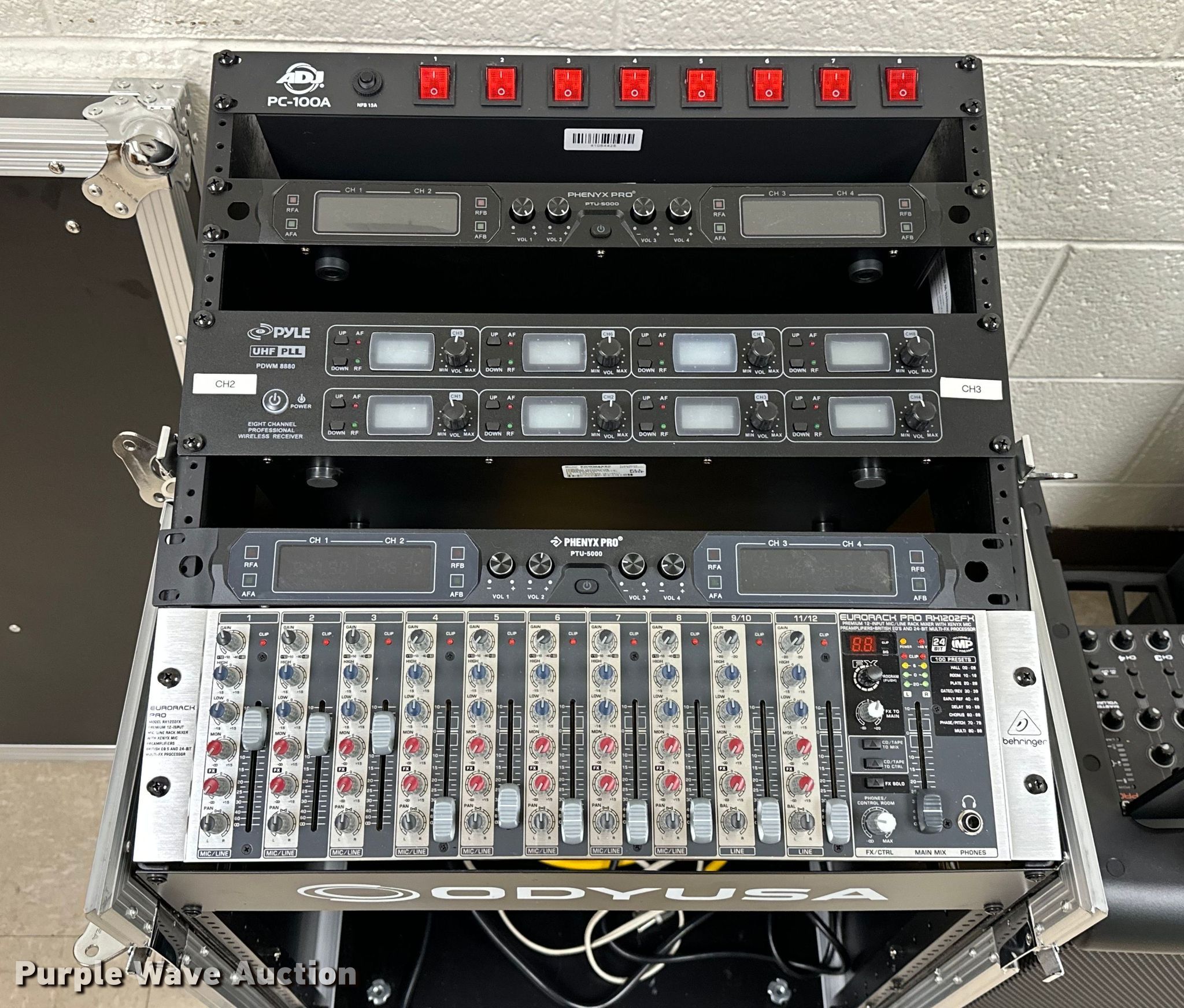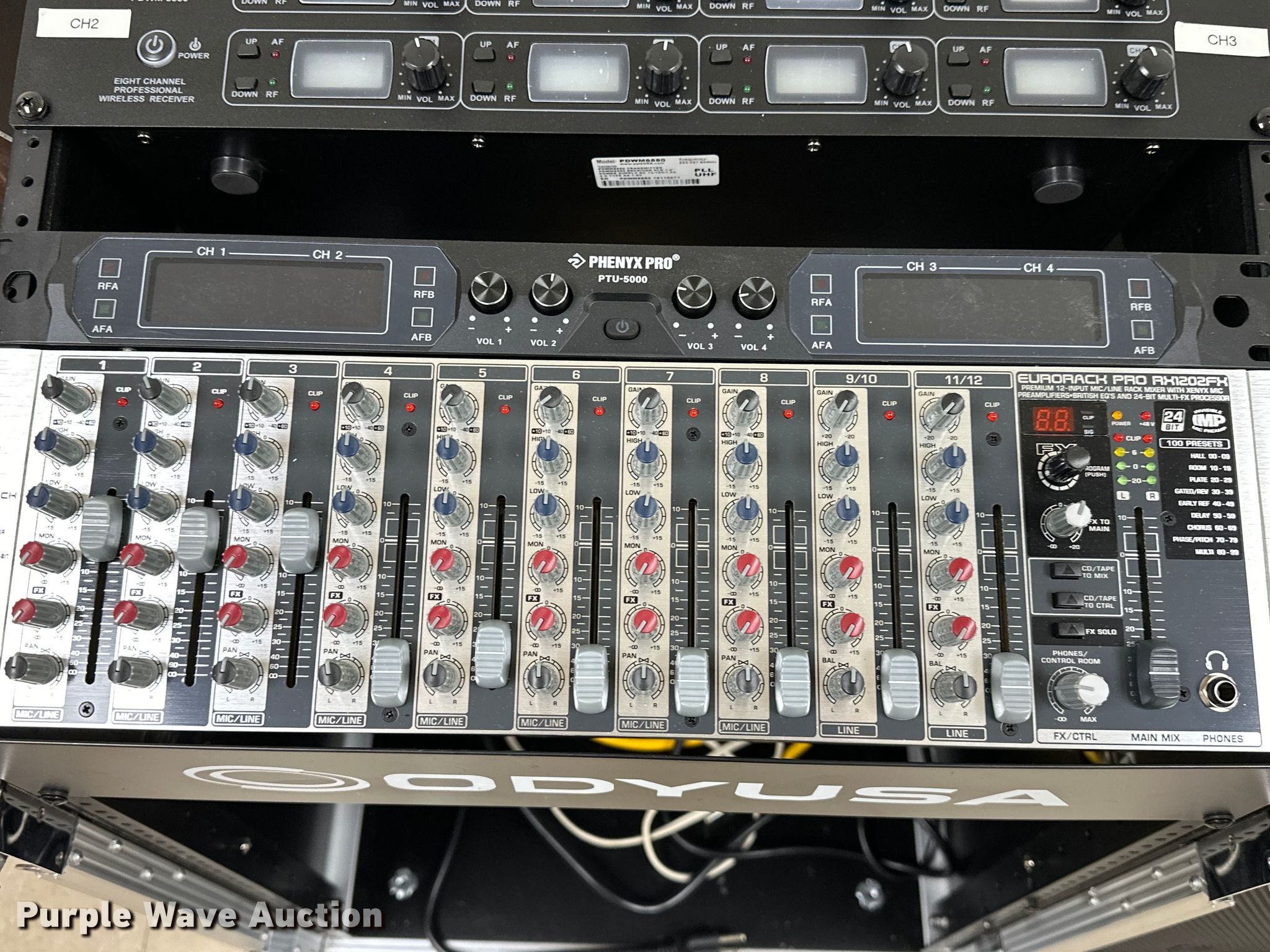 Purple Wave is selling a used Electronics in Oklahoma. This item is a Electronics with the following: (2) Phenyx Pro PTU-5000 microphones, Beringer EuroRack Pro RX 1202FX mixer, Pyle PDWM 8880 wireless receiver, ADJ PC-100A microphone control, (8) Pyle PDWM 8880 conference microphones, (4) microphones, JBL sound system, Ice cream maker, Radio, Desk, Lamp, Cabinet, (2) chairs, Chalk board, (2) pin boards, (2) tables