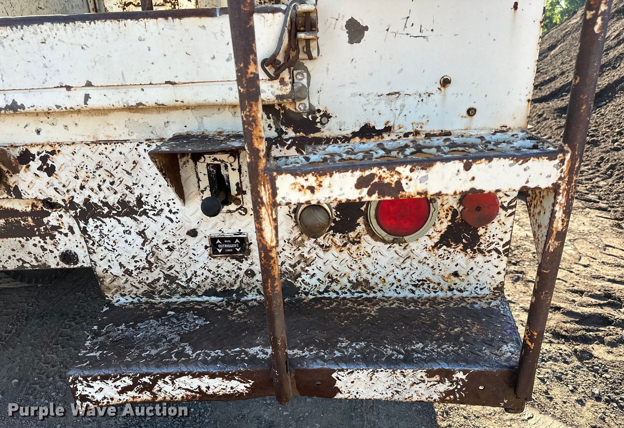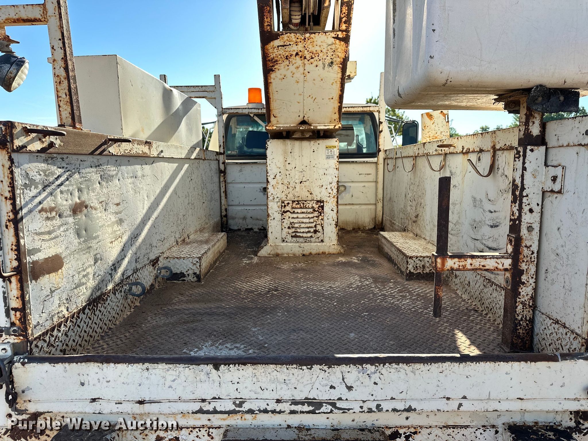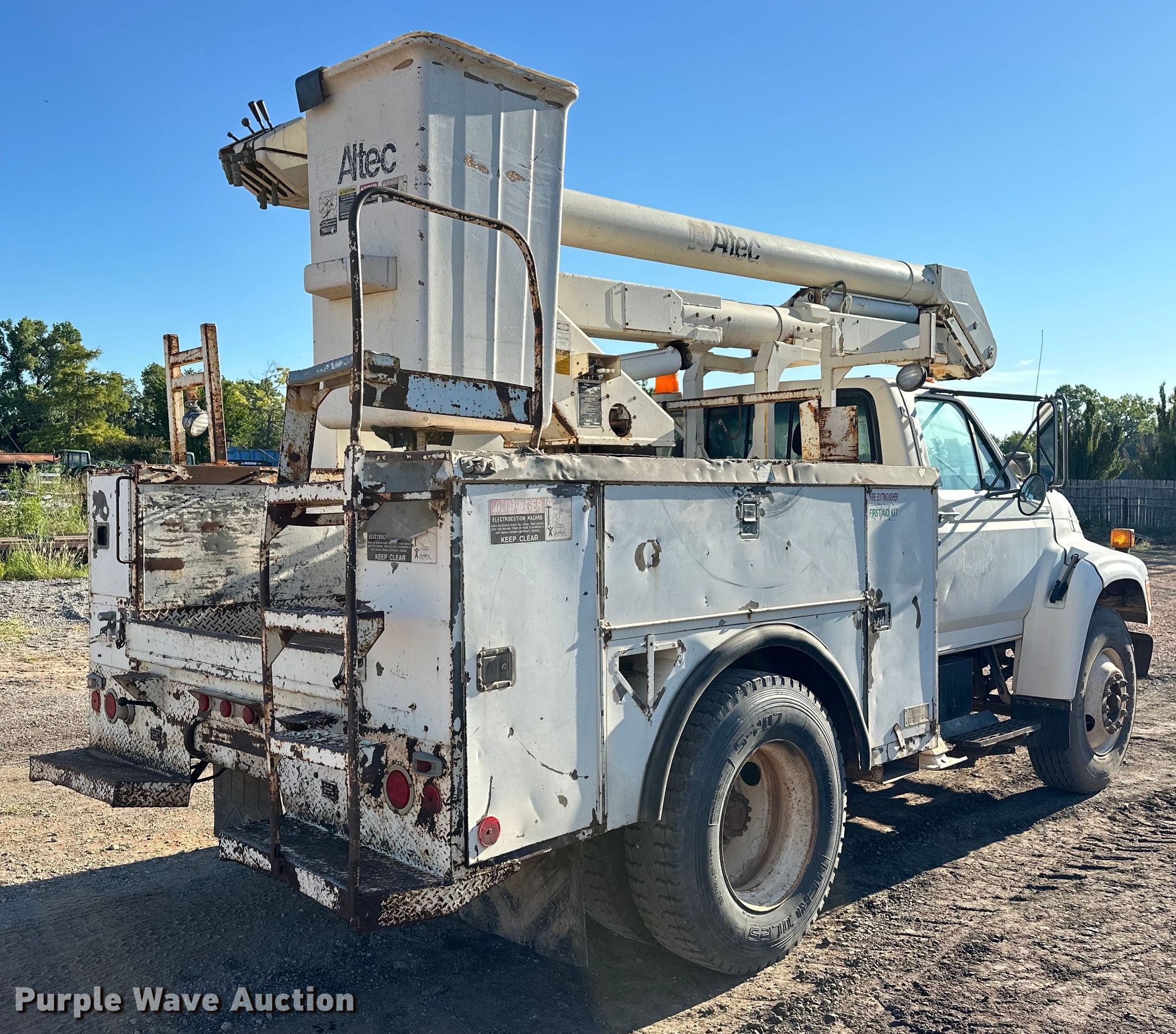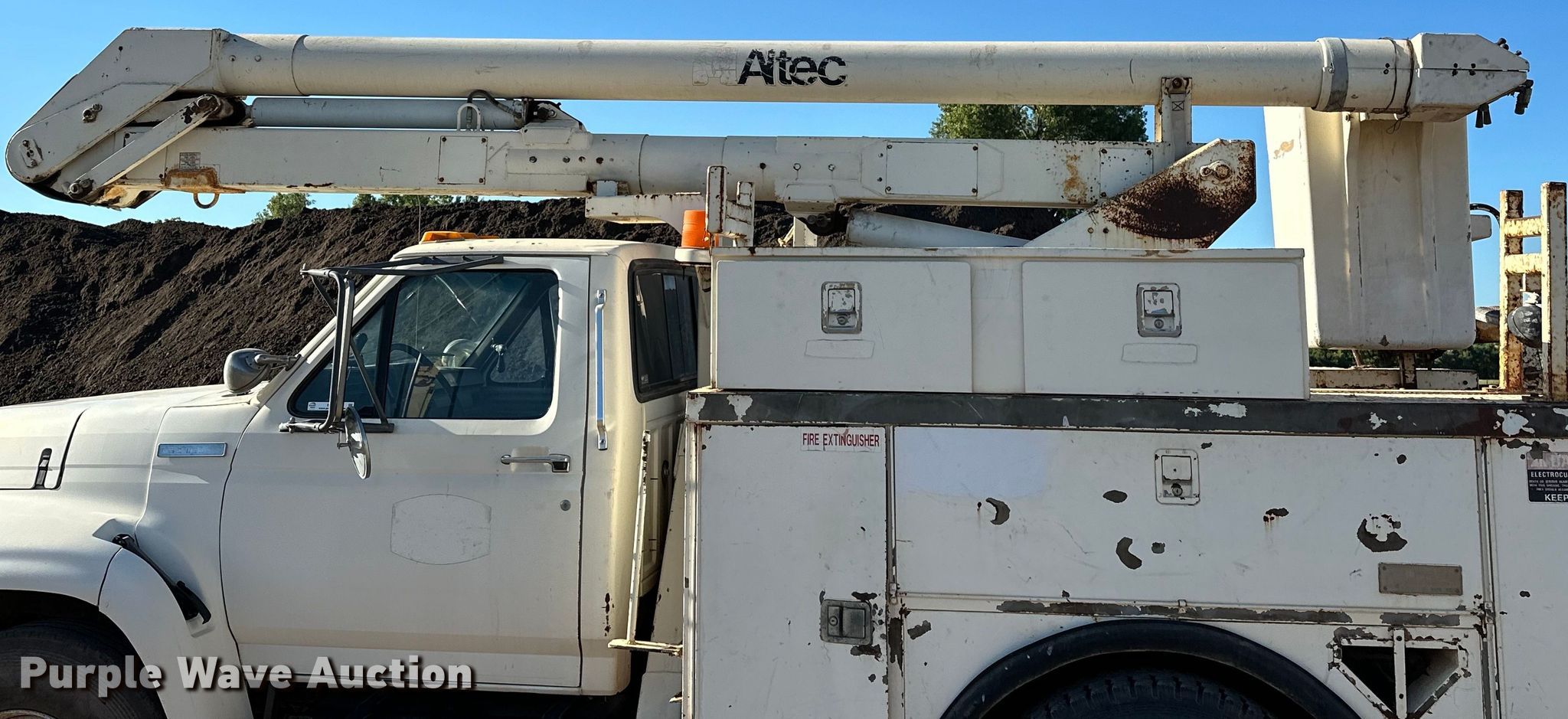 1997 Ford F800 bucket truck. Miles: 211,191 on odometer, VIN: 1FDNF80C2VVA10077. Engine Displacement: 5.9L, Cylinders: 6, Fuel type: Diesel. Transmission Manual, Speed: 5. Chassis Axles: Single, Suspension: Spring, Brakes: Hydraulic, PTO, Wet kit, GVWR: 26,000 lbs. Interior AC, Heat. Features Bed Altec, Serial: 37-61740, 8' 10" L x 93" W, Boom 1987 Altec AO-300, Serial: 1087-P0619, Mast height: 36', Maximum lift capacity: 300 lbs, Boom type: Articulating, Insulated, Man basket, Boom controls Ground, Platform/ basket.. Tires Size: 11R22.5. Oklahoma classic title. McClain County. Blanchard, OK 73010