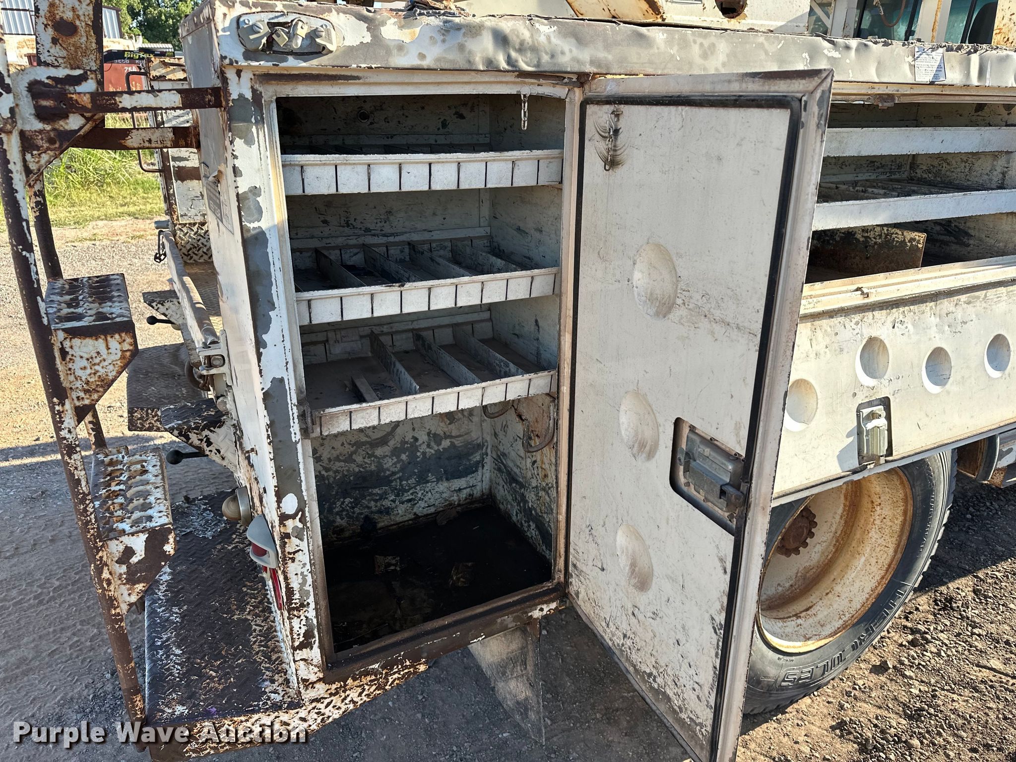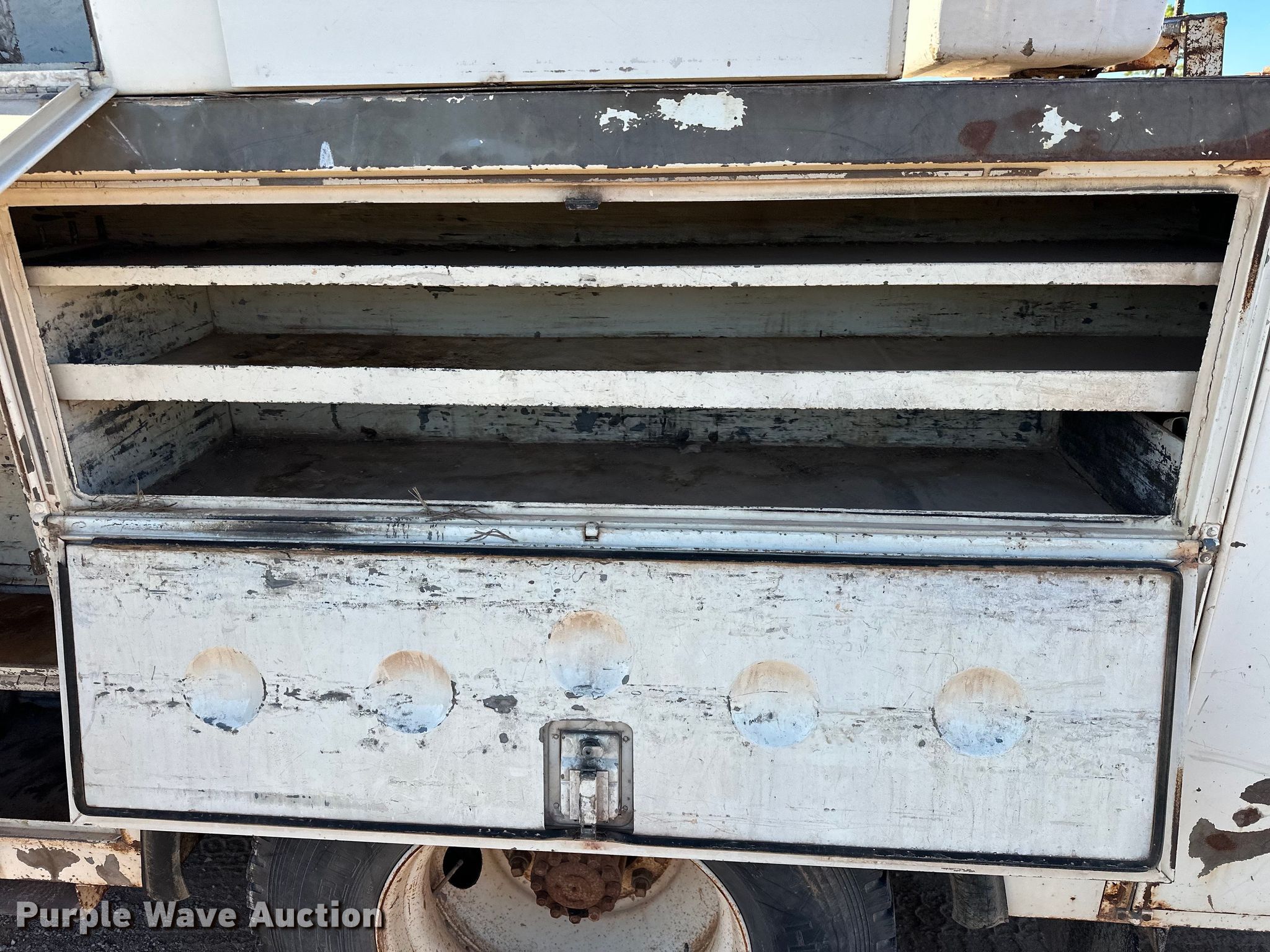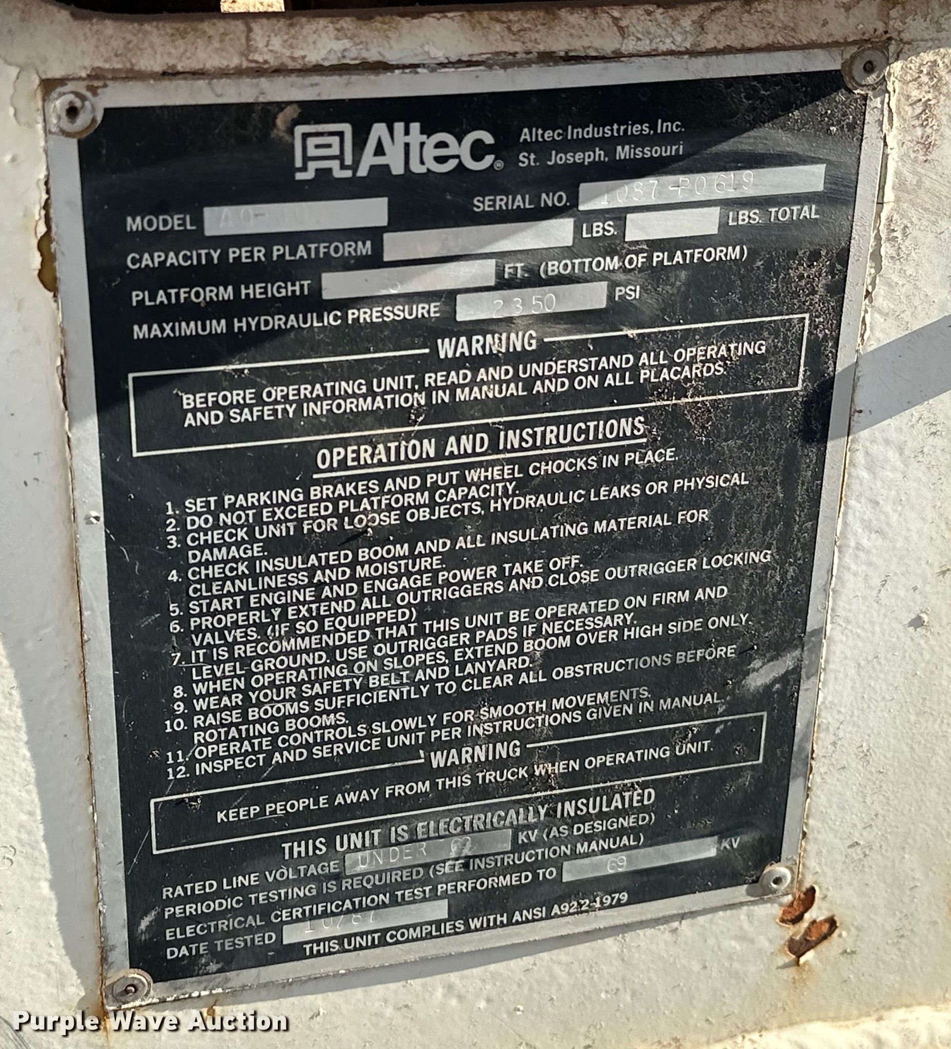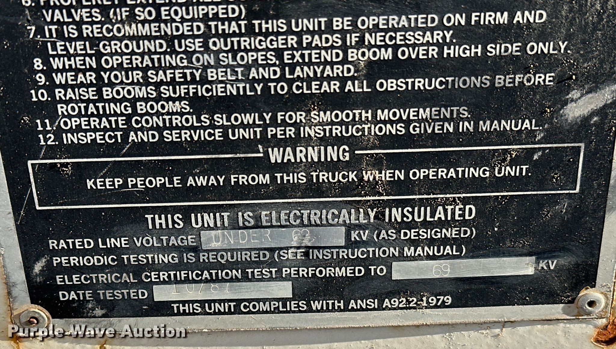 1997 Ford F800 bucket truck. Miles: 211,191 on odometer, VIN: 1FDNF80C2VVA10077. Engine Displacement: 5.9L, Cylinders: 6, Fuel type: Diesel. Transmission Manual, Speed: 5. Chassis Axles: Single, Suspension: Spring, Brakes: Hydraulic, PTO, Wet kit, GVWR: 26,000 lbs. Interior AC, Heat. Features Bed Altec, Serial: 37-61740, 8' 10" L x 93" W, Boom 1987 Altec AO-300, Serial: 1087-P0619, Mast height: 36', Maximum lift capacity: 300 lbs, Boom type: Articulating, Insulated, Man basket, Boom controls Ground, Platform/ basket.. Tires Size: 11R22.5. Oklahoma classic title. McClain County. Blanchard, OK 73010