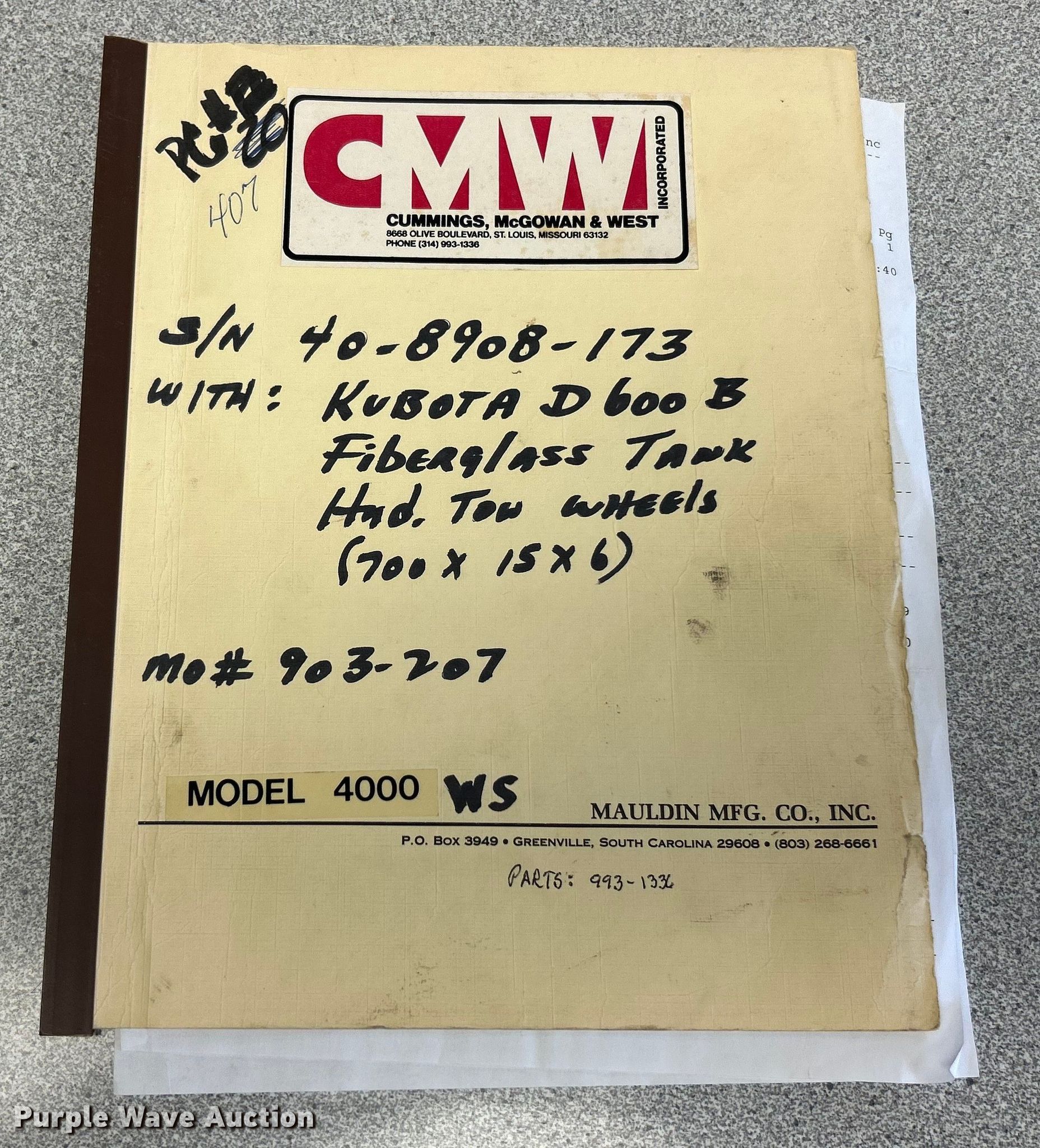 Mauldin 4000WS double drum roller. Hours: 5,425 on meter, Serial: 40-8908-173. Engine Kubota, Cylinders: 3, Fuel type: Diesel. Transmission Hydrostatic. Features Drum: Smooth, Front drum Width: 28", Diameter: 19", Rear drum Width: 34.5", Diameter: 24", Drum scrapers: Front, Rear, Water spray applicator: Front, Extra tires, Tow hitch. Tires Size: 7.50-10. City of Hazelwood, MO. Hazelwood, MO 63042