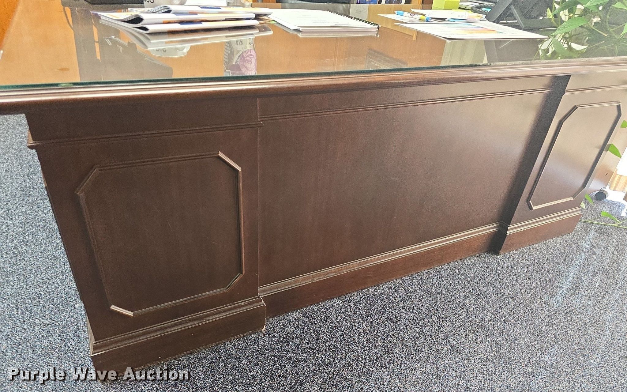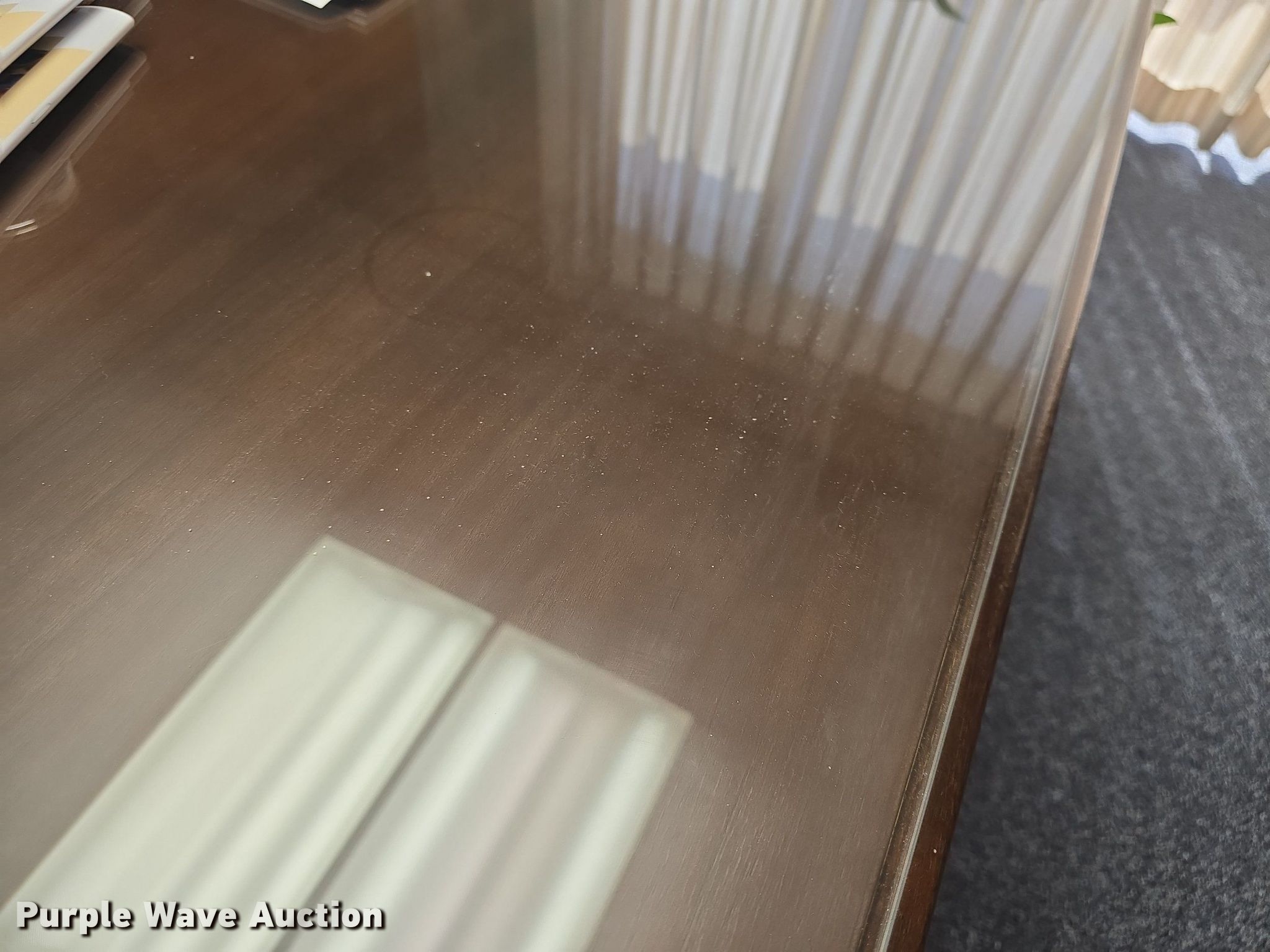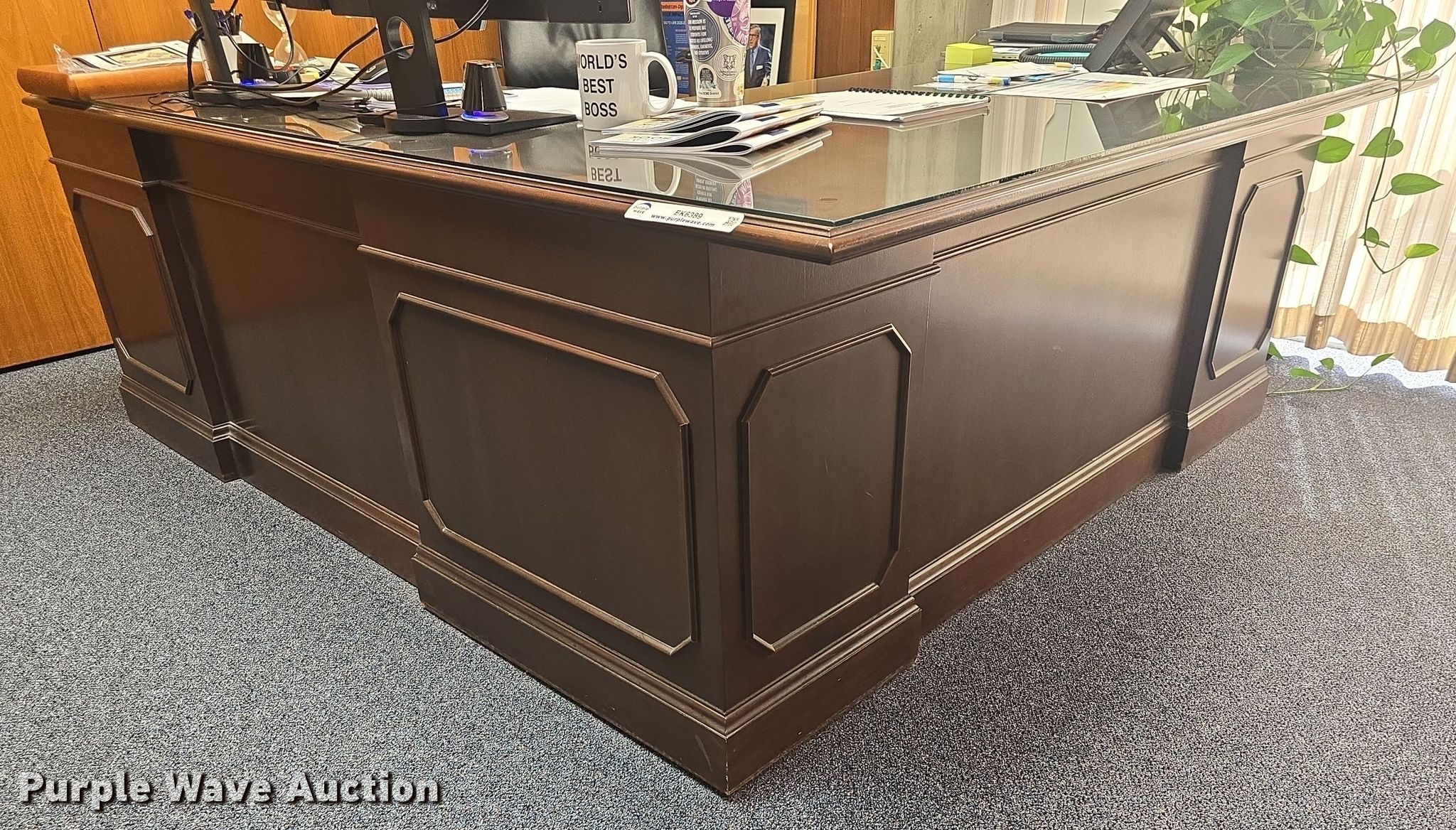 Purple Wave is selling a used Furniture in Kansas. This item is a L-shaped desk with the following: Glass top