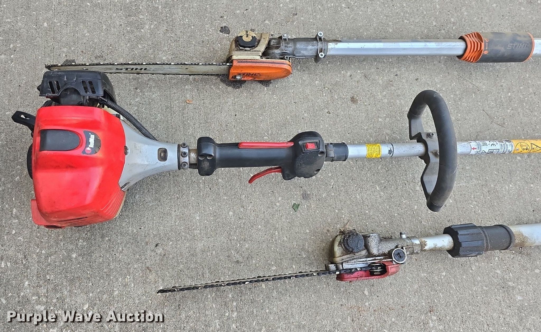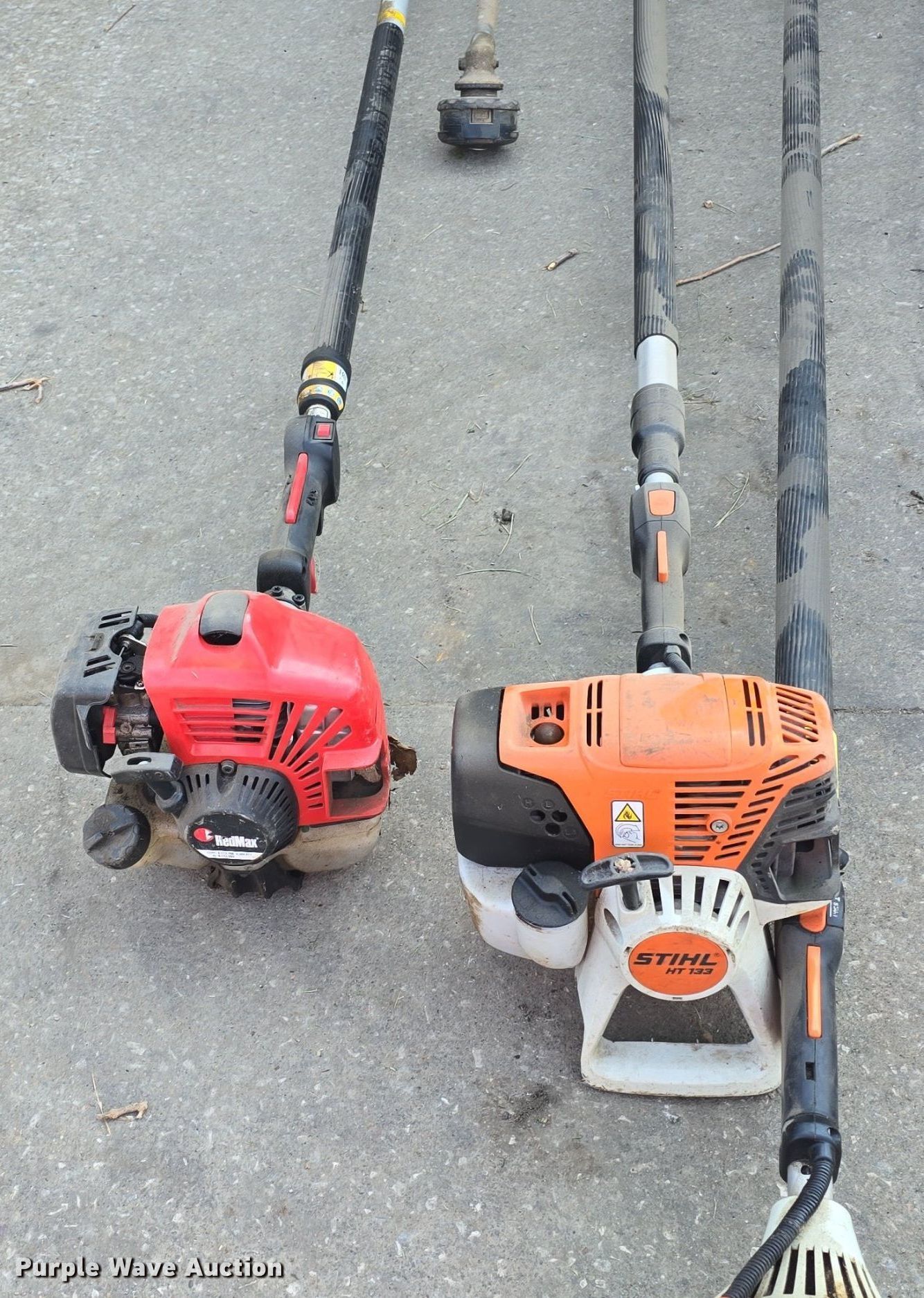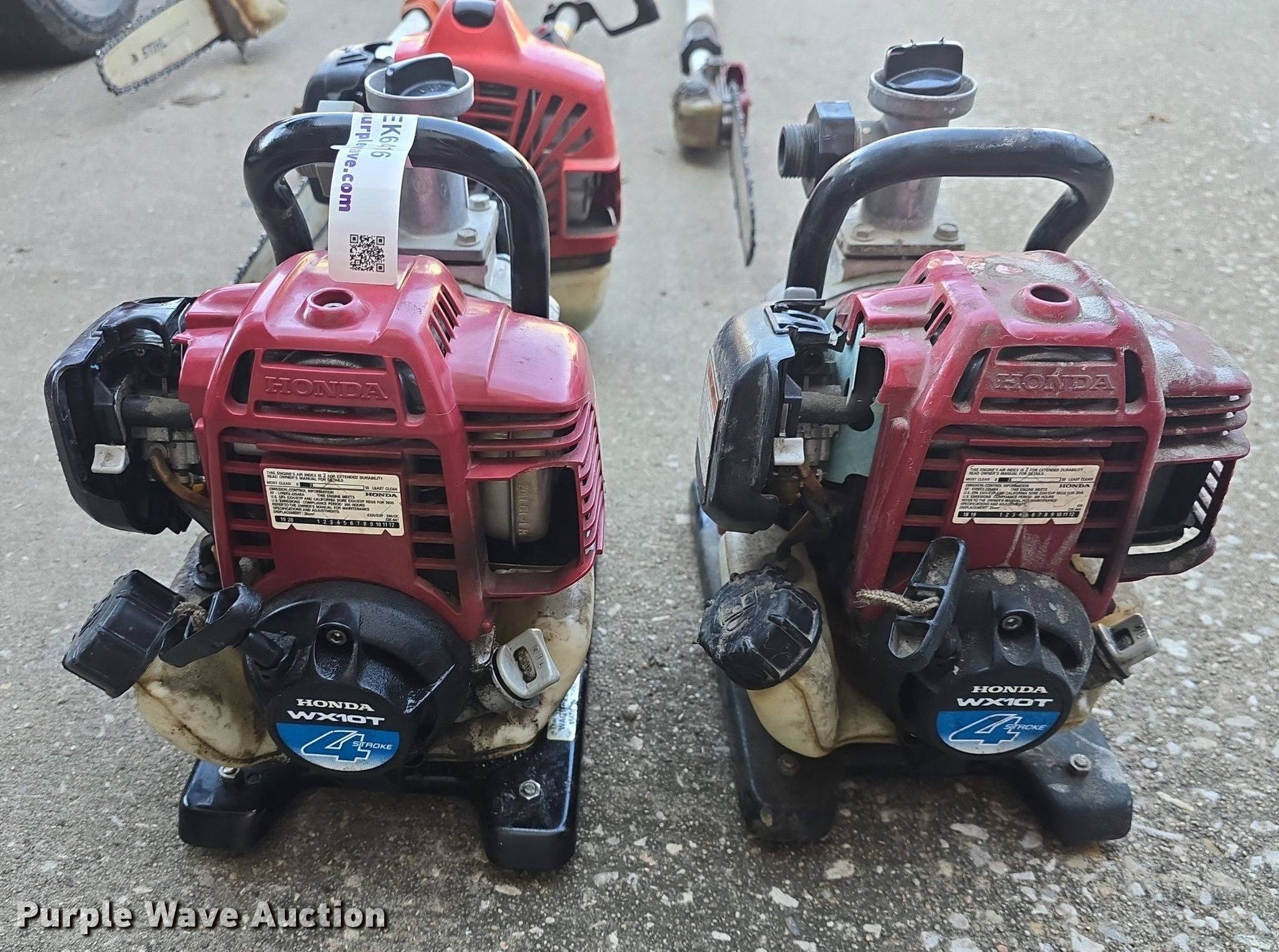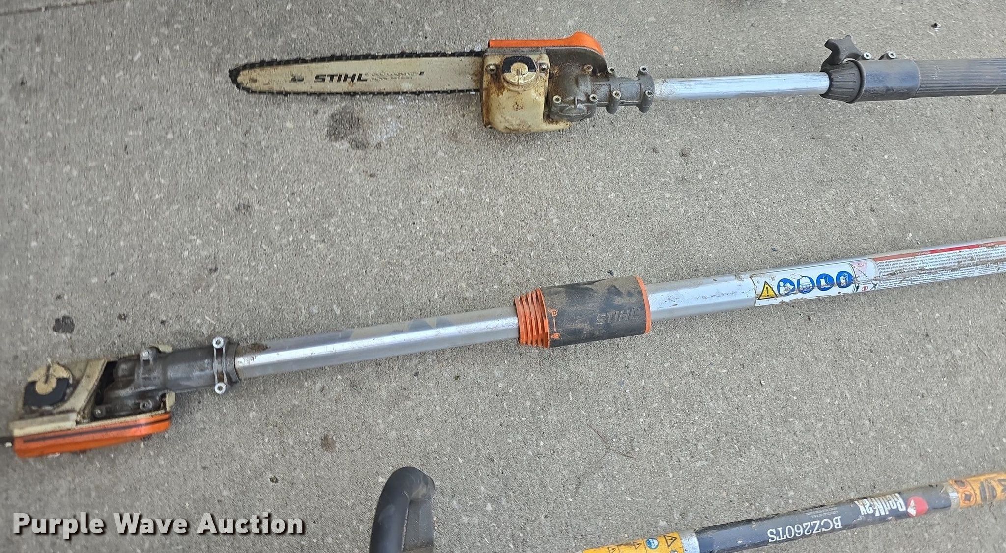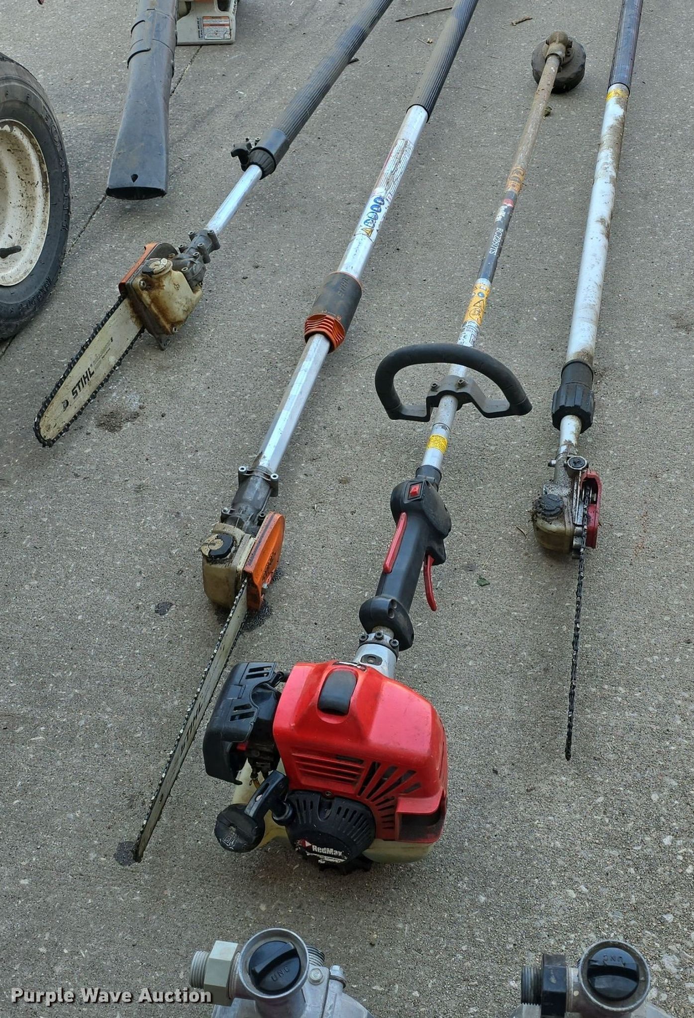 Purple Wave is selling a used Lawn and Garden in Kansas. This item is a Tools with the following: (2) Honda water pumps, (3) pole saws, (2) Stihl, Redmax, Redmax string trimmer, Stihl BG86C blower, Milwaukee metal cutting saw, Non-operational