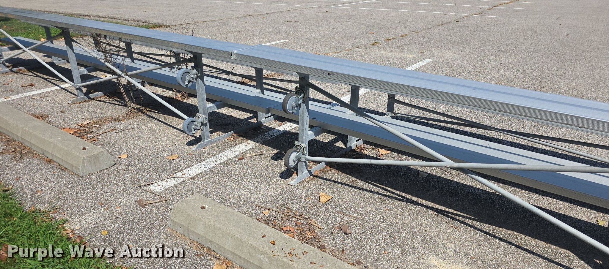 Purple Wave is selling a used Sporting Goods in Kansas. This item is a (7) sections of aluminum bleachers with the following: (3) 15' x 5' x 31", (3) row seats, (4) 15' x 9' x 4', (5) row seats
