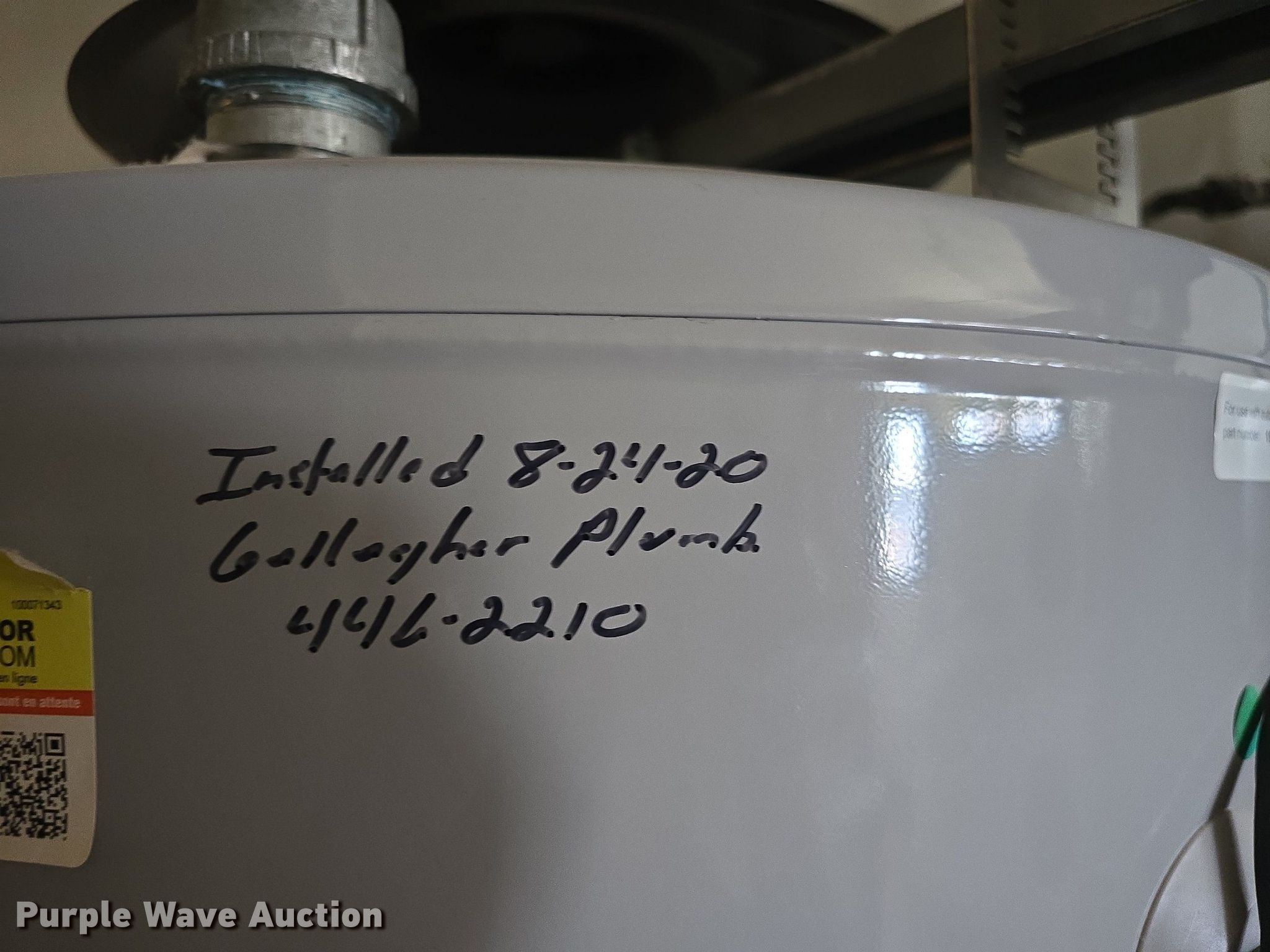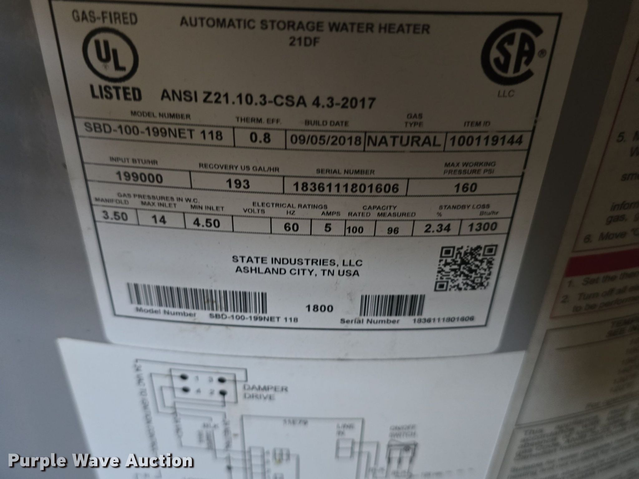 Purple Wave is selling a used Appliances in Kansas. This item is a 2018 State Industries SBD-100-199ZNET 118 hot water heater with the following: Capacity: 100 gallons, Fuel type: Natural gas, Serial: 1836111801606