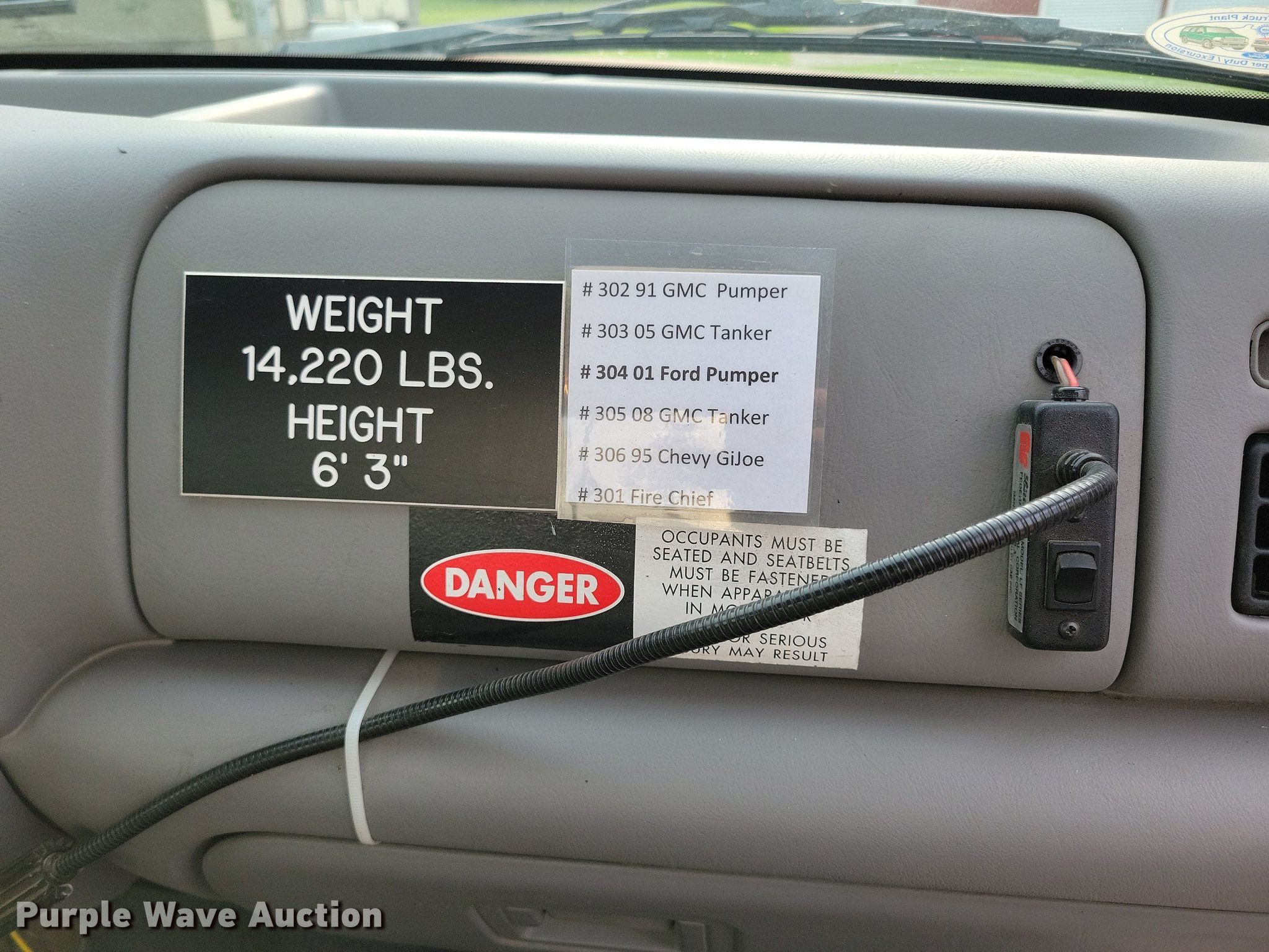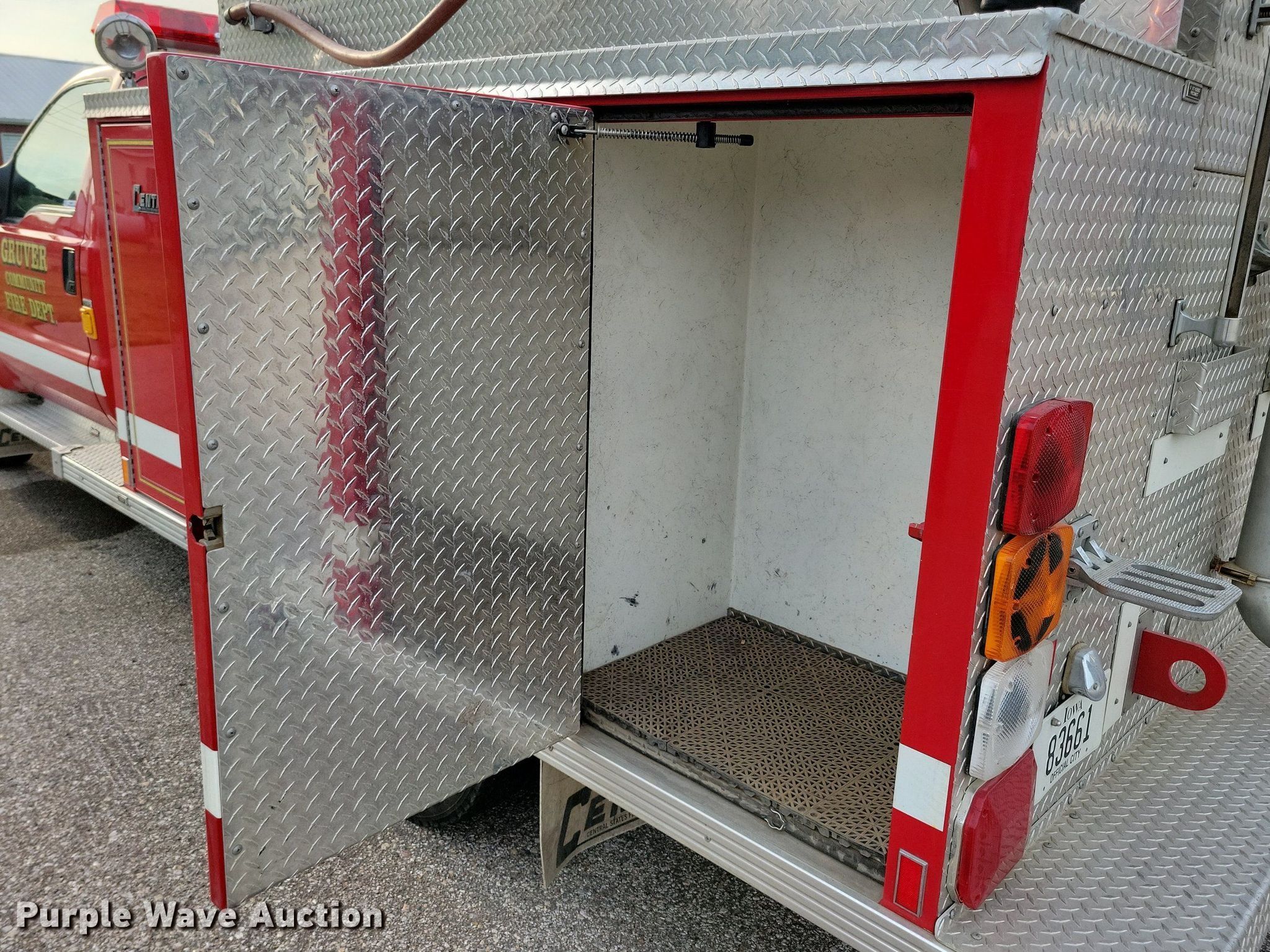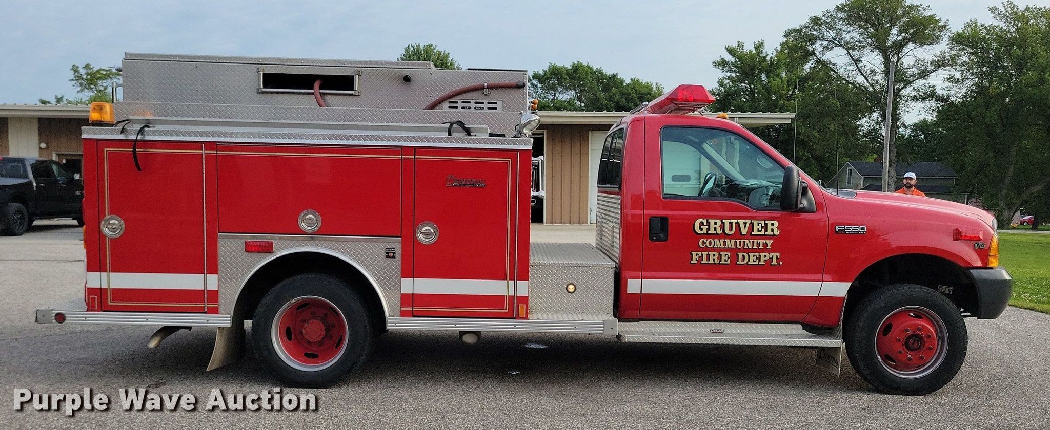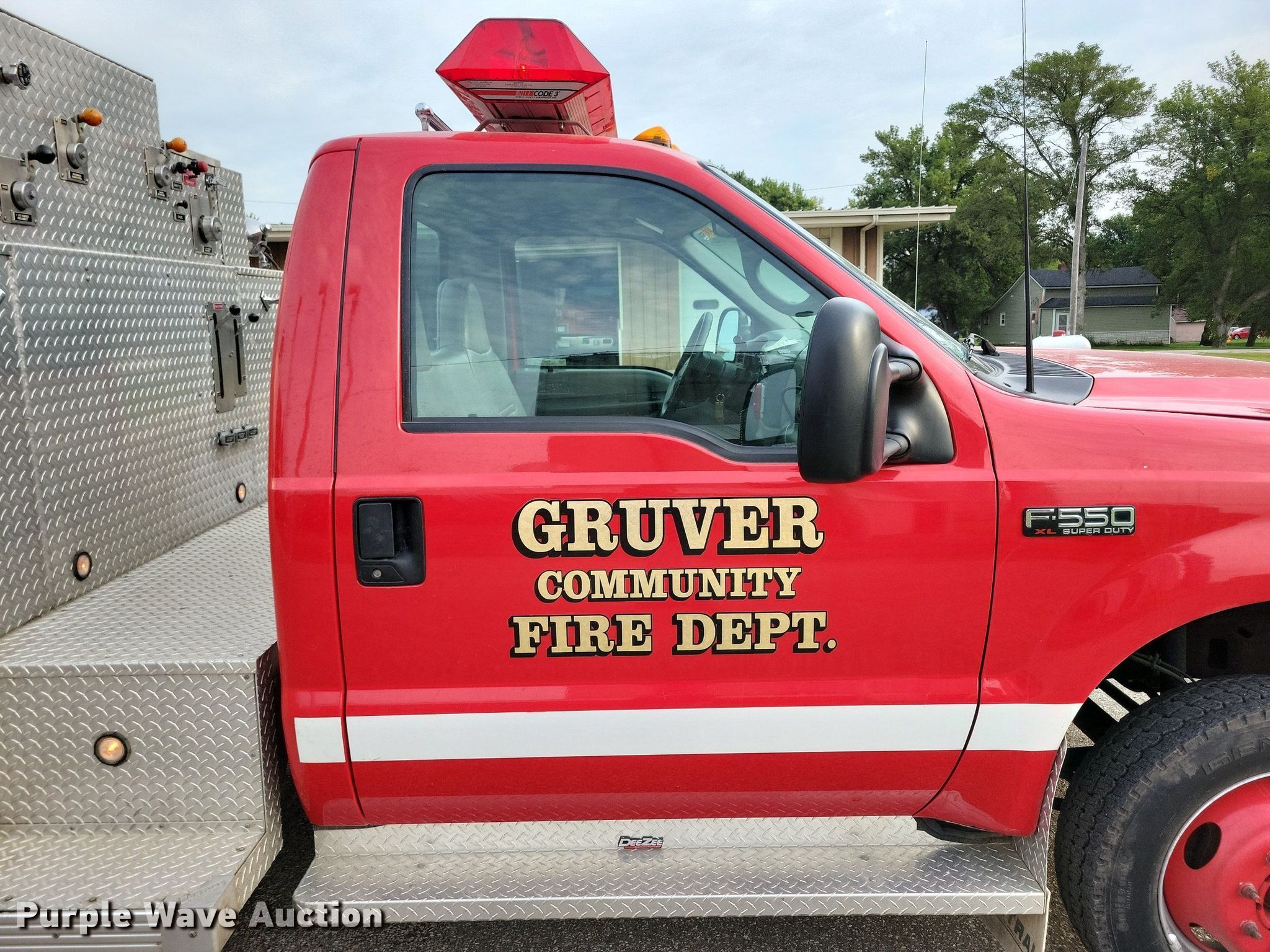 2000 Ford F550 Super Duty XL brush fire truck. Miles: 6,824 on odometer, VIN: 1FDAF57S7YED09885. Engine Displacement: 6.8L, Cylinders: 10, Fuel type: Gas. Transmission Automatic. Chassis Four wheel drive, Axles: Single, Suspension: Spring, Brakes: Hydraulic, GVWR: 17,500 lbs, Wheelbase: 165". Interior Heat. Features Fire truck body Central, Tank Capacity: 500 gallons, Pump 250 gpm, Honda GX660 engine Displacement: 688cc, Fuel type: Gas, PA/ siren controls. Tires Size: 225/70R19.5. Iowa title. Seller is a government entity who will be assigning and distributing the title. Please contact the seller for distribution questions. City of Gruver. Gruver, IA 51334