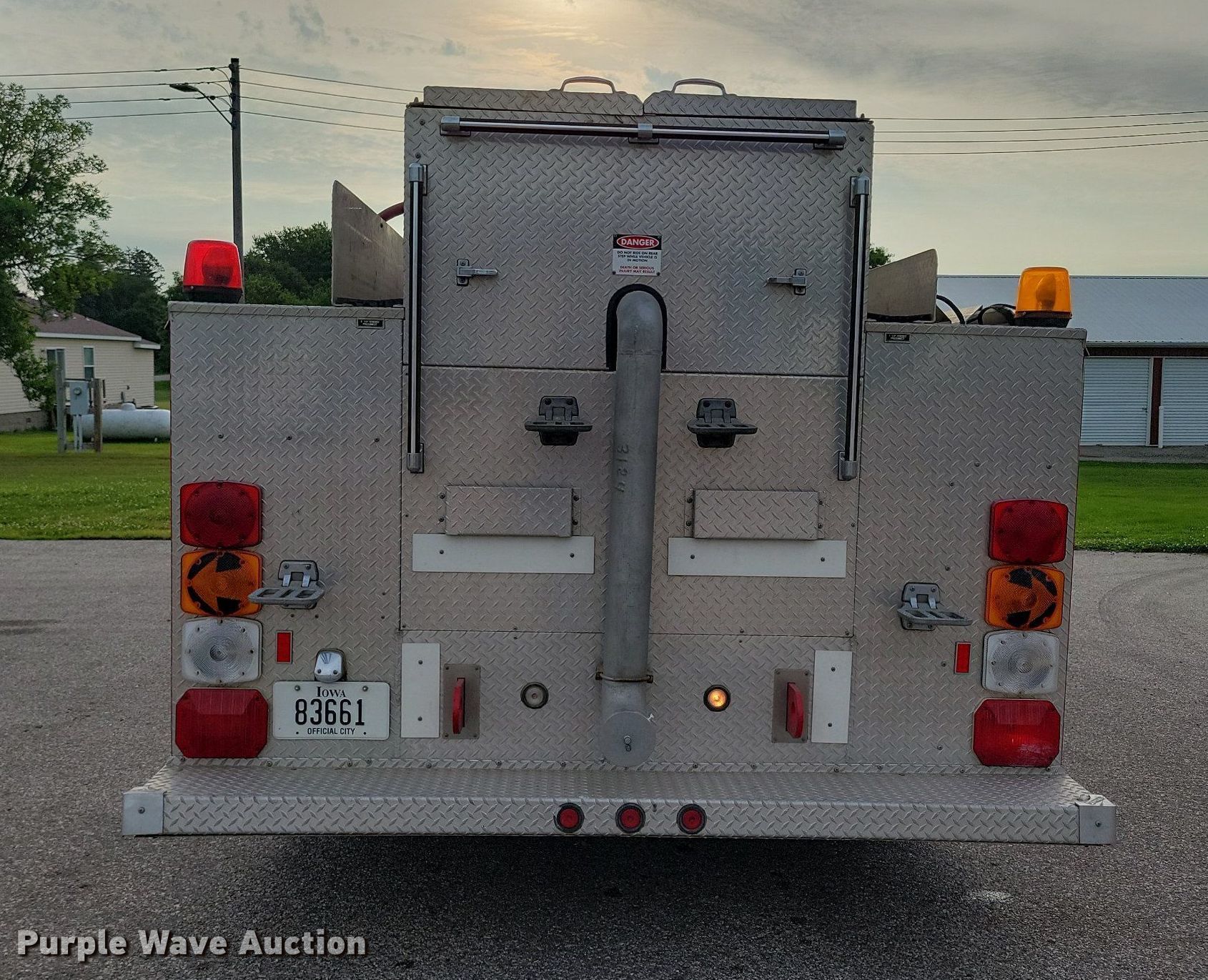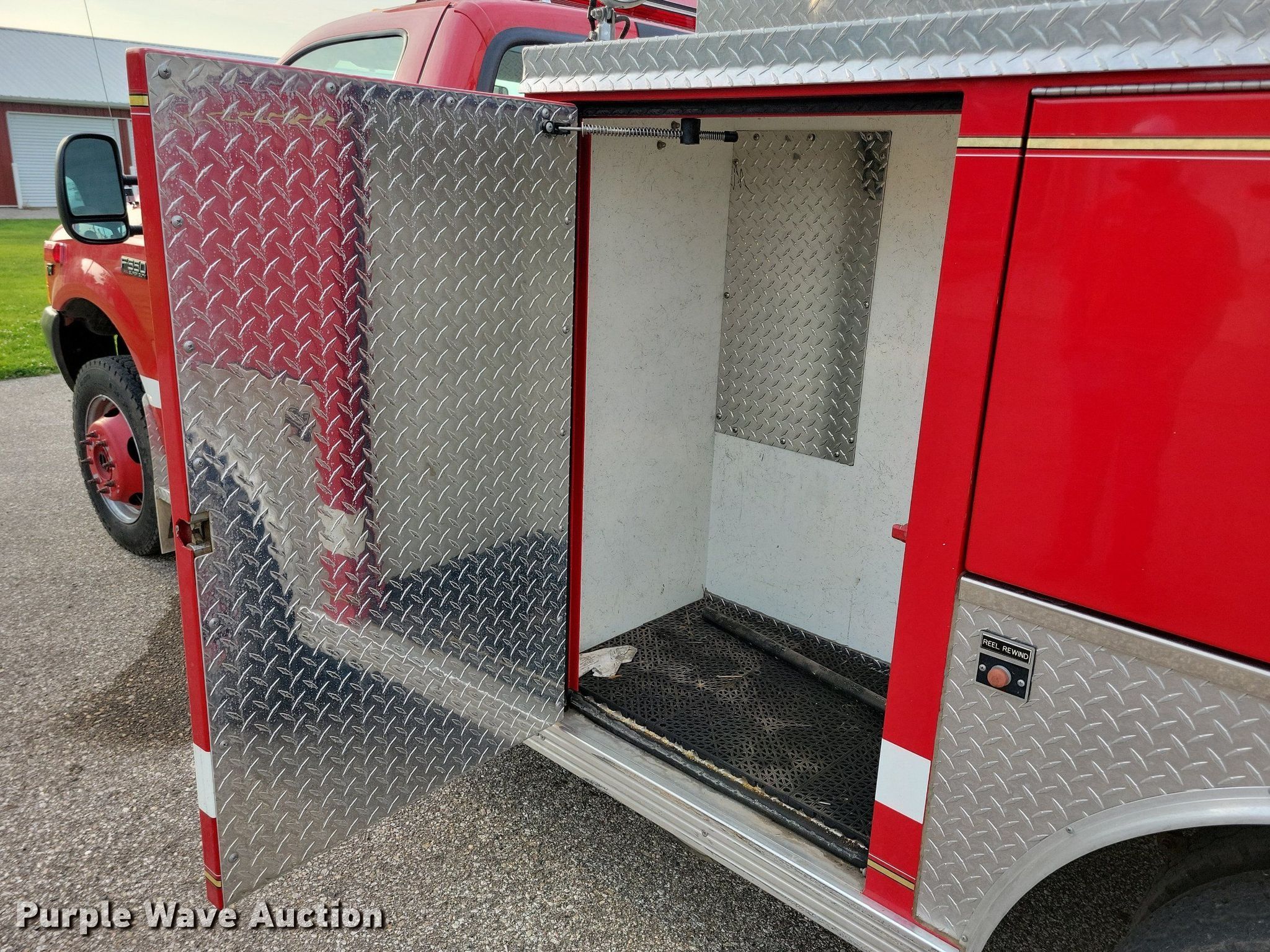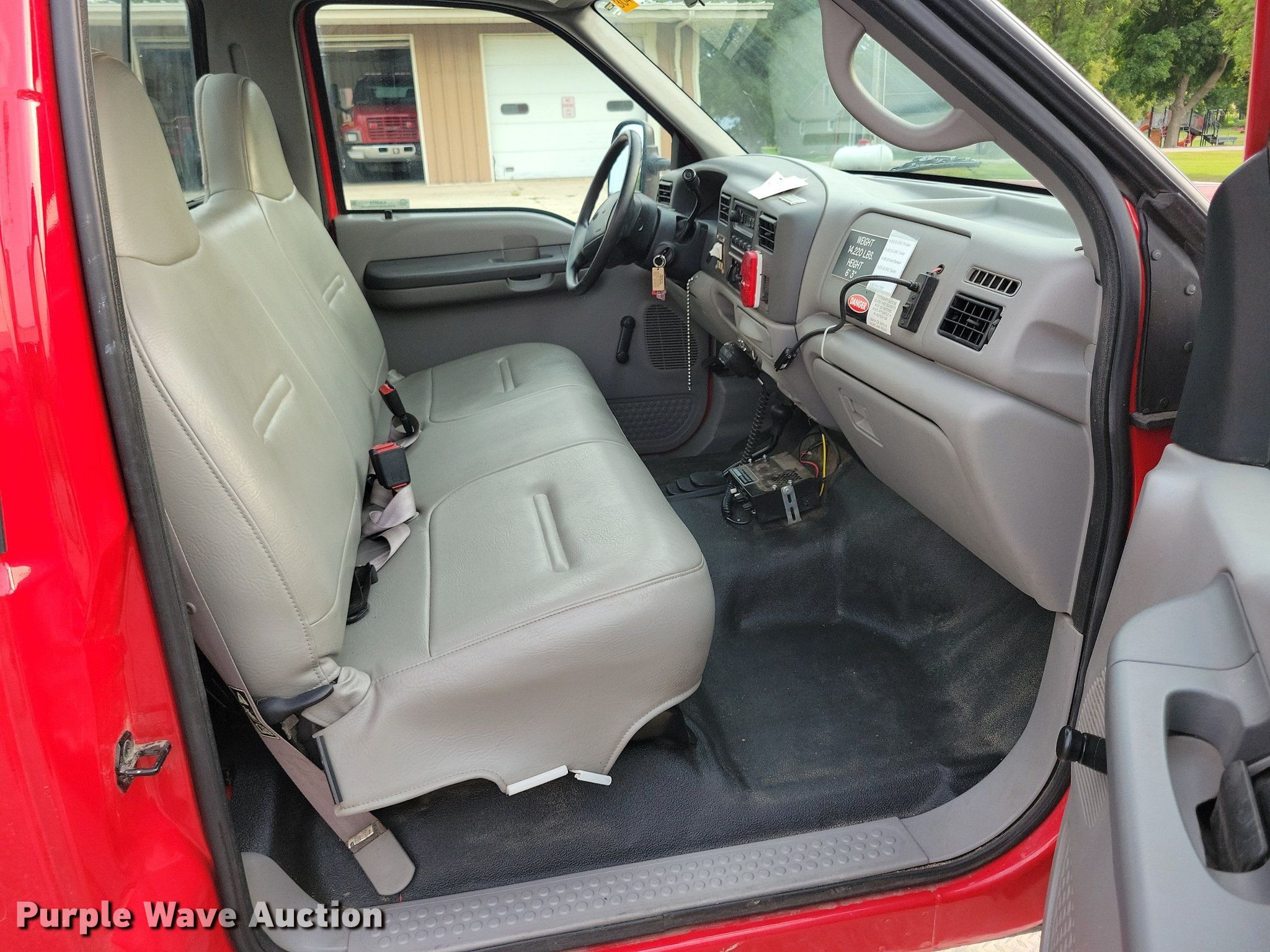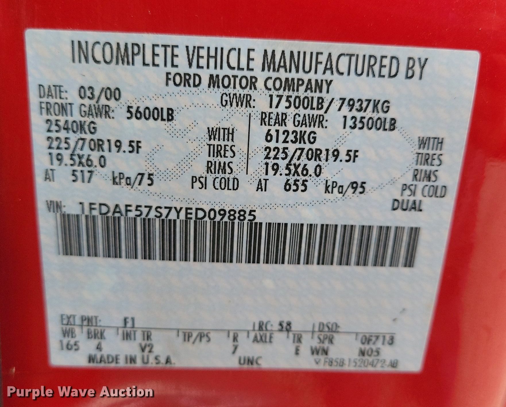 2000 Ford F550 Super Duty XL brush fire truck. Miles: 6,824 on odometer, VIN: 1FDAF57S7YED09885. Engine Displacement: 6.8L, Cylinders: 10, Fuel type: Gas. Transmission Automatic. Chassis Four wheel drive, Axles: Single, Suspension: Spring, Brakes: Hydraulic, GVWR: 17,500 lbs, Wheelbase: 165". Interior Heat. Features Fire truck body Central, Tank Capacity: 500 gallons, Pump 250 gpm, Honda GX660 engine Displacement: 688cc, Fuel type: Gas, PA/ siren controls. Tires Size: 225/70R19.5. Iowa title. Seller is a government entity who will be assigning and distributing the title. Please contact the seller for distribution questions. City of Gruver. Gruver, IA 51334