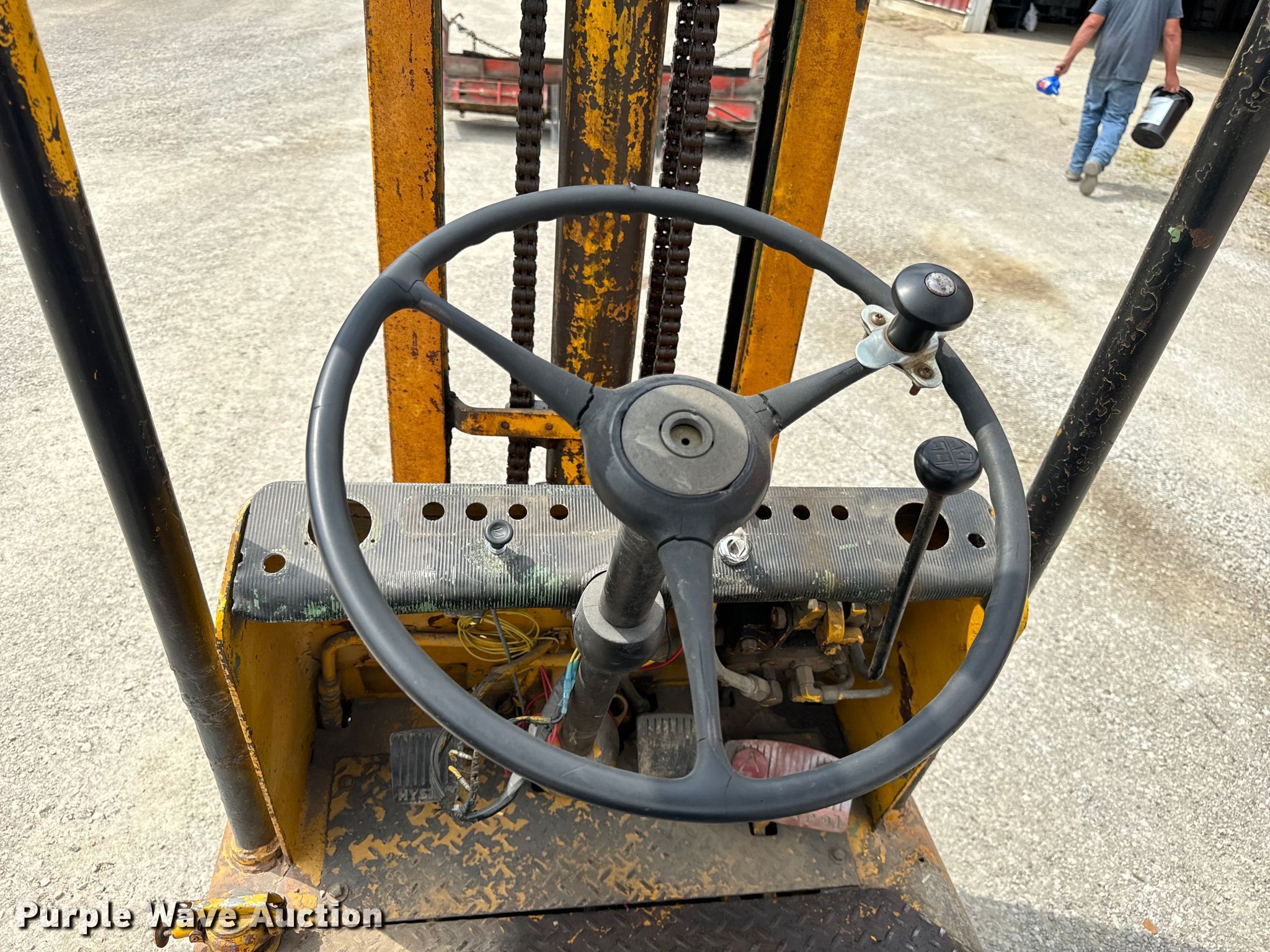 Hyster forklift. Serial: FAB21964. Engine Cylinders: 4, Fuel type: Gas. Transmission Powershift, 1F - 1R. Operators station Canopy. Features Mast stages: 2, Fork length: 44". Tires Front: 18x8x12 1/8, Rear: 16x5x10 1/2, Solid. Notes Hydraulic leak. East Oakland Township. Oakland, IL 61943
