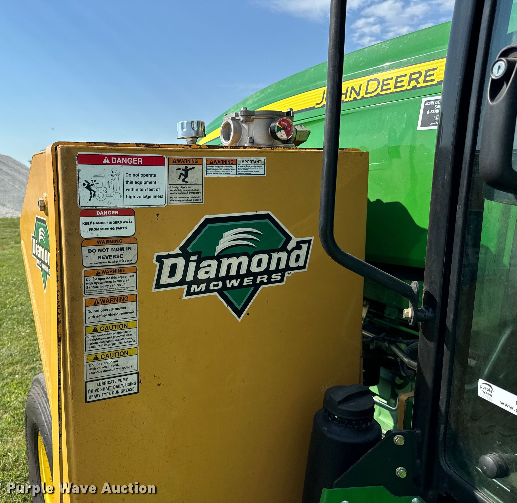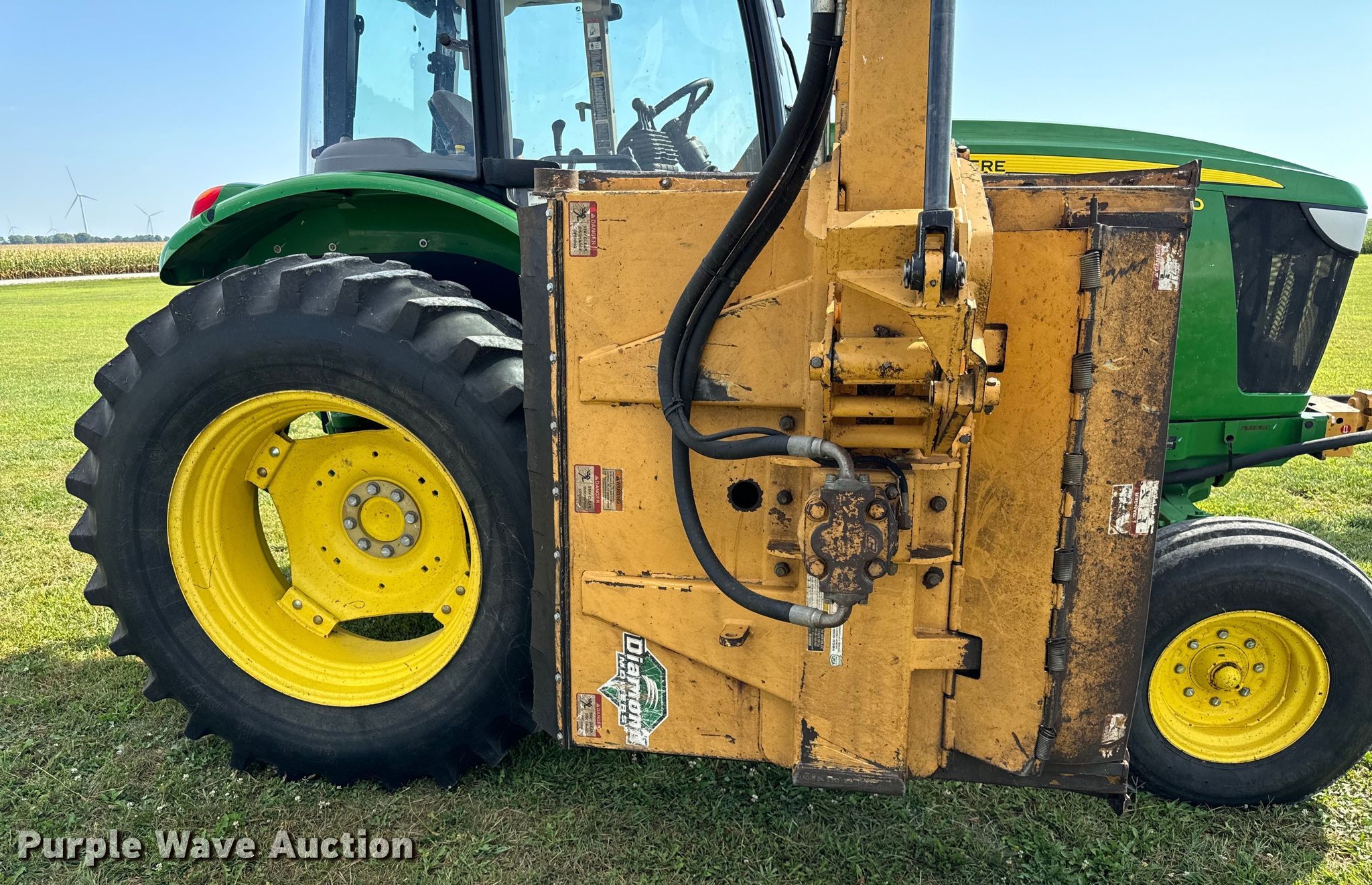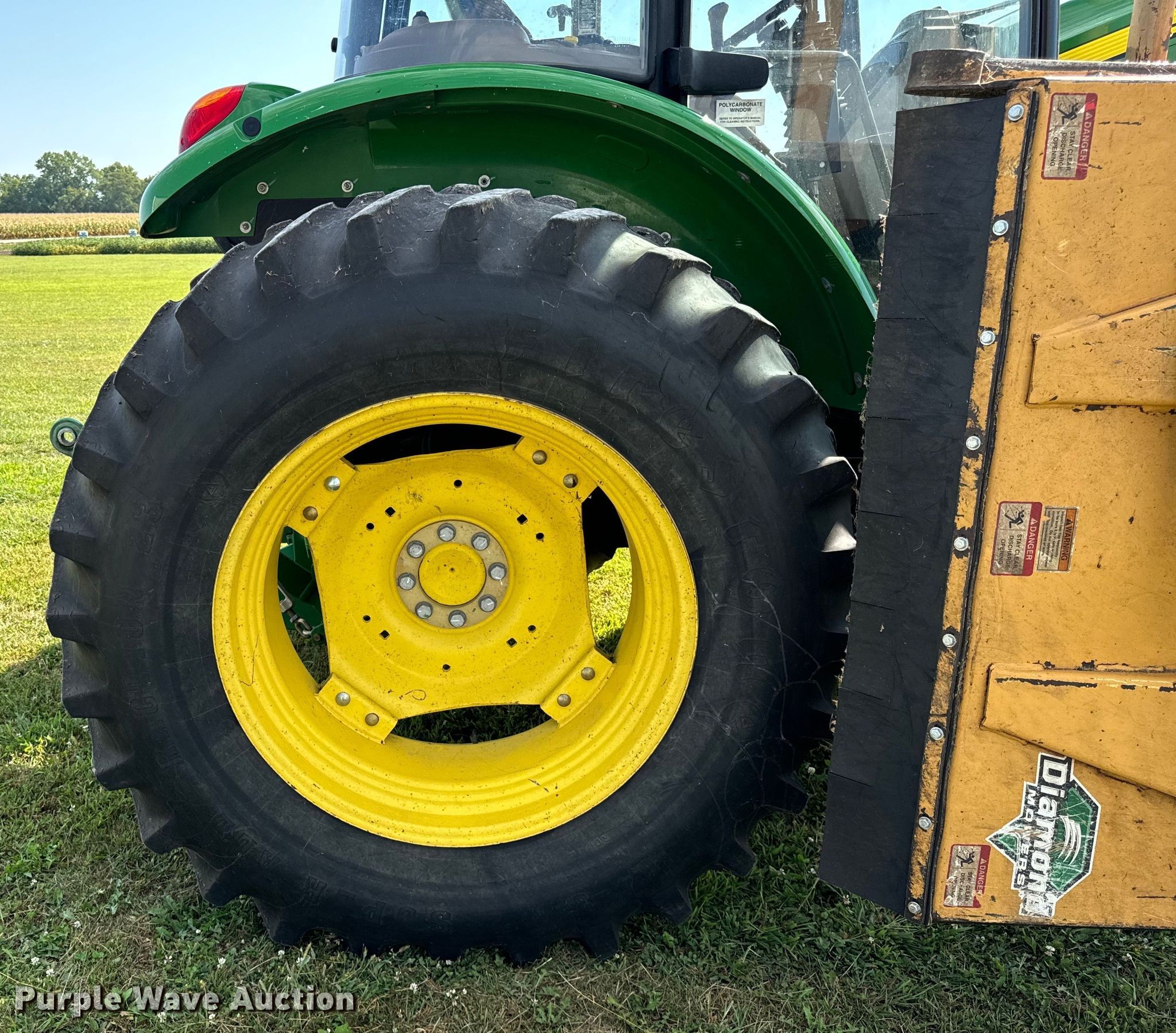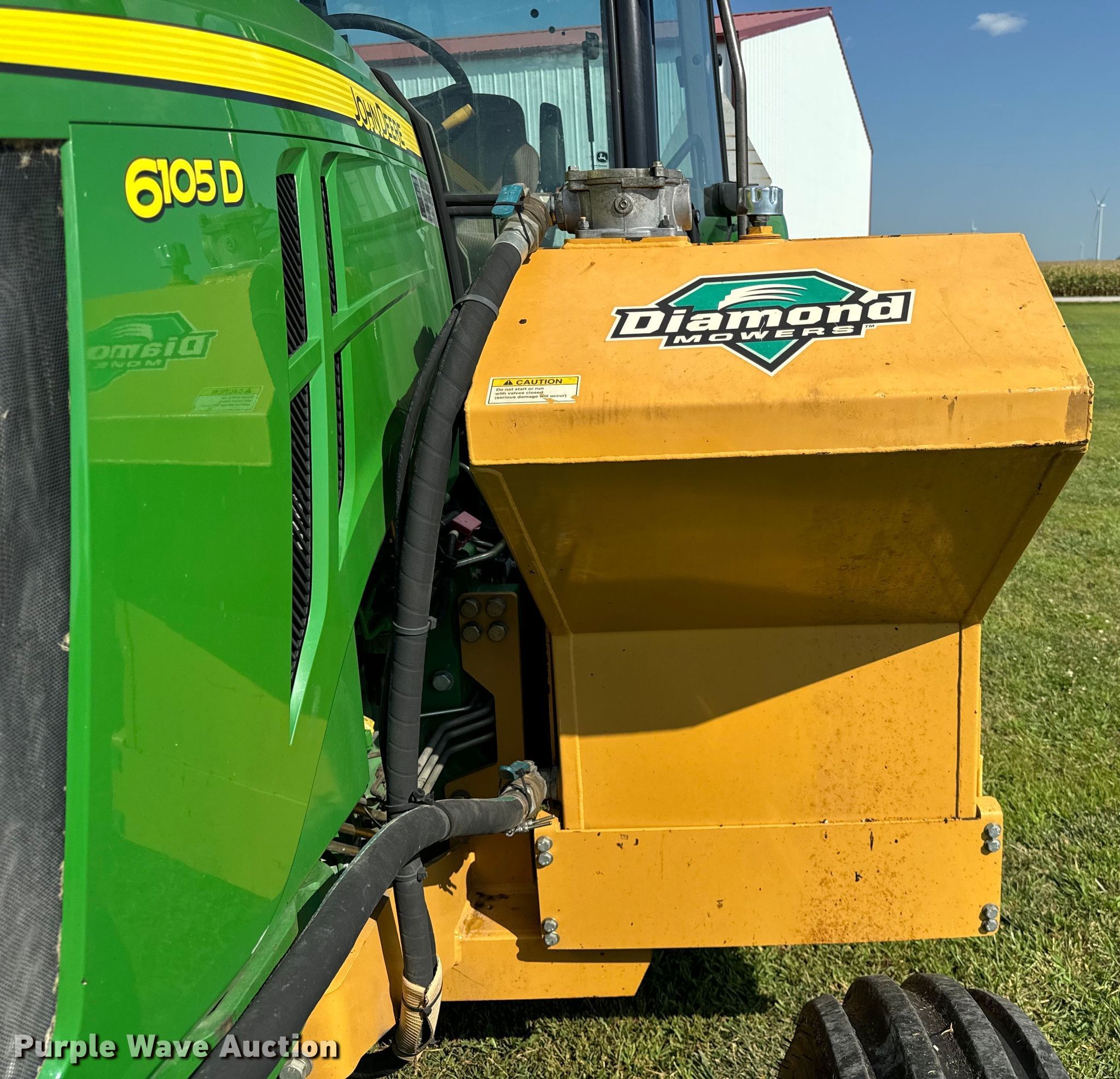2014 John Deere 6105D tractor. Hours: 1,915 on meter, Serial: 1P06105DCEM051823. Engine John Deere 4045HP056, Cylinders: 4, Fuel type: Diesel. Transmission Synchro, 9F - 9R, Left-hand reverser, Differential lock. Operators station AC, Heat. Features PTO: 540, Three point, Seven pin outlet, Hydraulic remote sets Rear: 2, Side boom rotary mower Diamond, Serial: MF12533, Width: 50". Tires Front: 10.00-16SL, Rear: 18.4-34. Morgan Co Road District 8. Alexander, IL 62601