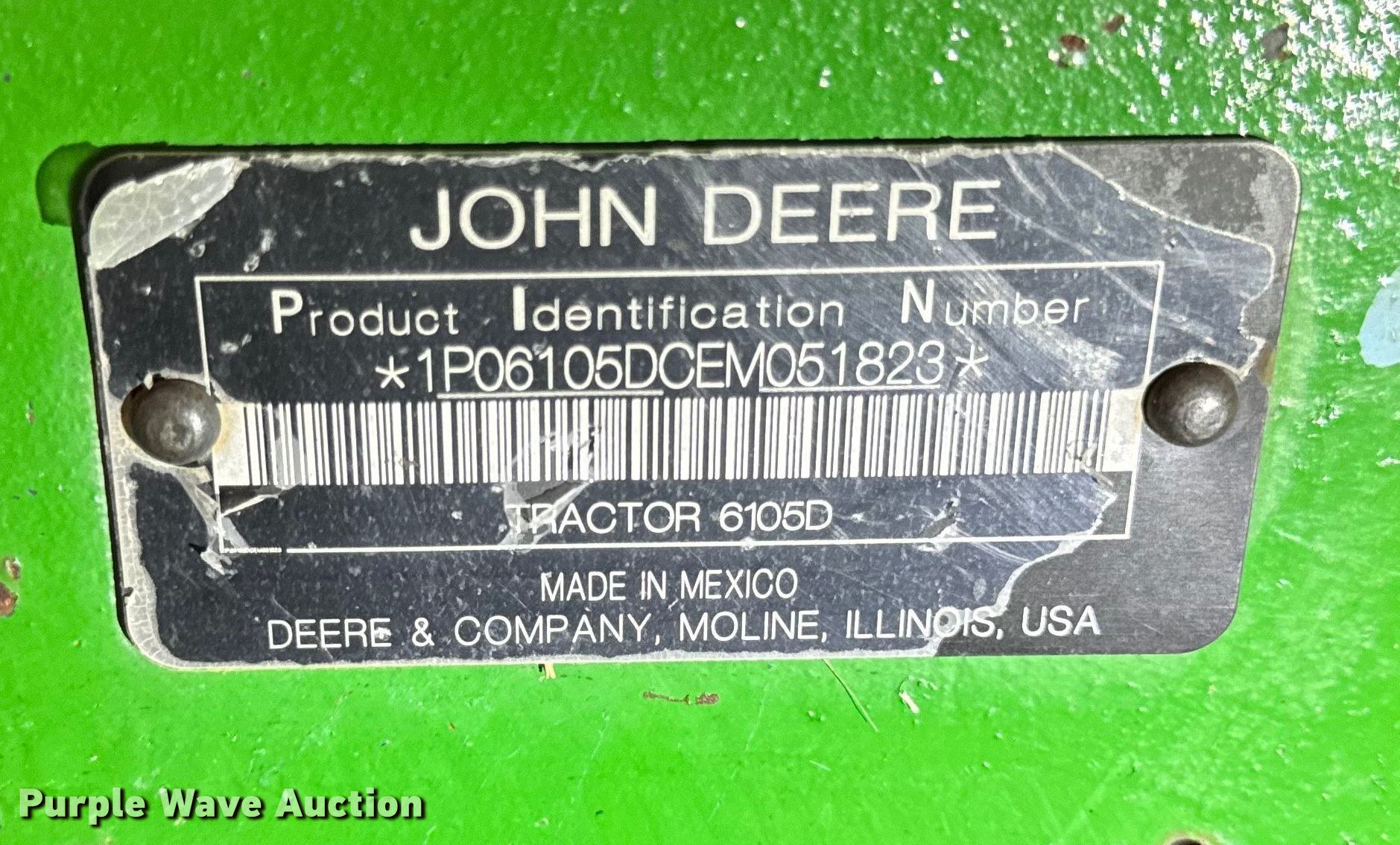 Purple Wave is selling a used Tractor in Illinois. This item is a 2014 John Deere 6105D tractor with the following: Hours: 1,915 on meter, Serial: 1P06105DCEM051823
