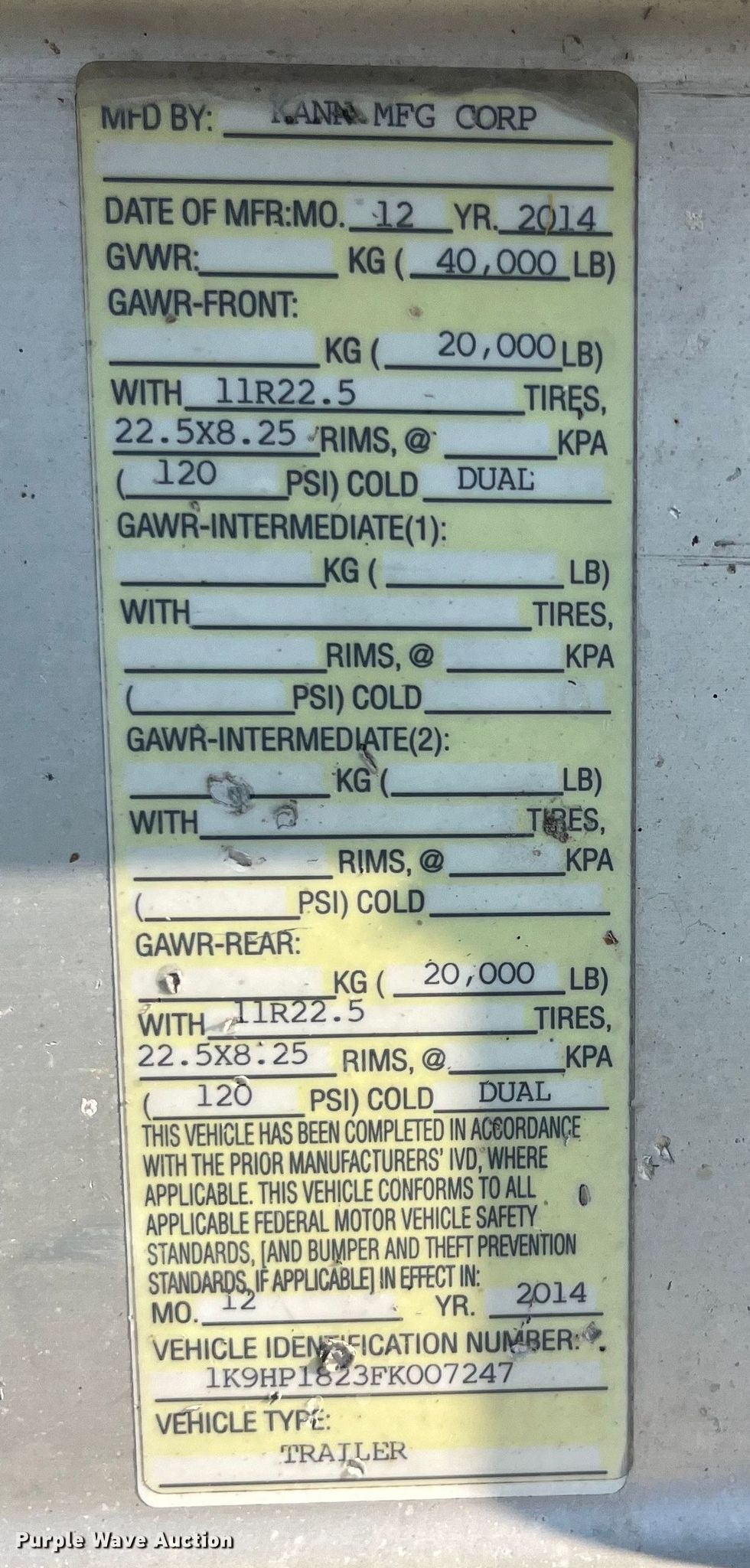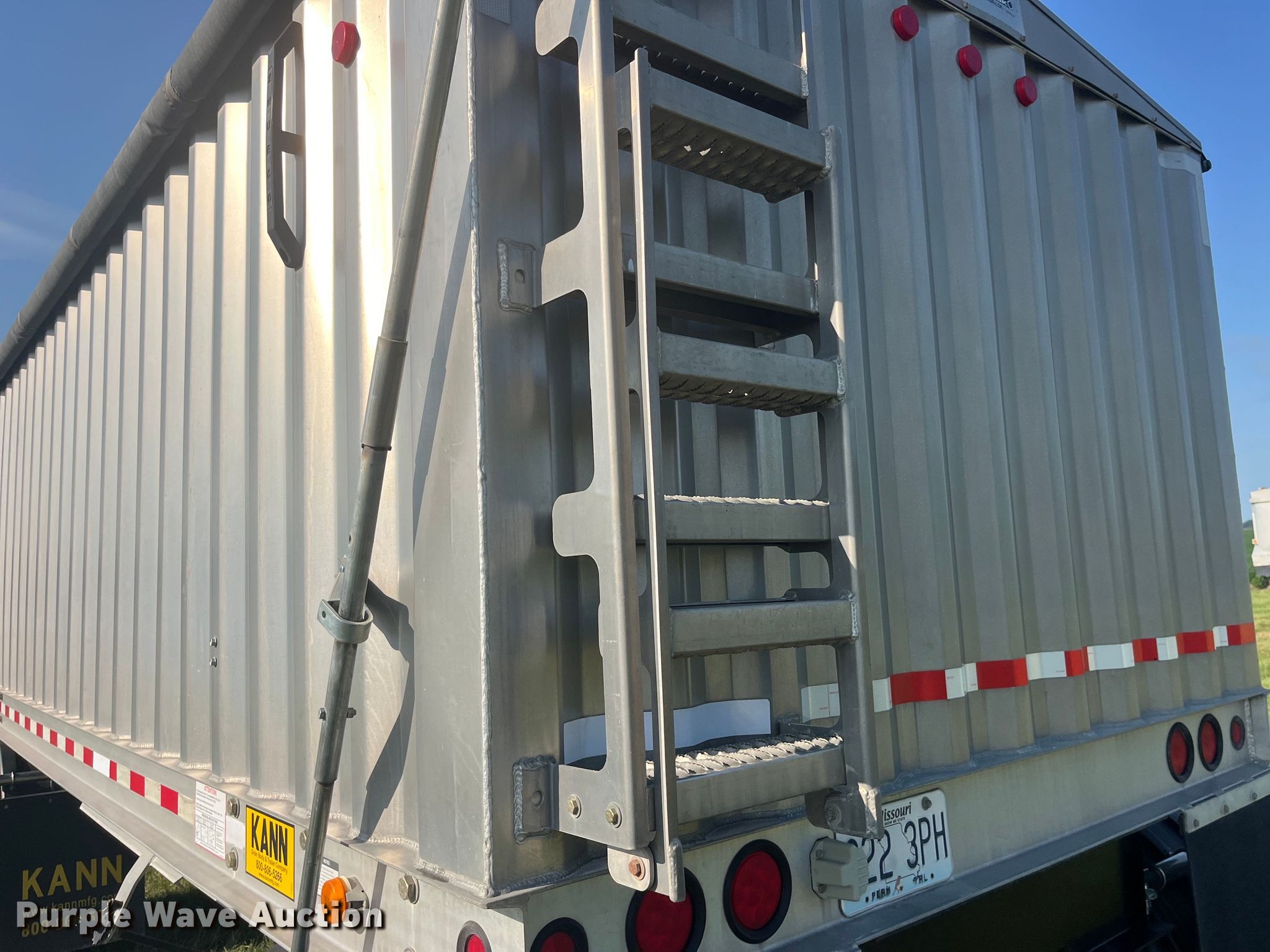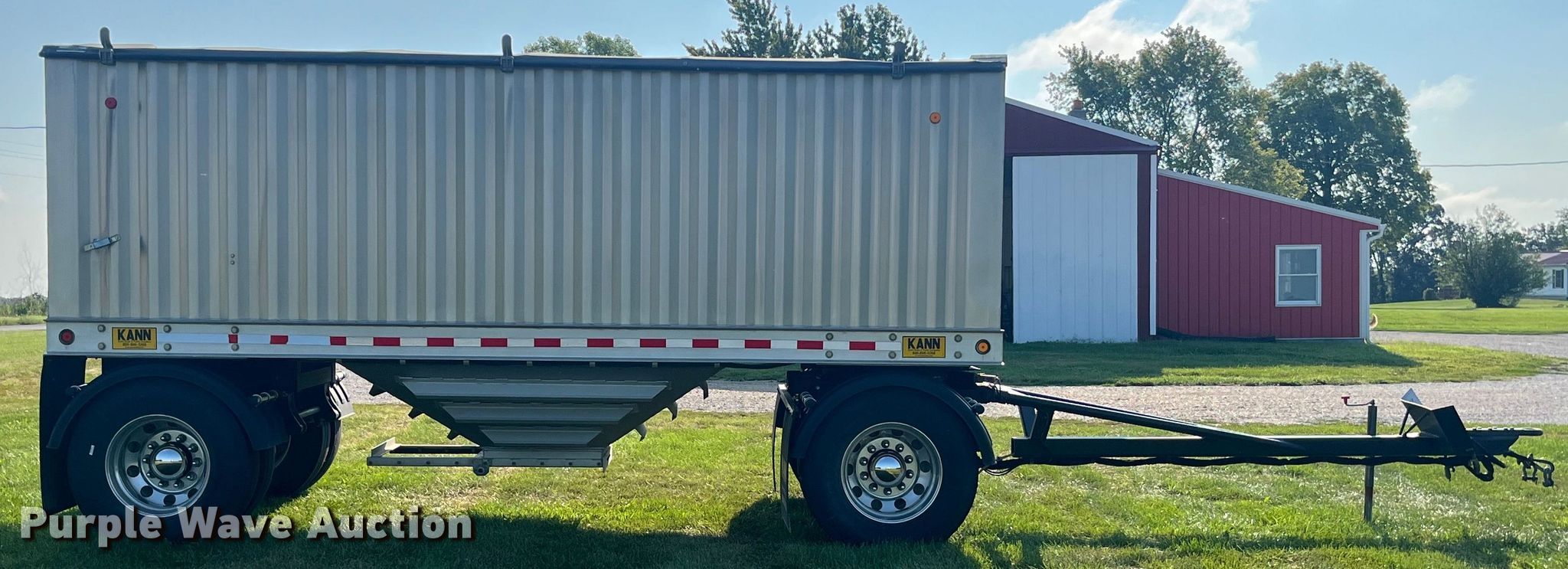 2015 Kann pup grain trailer. VIN: 1K9HP1823FK007247. Dimensions Overall: 31' L x 102" W, Body: 18' L x 95.5" W, Side height: 60". Features Body type: Aluminum, Hoppers: Single Trap gates: Manual. Chassis Hitch: Pintle, Landing gear: Single, Suspension: Spring, Brakes: Air, GVWR: 40,000 lbs, GAWR: 20,000 lbs. Tires Aluminum wheels, Size: 11R22.5. Missouri title. Title distribution may be delayed up to 14 days from verification of funds. T J T Gottman Inc.. Monroe City, MO 63456