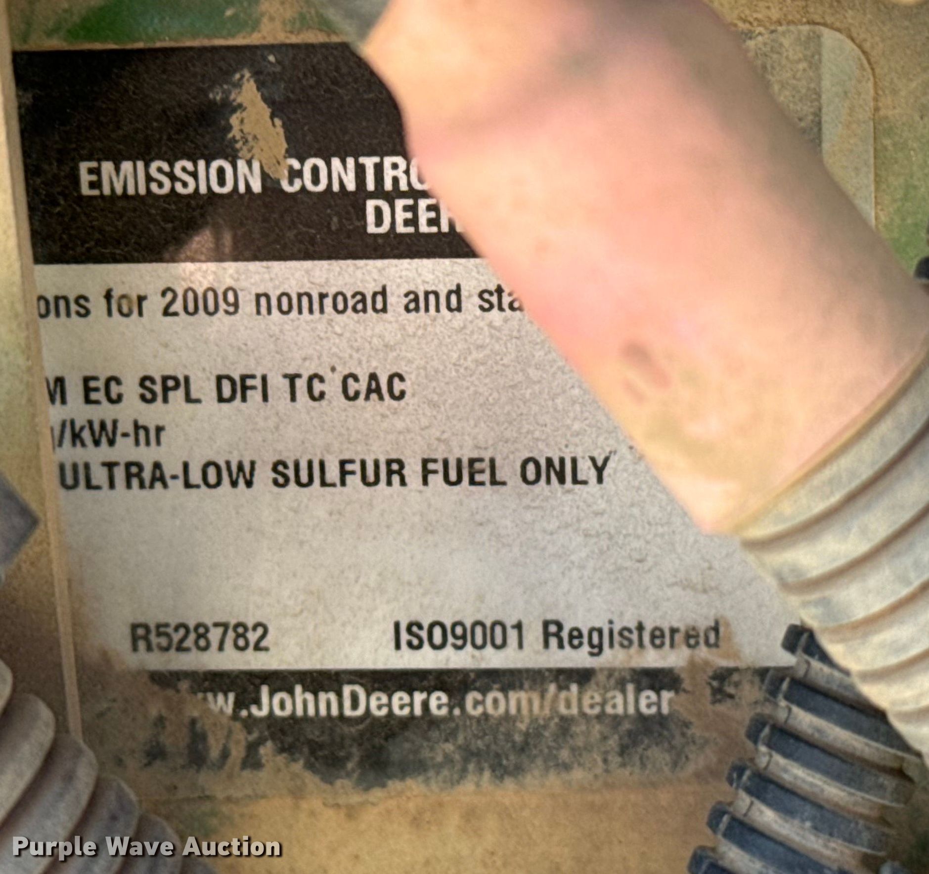 2009 John Deere 5075M tractor. Hours: 825 on meter, Serial: LV5075M150090. Engine John Deere 5030HLV11A, Serial: 9JDXL03.0203, Displacement: 3.0L, Cylinders: 3, Fuel type: Diesel. Transmission Synchro, 16F - 16R, Differential lock. Features PTO: 540, Three point, Seven pin outlet, Hydraulic remote sets Rear: 2. Tires Front: 11L-15, Rear: 16.9-28. Trillium Construction Co.. Loving, TX 76460