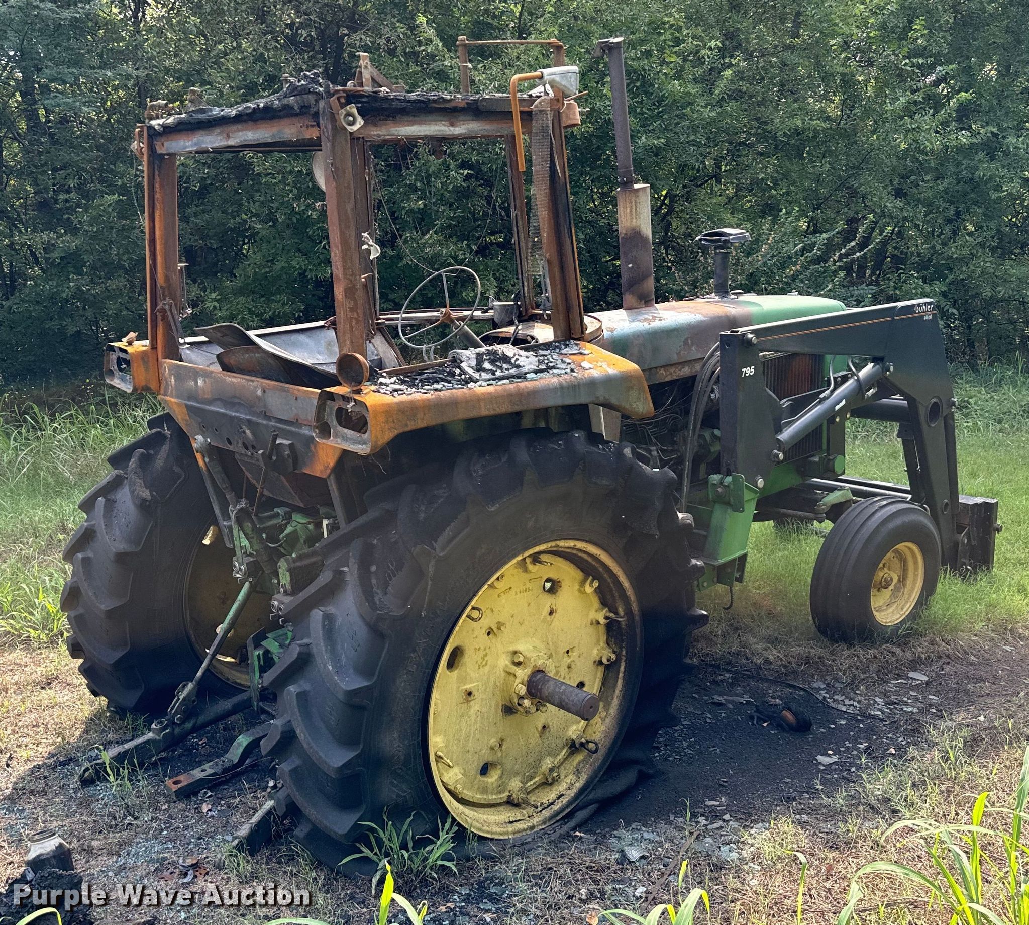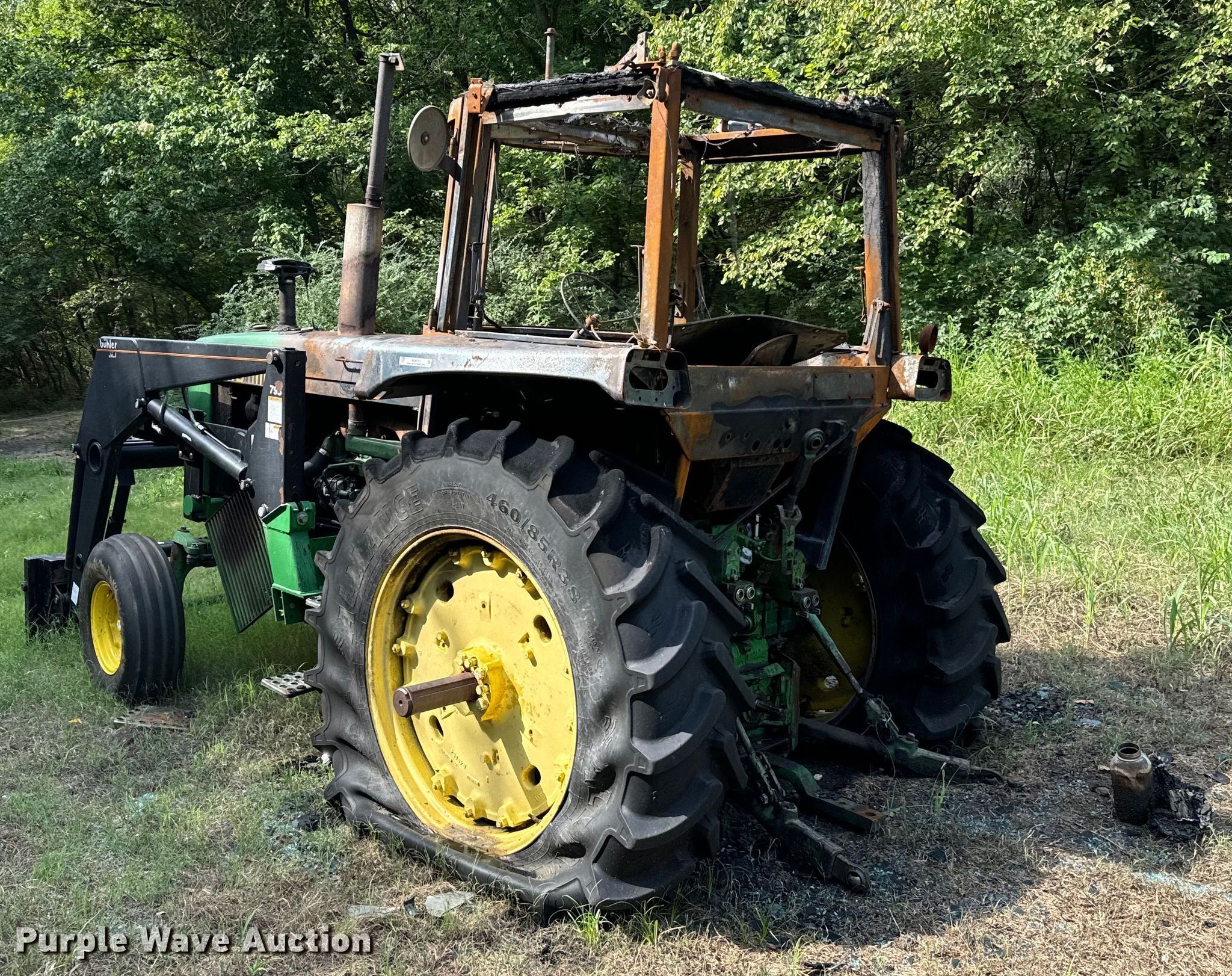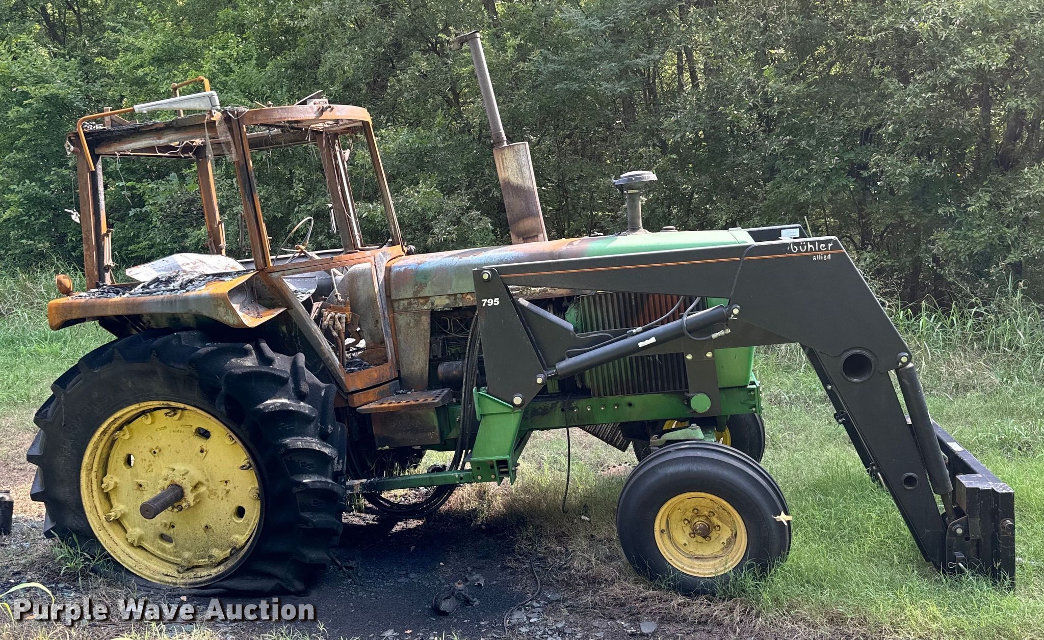 1980 John Deere 4240 tractor. Hours: Unknown, Serial: 4240P 017340R, Insurance salvage unit claim #: 4-812185. Engine John Deere 6466, Serial: 6466DR-02 122342R6, Cylinders: 6, Fuel type: Diesel. Transmission Powershift, Left-hand reverser, Differential lock. Features PTO: 540, 1000, Three point Top link, Hydraulic remote sets Rear: 2, Loader Buhler 795, Bale spear, Controls: Joystick, Bucket Width: 84".. Tires Front: 10.00-16, Rear: 460/85R38. Notes Glass cracked, Fire Damage, Non-operational unit. Oklahoma Farm Bureau. Ada, OK 74820