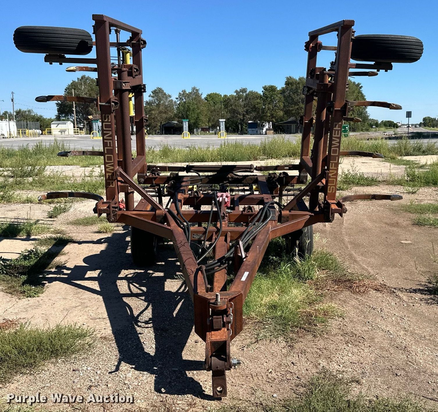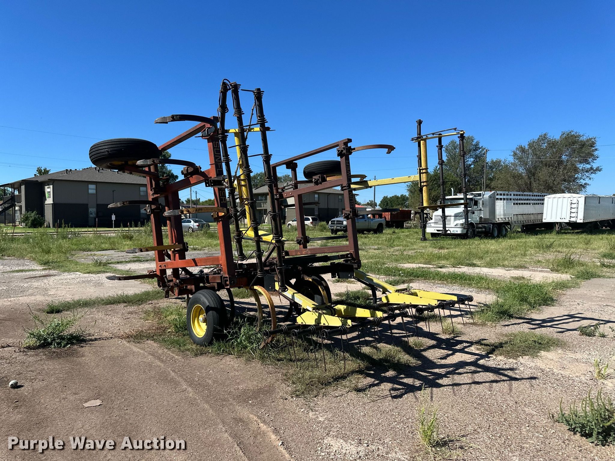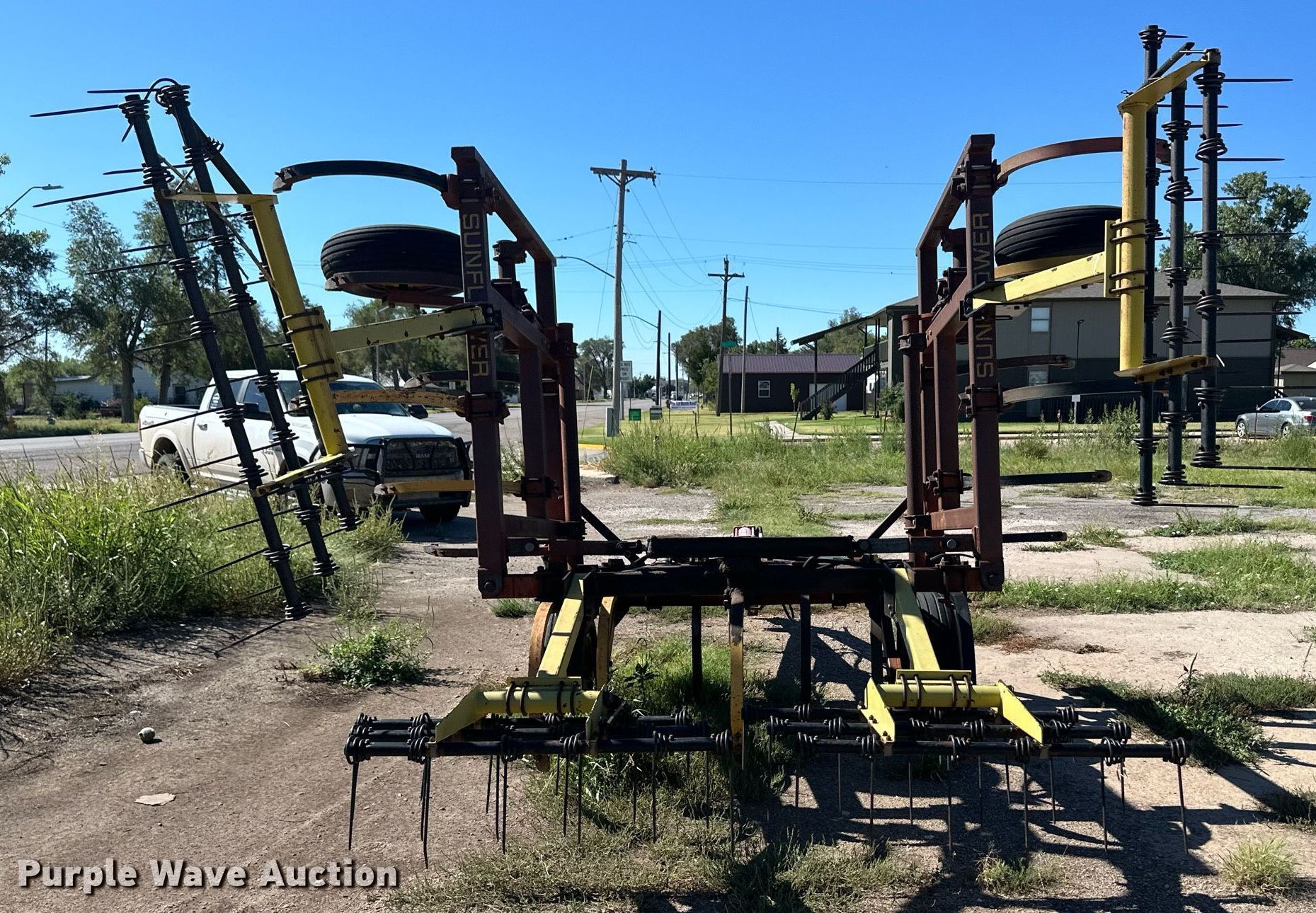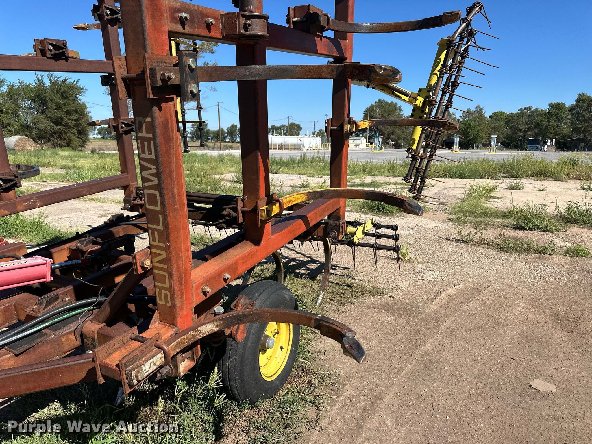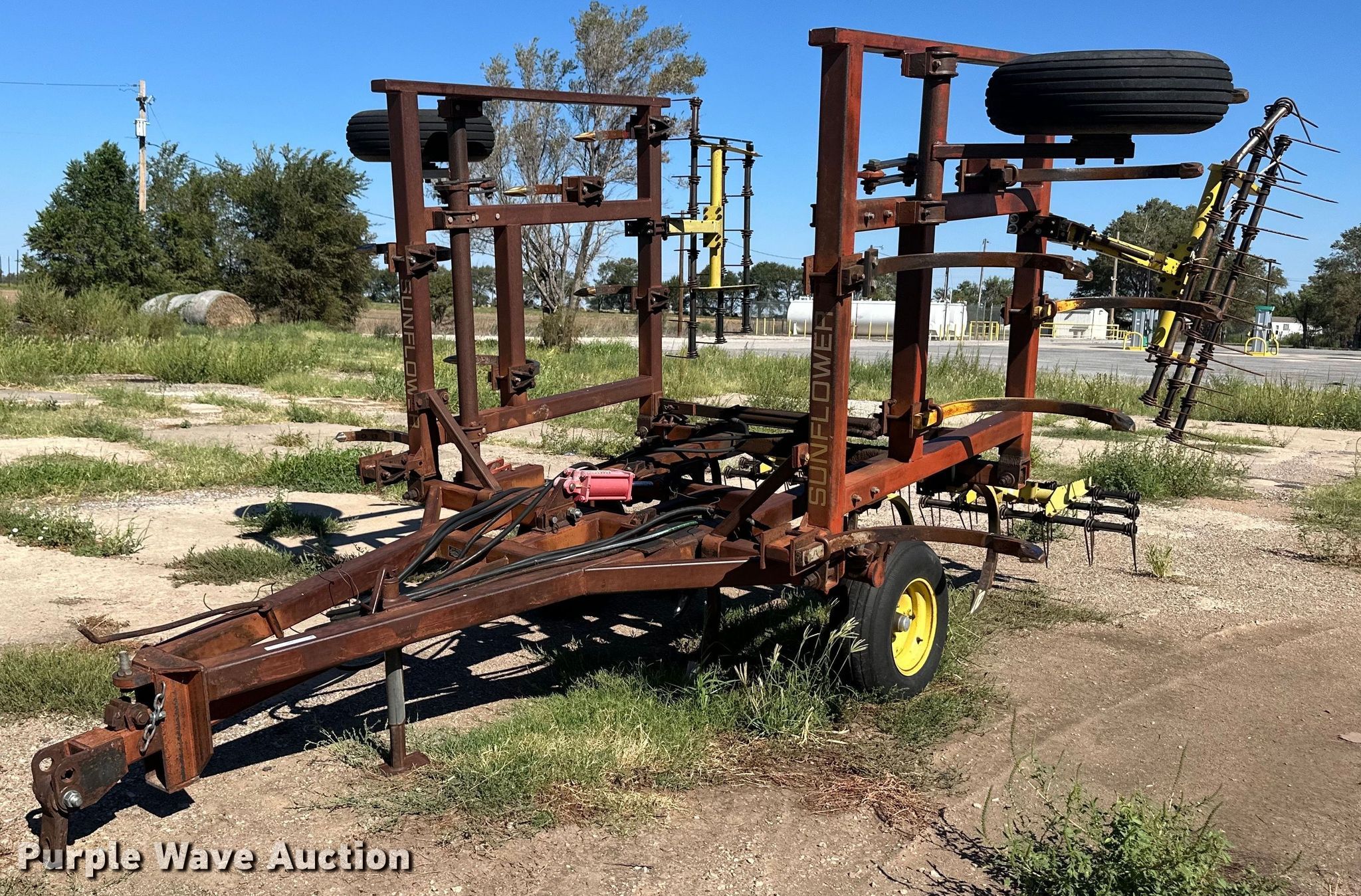 Sunflower B-19 chisel. Overall width: 19', Serial: 73349. Features Shanks: 19, Operation Hydraulic lift, Hydraulic fold, Leveler: Manual, Attachments Tine harrow Harrow bars: 4.. Tires Tire size: 9.5L-15SL. Laverne, OK 73848