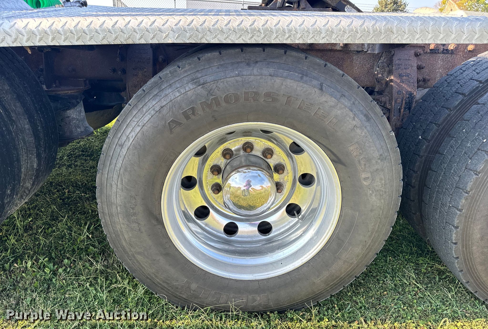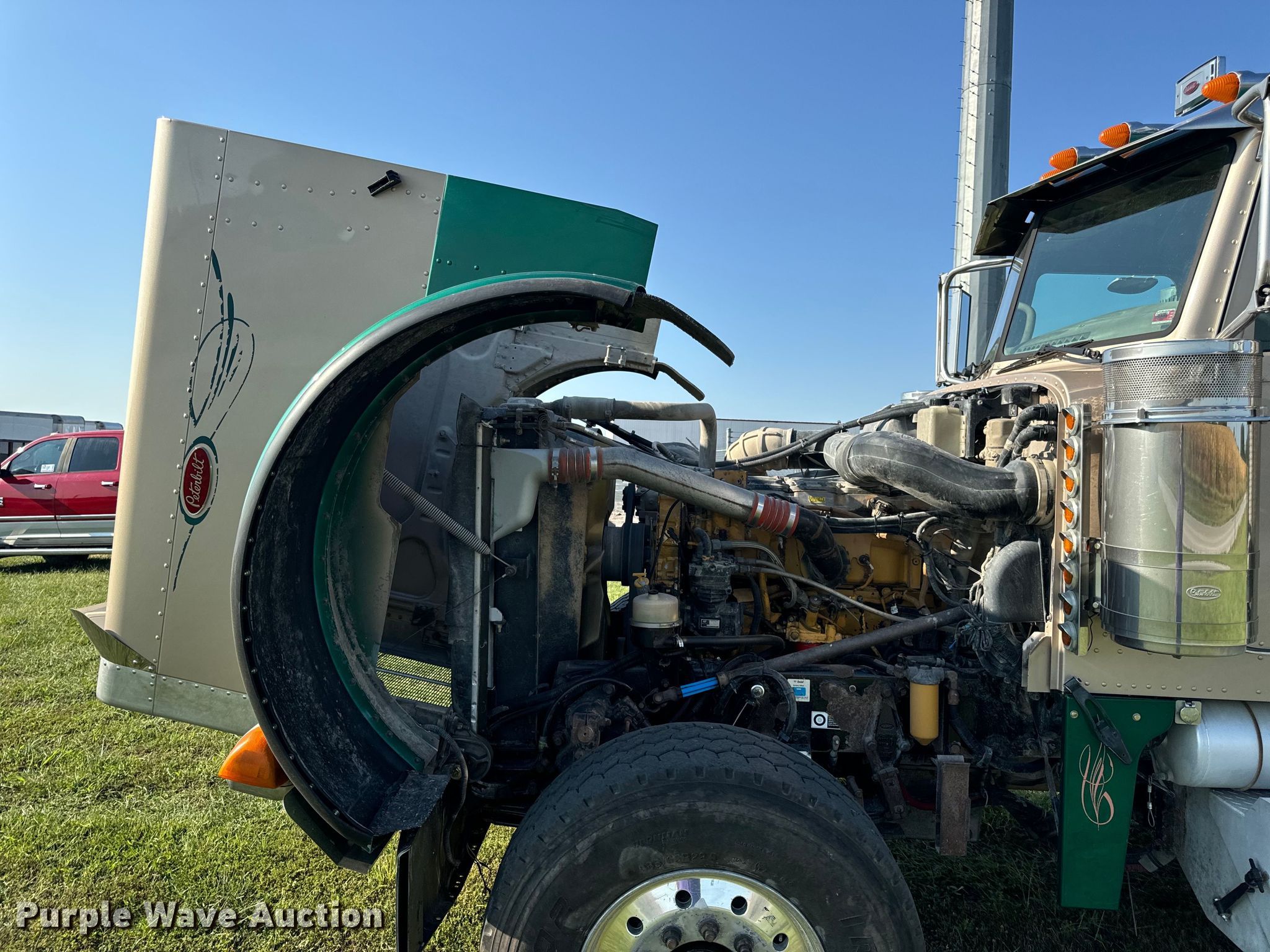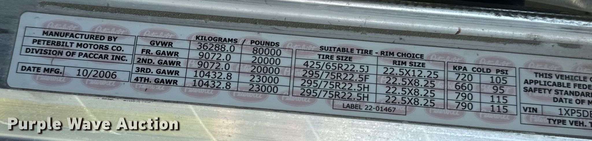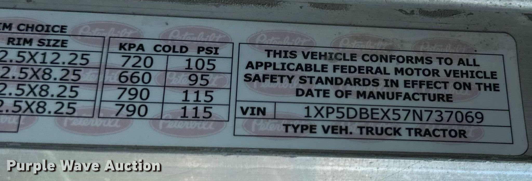 2007 Peterbilt 379 semi truck. Miles: 632,428 on odometer, Hours: 16,734 on meter, VIN: 1XP5DBEX57N737069. Engine Caterpillar C15, Displacement: 14.6L, Cylinders: 6, Fuel type: Diesel, HP: 625, Engine brake. Transmission Eaton Fuller, Manual, Speed: 18. Chassis Axles: Tandem, Pusher axle, Differential lock: Full, Suspension: Air Dump valves, Brakes: Air, PTO, Wet kit, GVWR: 80,000 lbs FAWR: 20,000 lbs, IAWR: 23,000 lbs, RAWR: 23,000 lbs, Lift axle GAWR: 20,000 lbs. Interior AC, Heat, Heated mirrors, Power windows, Cruise control, Air ride cab. Features Deck plate: Aluminum, Fifth wheel type: Air operated, Sliding, Fuel tank: Single. Tires Front: 385/65R22.5, Rear: 11R24.5, Lift axle: 275/70R22.5. Notes Dash warning indicator: ABS, Unknown operating condition of pusher axle, AC issues, blower motor makes noise, Fifth wheel actuator issues, air line broke. Missouri title. Title distribution may be delayed up to 14 days from verification of funds. AAA Disposal Service, Inc. Buckner, MO 64016