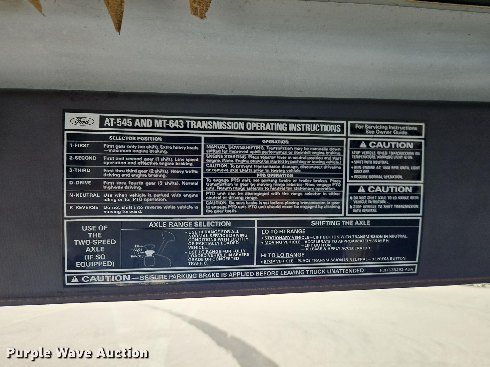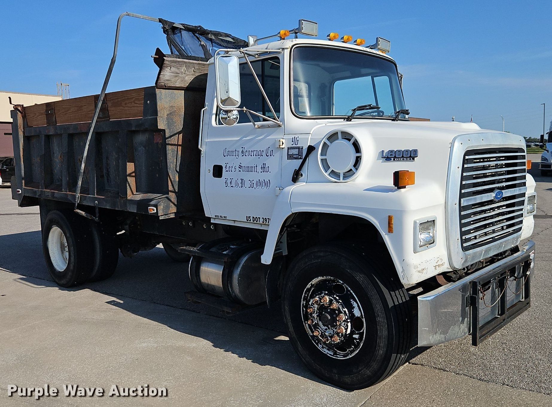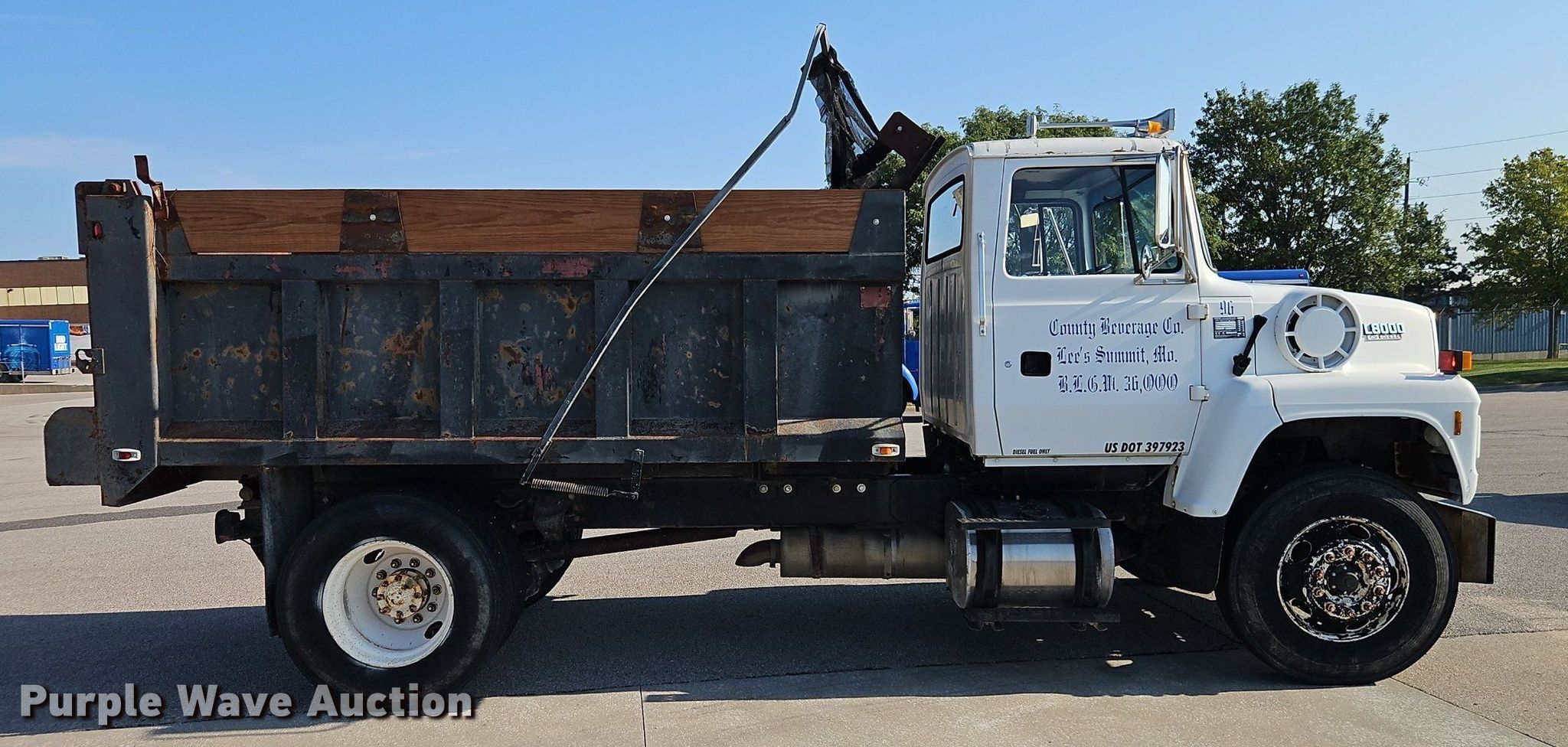 1995 Ford L8000 dump truck. Miles: 168,658 on odometer, VIN: 1FDXR82E1SVA10856. Engine Displacement: 8.3L, Cylinders: 6, Fuel type: Diesel. Transmission Automatic. Chassis Axles: Single, Suspension: Spring, Brakes: Air, PTO, GVWR: 32,000 lbs, Wheelbase: 276". Interior Heat. Features Dump bed 12' L x 96" W, Side height: 33", Side board height: 12", Bed type: Steel, Ram: Single, End gate: Manual. Tires Size: 11R22.5. Missouri title. Title distribution may be delayed up to 14 days from verification of funds. County Beverage Co.. Lee's Summit, MO 64081
