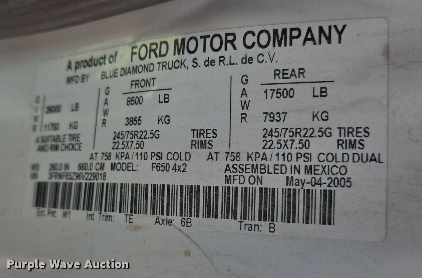 2006 Ford F650 Super Duty XL box truck. Miles: 187,271 on odometer, VIN: 3FRNF65Z96V229018. Engine International VT 365, Displacement: 6.0L, Cylinders: 8, Fuel type: Diesel. Transmission Automatic. Chassis Axles: Single, Suspension: Spring, Brakes: Hydraulic, GVWR: 26,000 lbs. Interior AC, Heat, Cruise control. Features Box bed Transglobal, Serial: 547240, 24.5' L x 102" W x 96" H, Floor: Wood, End gate lift Maxon.. Tires Size: 11R22.5. Notes Windshield chipped or cracked, Shift linkage issues. South Dakota title. Title distribution may be delayed up to 14 days from verification of funds. Rapid City, SD 57703