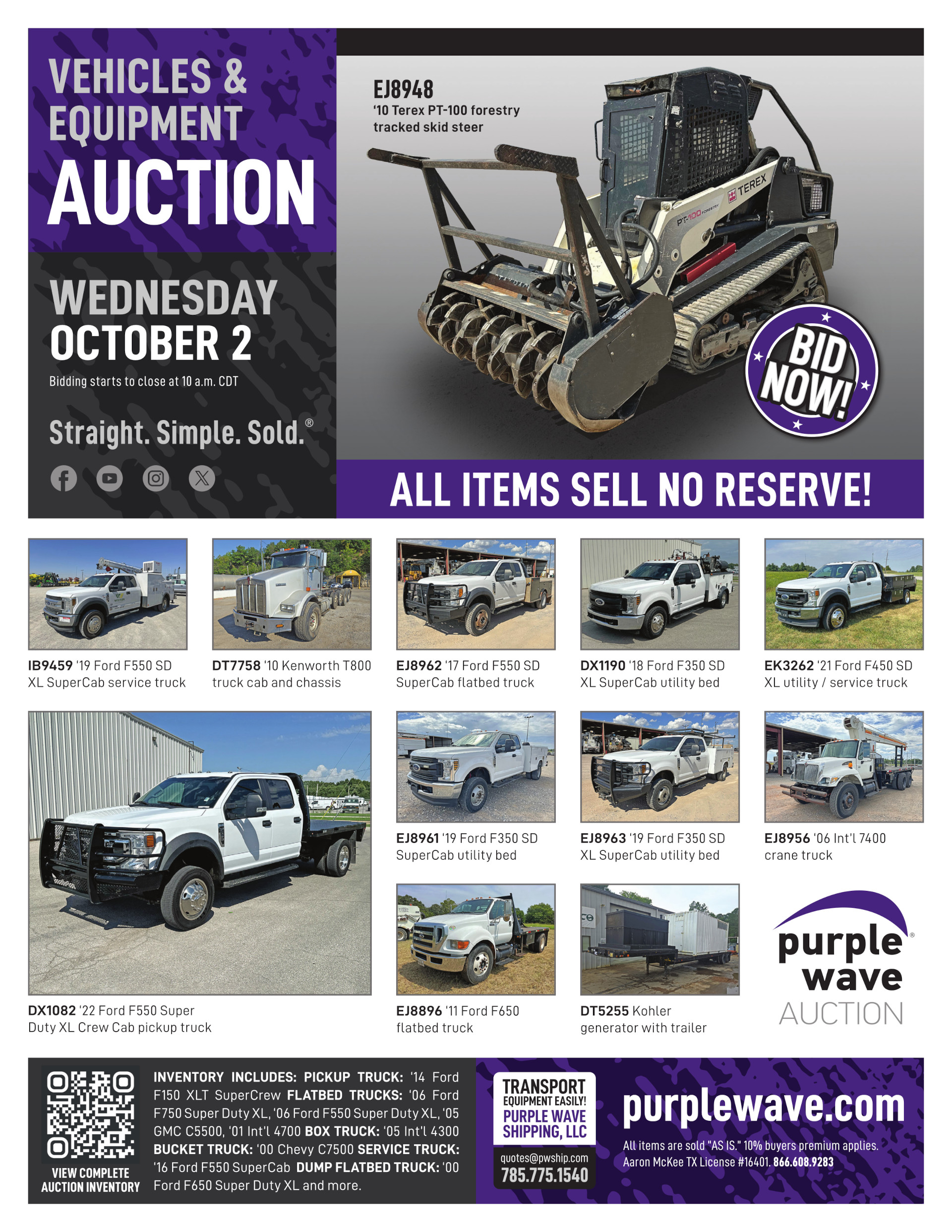 This auction is conducted by Purple Wave, Inc., whose home office is 825 Levee Drive, Manhattan, Kansas. Aaron McKee, Texas auctioneer license # 16401, operates Purple Wave, Inc. Complaints against us may be directed to the Texas Department of Licensing and Regulation, P.O. Box 12157, Austin, Texas 78711, (512) 463-6599. For additional required information, see the attached document.