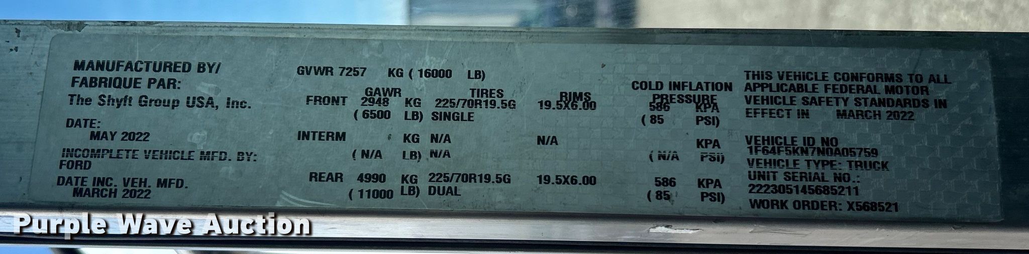 Purple Wave is selling a used Delivery Truck or Van in Oklahoma. This item is a 2022 Ford F59 delivery van with the following: Miles: 16,709 on odometer, VIN: 1F64F5KN7N0A05759