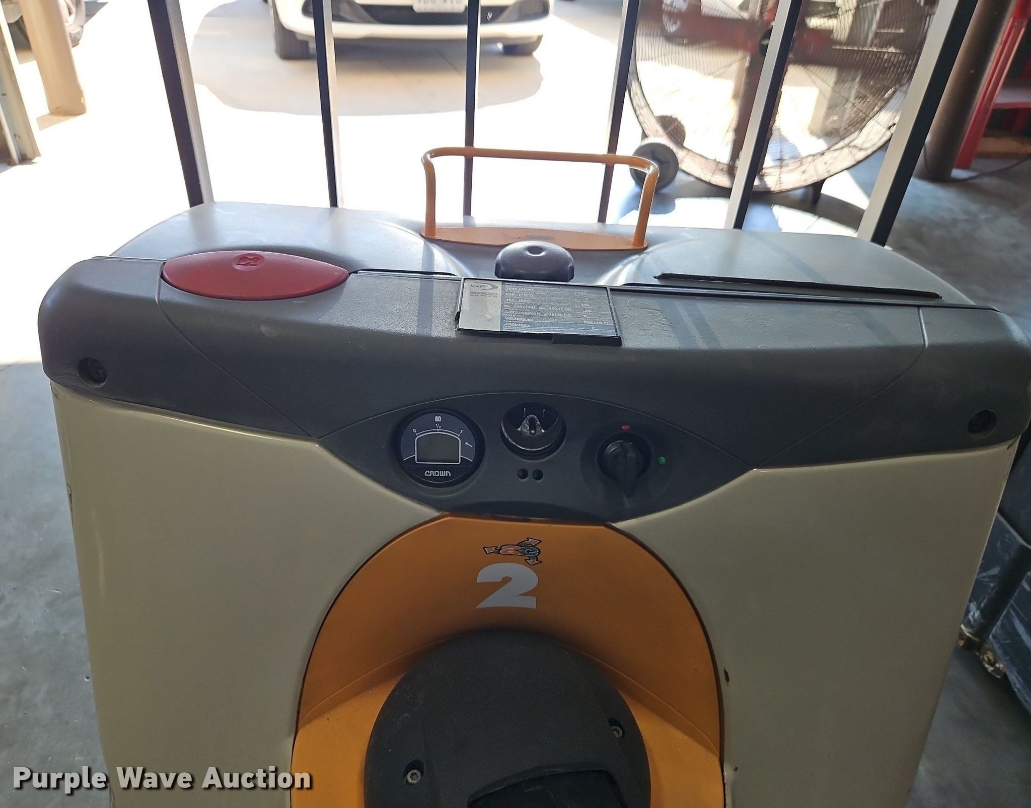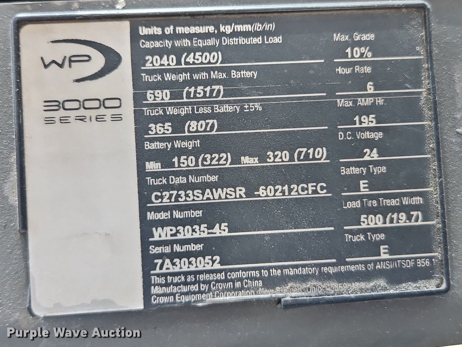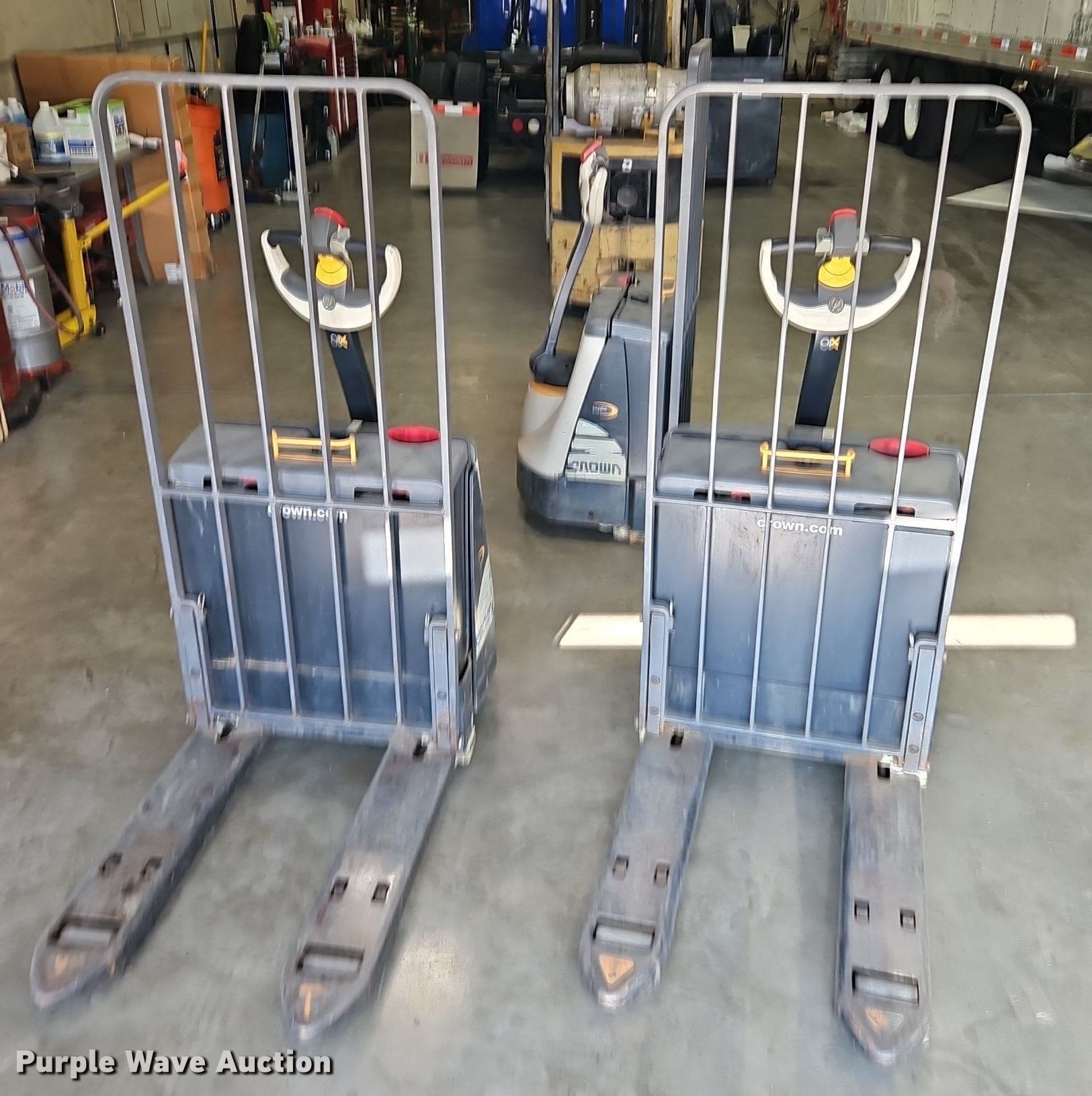 Purple Wave is selling a used Warehouse Forklift in Missouri. This item is a (3) Crown WP3035-45 pallet jacks with the following: Volts: 24
