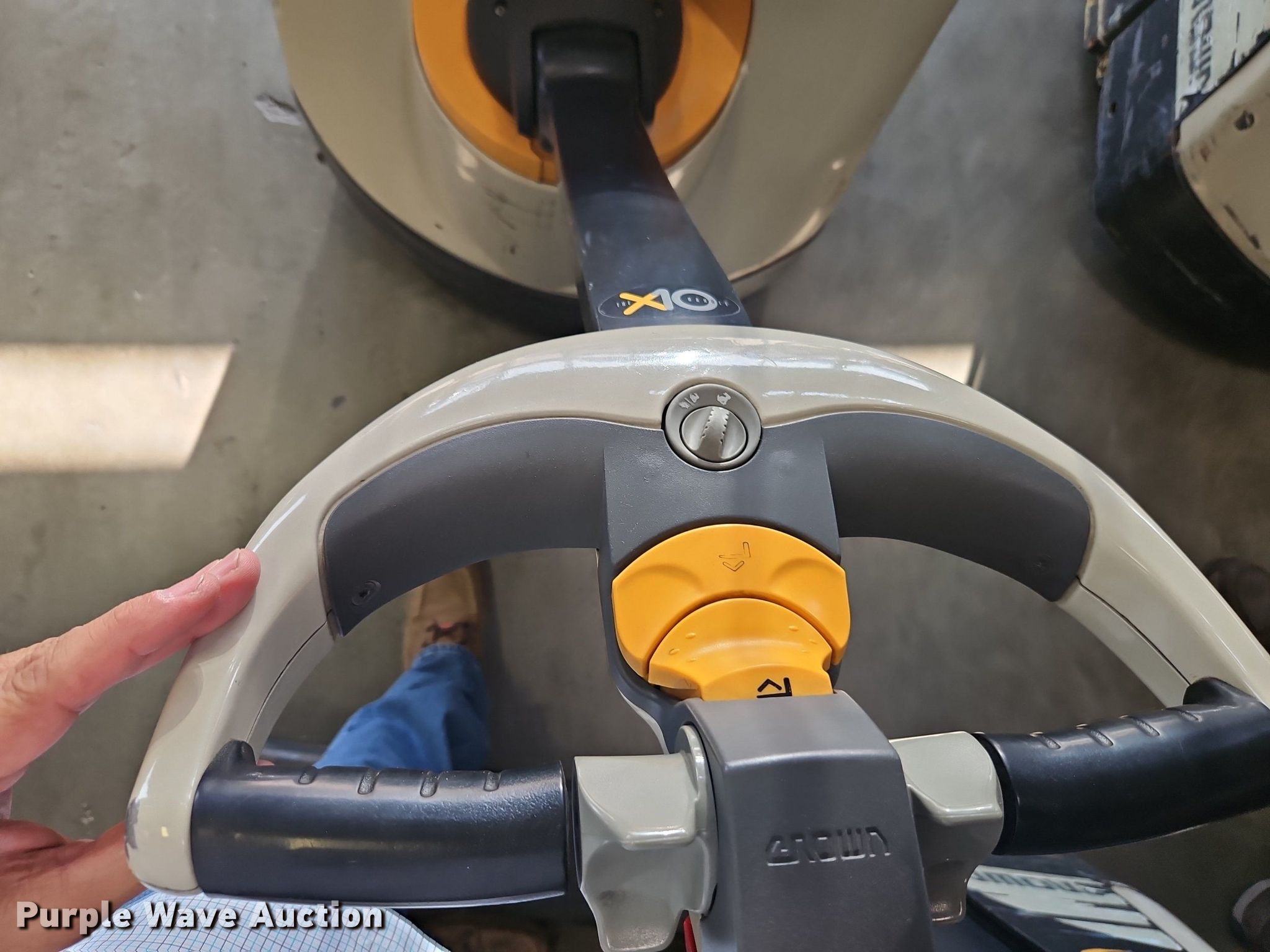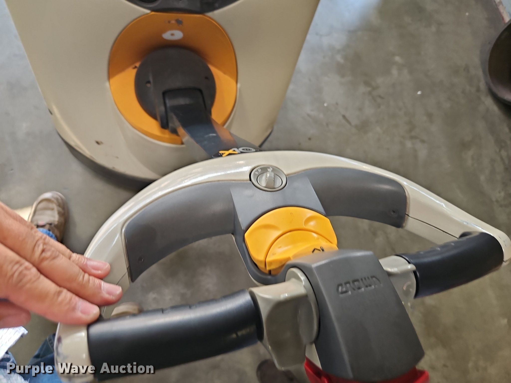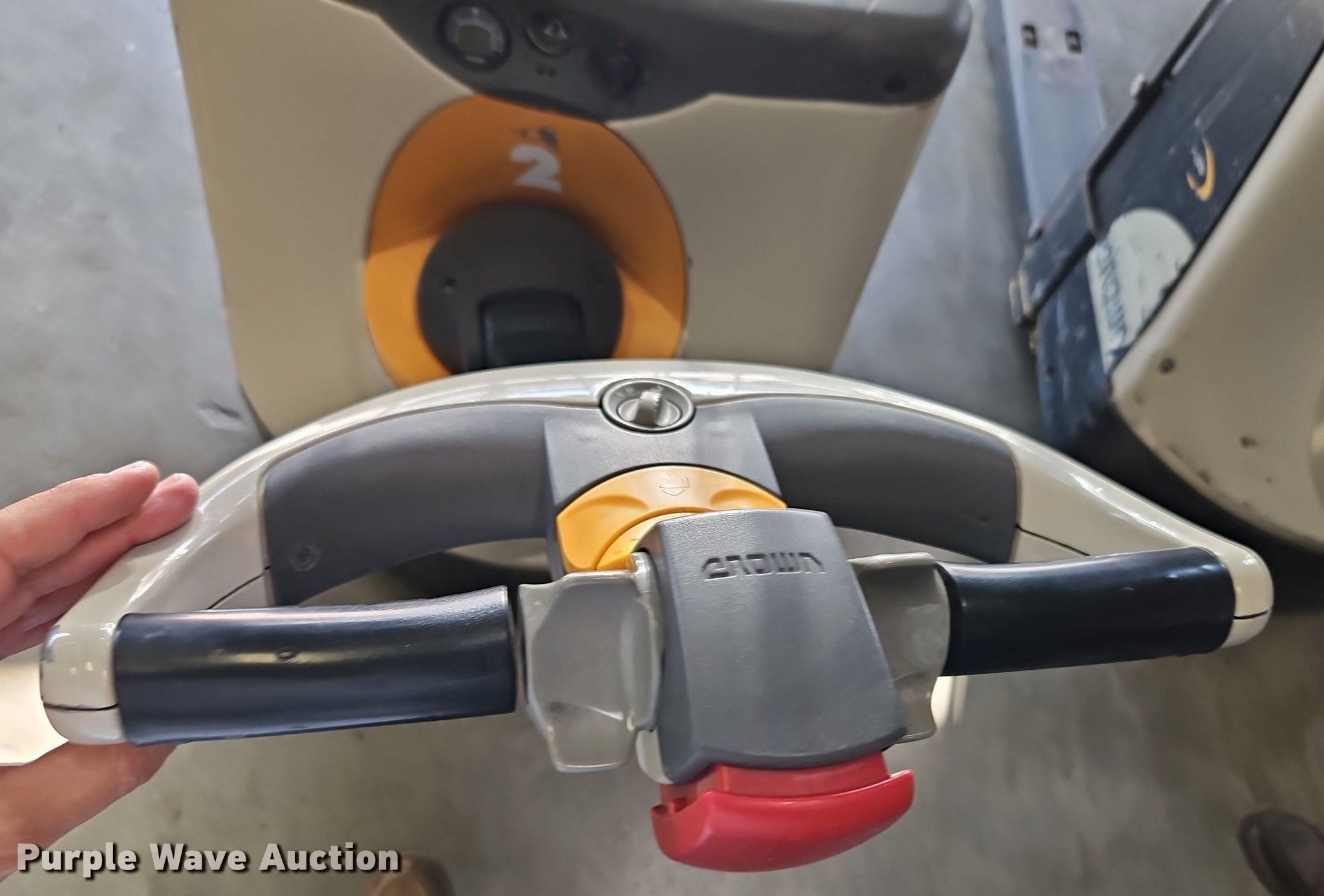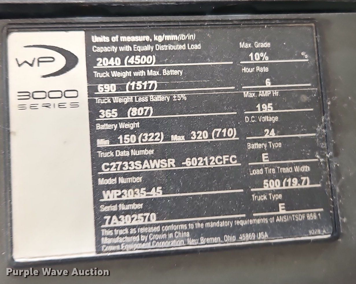 Purple Wave is selling a used Warehouse Forklift in Missouri. This item is a (3) Crown WP3035-45 pallet jacks with the following: Volts: 24