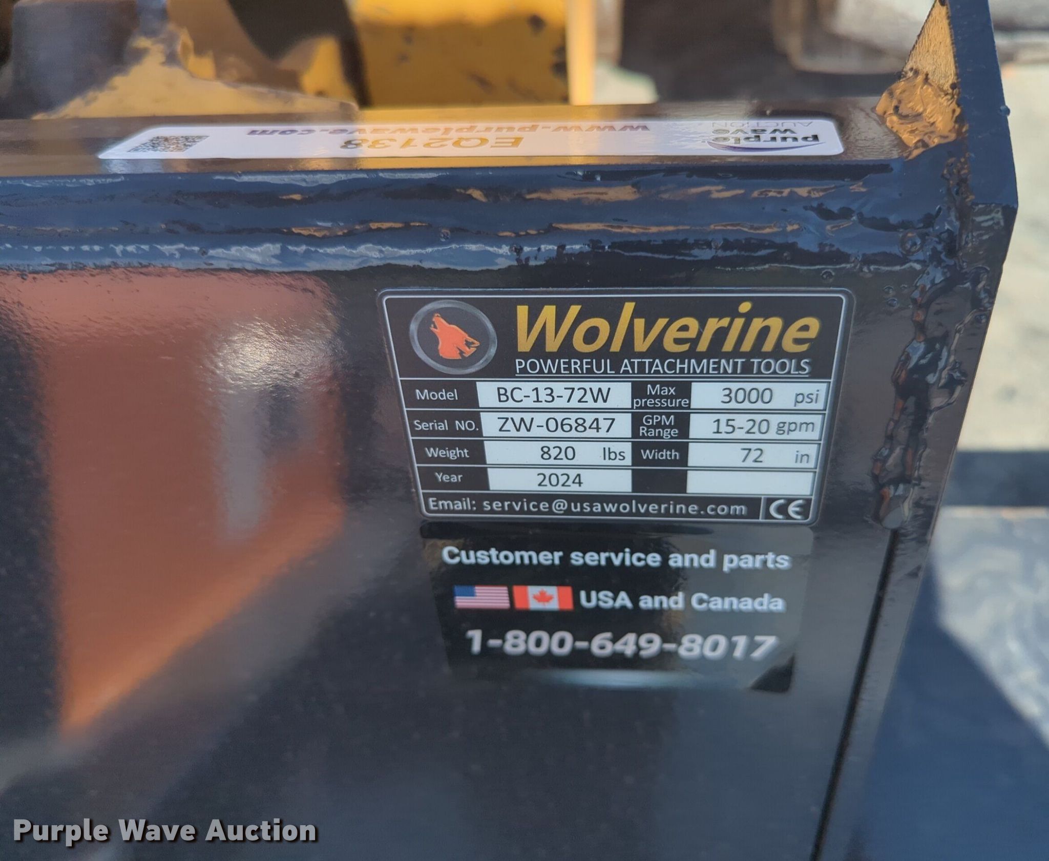 Purple Wave is selling a used Skid Steer Attach. in Oklahoma. This item is a 2024 Wolverine BC-13-72W skid steer rotary mower with the following: Serial: ZW-06847, Length: 72"