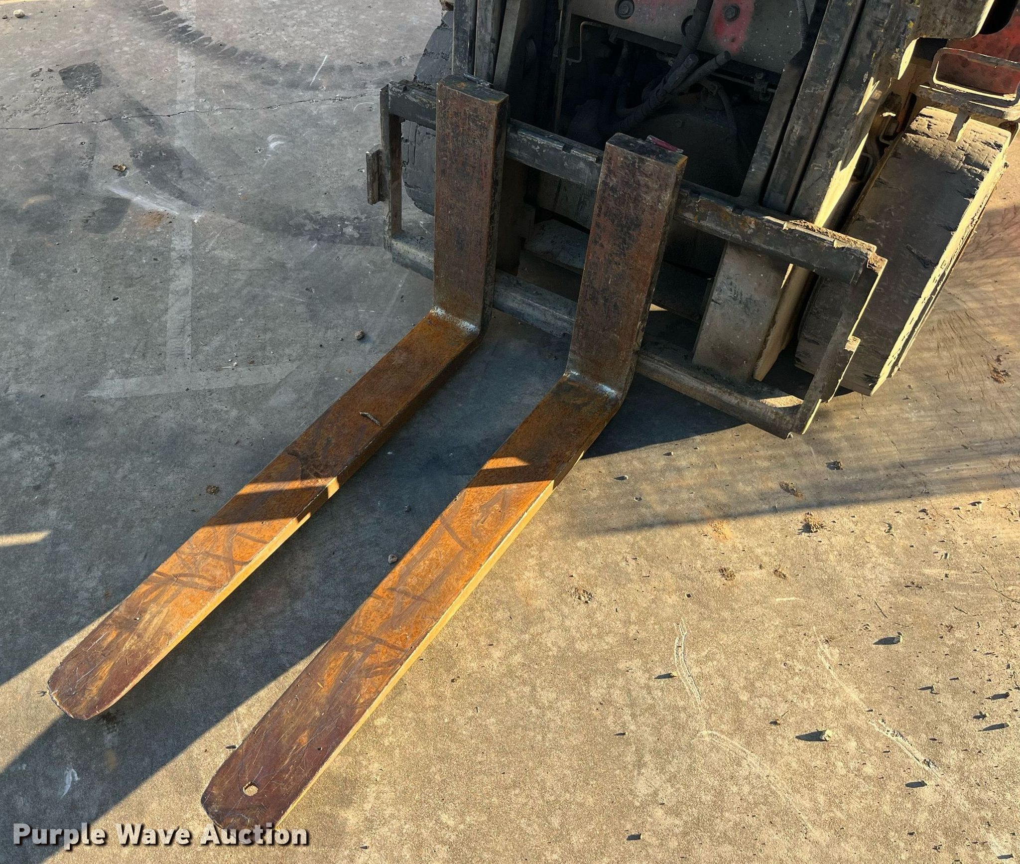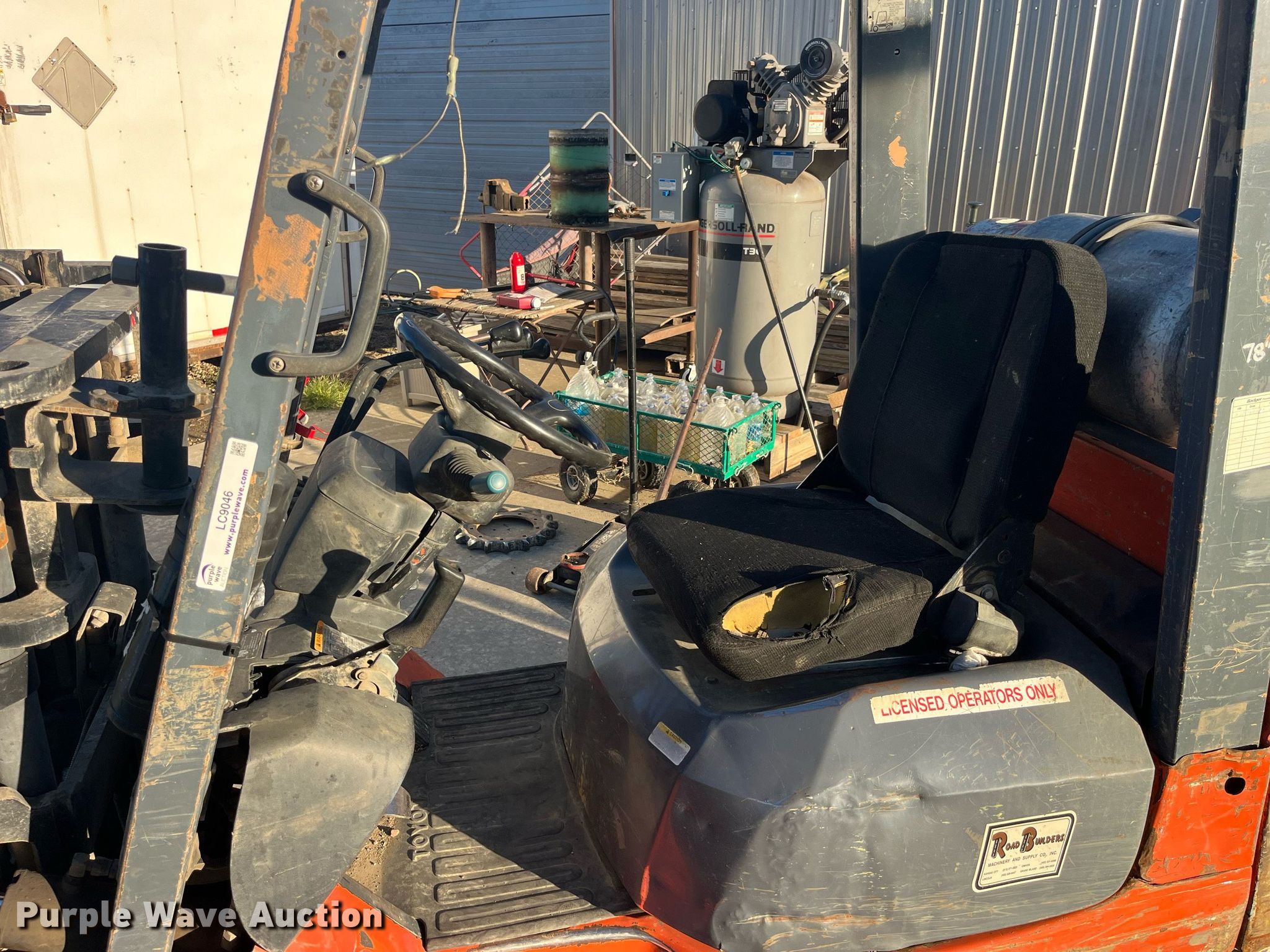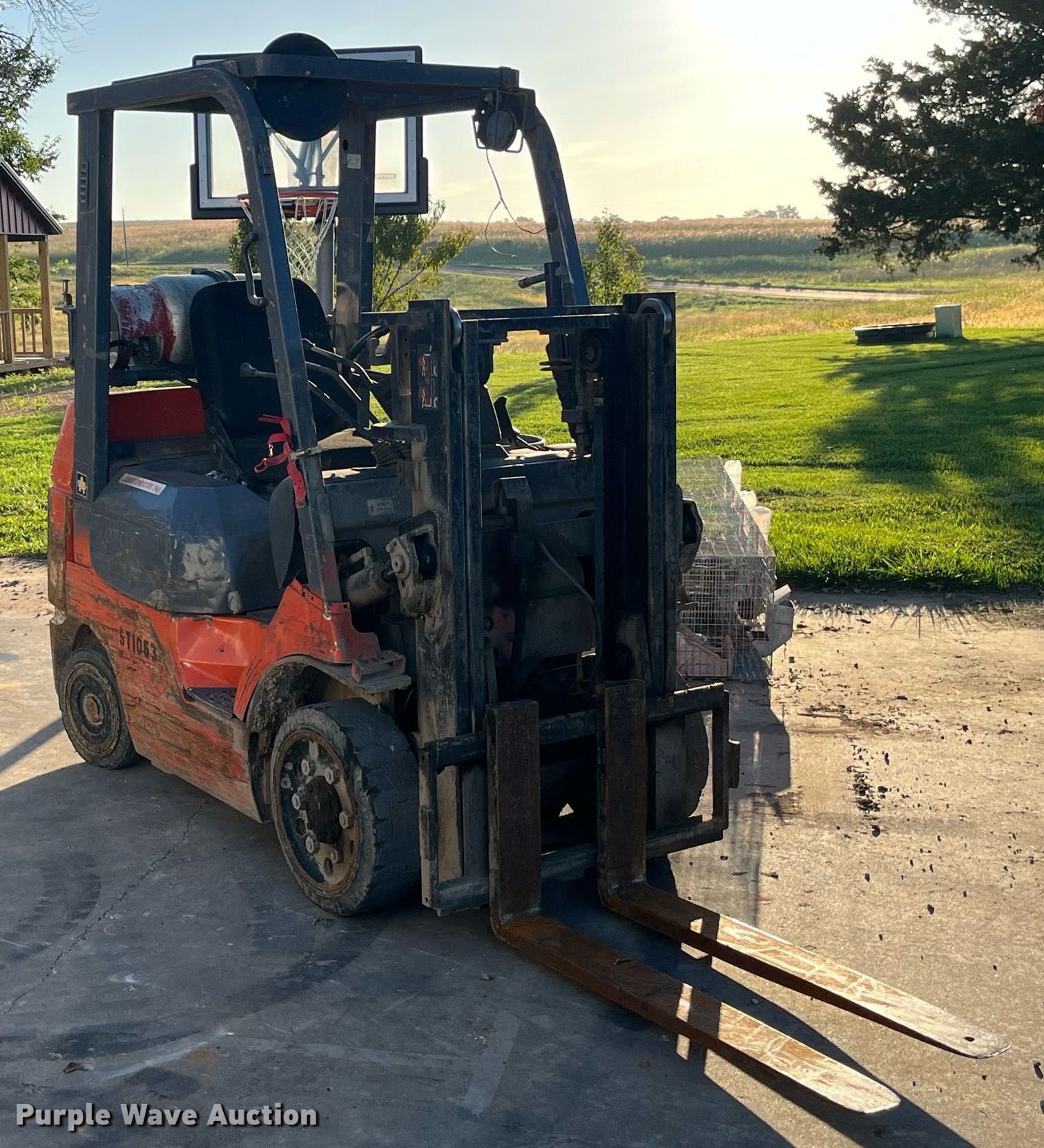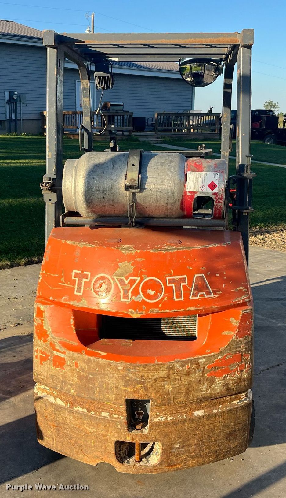 2000 Toyota 7FGCU25 forklift. Hours: Unknown, Serial: 64307. Engine Toyota, Cylinders: 4, Fuel type: LPG LP bottle: Included. Transmission Powershift, 1F - 1R. Operators station Canopy. Features Maximum lift capacity: 5,100 lbs, Maximum lift height: 80", Mast stages: 2, Mast tilt, Fork length: 41". Tires Front: 21x7x15, Rear: 16x5x10 1/2, Solid. Notes Non-operational hour meter. D&L Customs. Stanberry, MO 64489