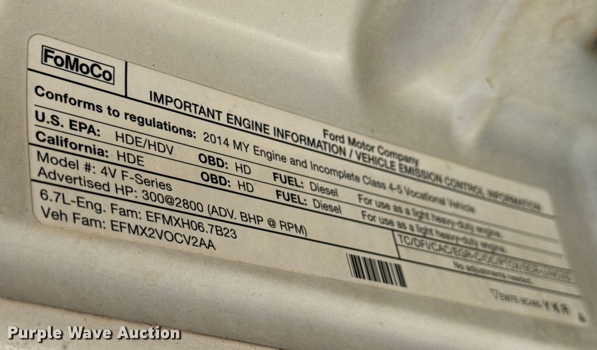 2014 Ford F550 Super Duty XL truck cab and chassis. Miles: 213,833 on odometer, VIN: 1FDUF5HT2EEB67008. Engine Displacement: 6.7L, Cylinders: 8, Fuel type: Diesel. Transmission Automatic. Chassis Four wheel drive, Axles: Single, Suspension: Spring, Brakes: Hydraulic, Truck chassis: 10' 8", GVWR: 19,500 lbs FAWR: 6,500 lbs, RAWR: 14,706 lbs, Wheelbase: 165". Interior AC, Heat, Heated mirrors, Power windows. Tires Size: 225/70R19.5. Notes Dead battery, Engine issues, Non-operational unit. Kansas title. Title distribution may be delayed up to 14 days from verification of funds. AVE-PLP, Inc. Kingman, KS 67068