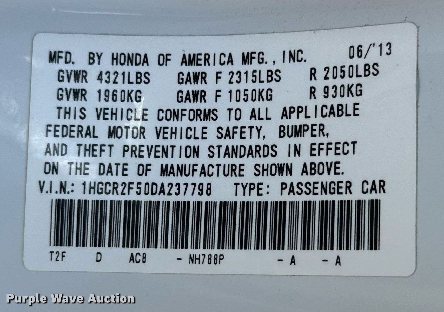 - VIN: 1HGCR2F50DA237798