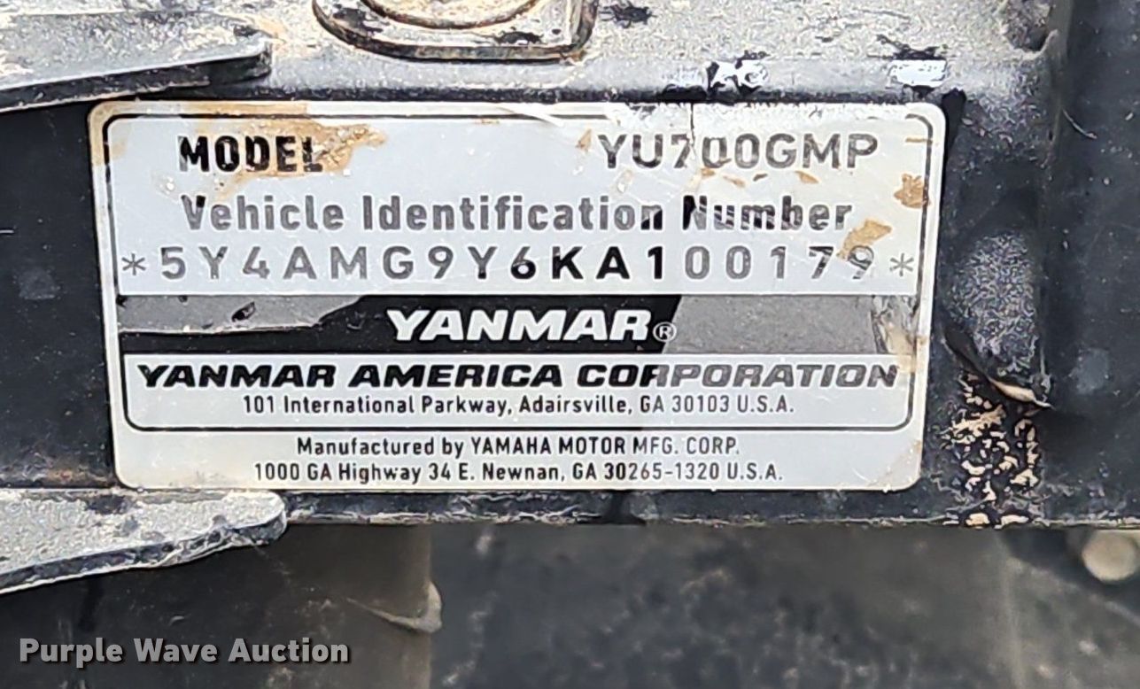 Purple Wave is selling a used Utility Vehicle in Alabama. This item is a 2019 Yanmar YU700GMP utility vehicle with the following: Miles: 5,366 on odometer, VIN: 5Y4AMG9Y6KA100179