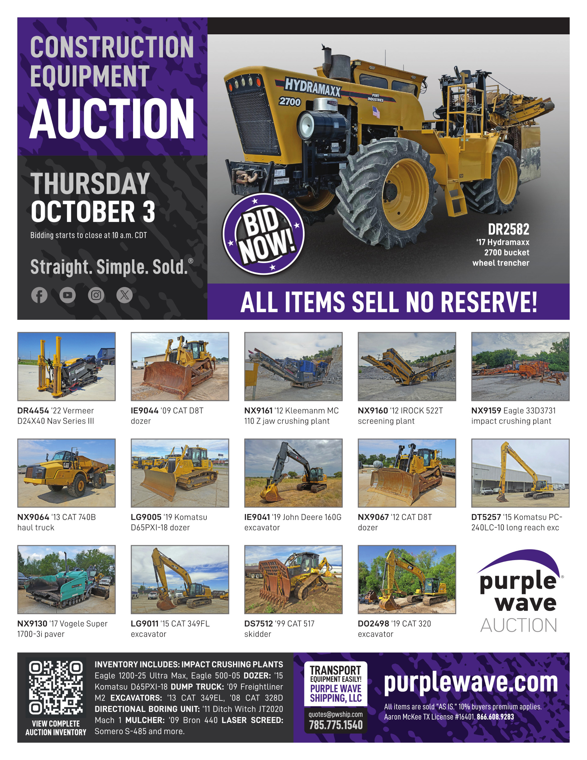 This auction is conducted by Purple Wave, Inc., whose home office is 825 Levee Drive, Manhattan, Kansas. Aaron McKee, Texas auctioneer license # 16401, operates Purple Wave, Inc. Complaints against us may be directed to the Texas Department of Licensing and Regulation, P.O. Box 12157, Austin, Texas 78711, (512) 463-6599. For additional required information, see the attached document.