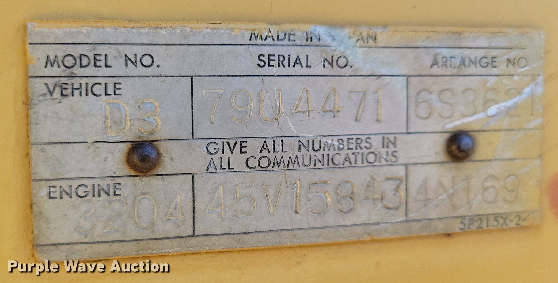 1978 Caterpillar D3 dozer. Hours: 602 on meter, Serial: 79U4471. Engine Caterpillar 3204, Serial: 45V15843, Cylinders: 4, Fuel type: Diesel. Transmission Powershift, 2F - 2R. Operators station OROPS. Features Screen guards, Sweeps, Dozer blade Type: 6-way, Straight, Width: 94", Attachments Winch. Tracks Width: 16", Grouser pads: Single, Bottom rollers: 5, Track guards. Notes Battery cover plate included, Unknown operating condition of winch, no cable, Tilt cylinder issues, hydraulic hose broken. RTO Trucking. Mitchell, SD 57301