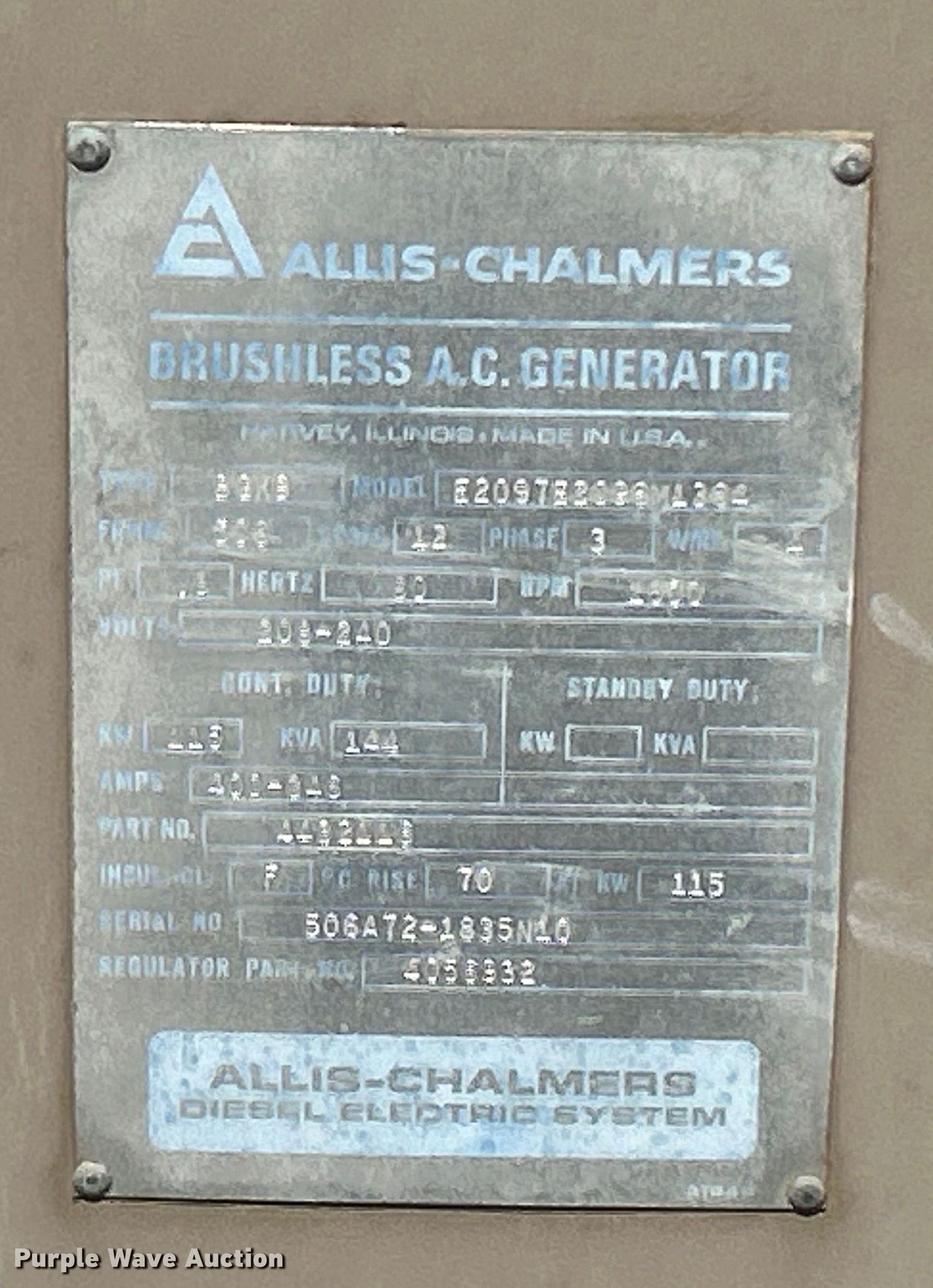 Allis Chalmers 8GKB generator. Hours: 311 on meter, Serial: 506A72-1335N10. Engine Allis Chalmers 11000, Serial: 11-20571, Cylinders: 6, Fuel type: Diesel. Features Generator kVA: 144, kW: 115, Phase: Three, Electric start, Skid mounted. Notes Unknown operating condition. Contech Inc.. Broken Arrow, OK 74012