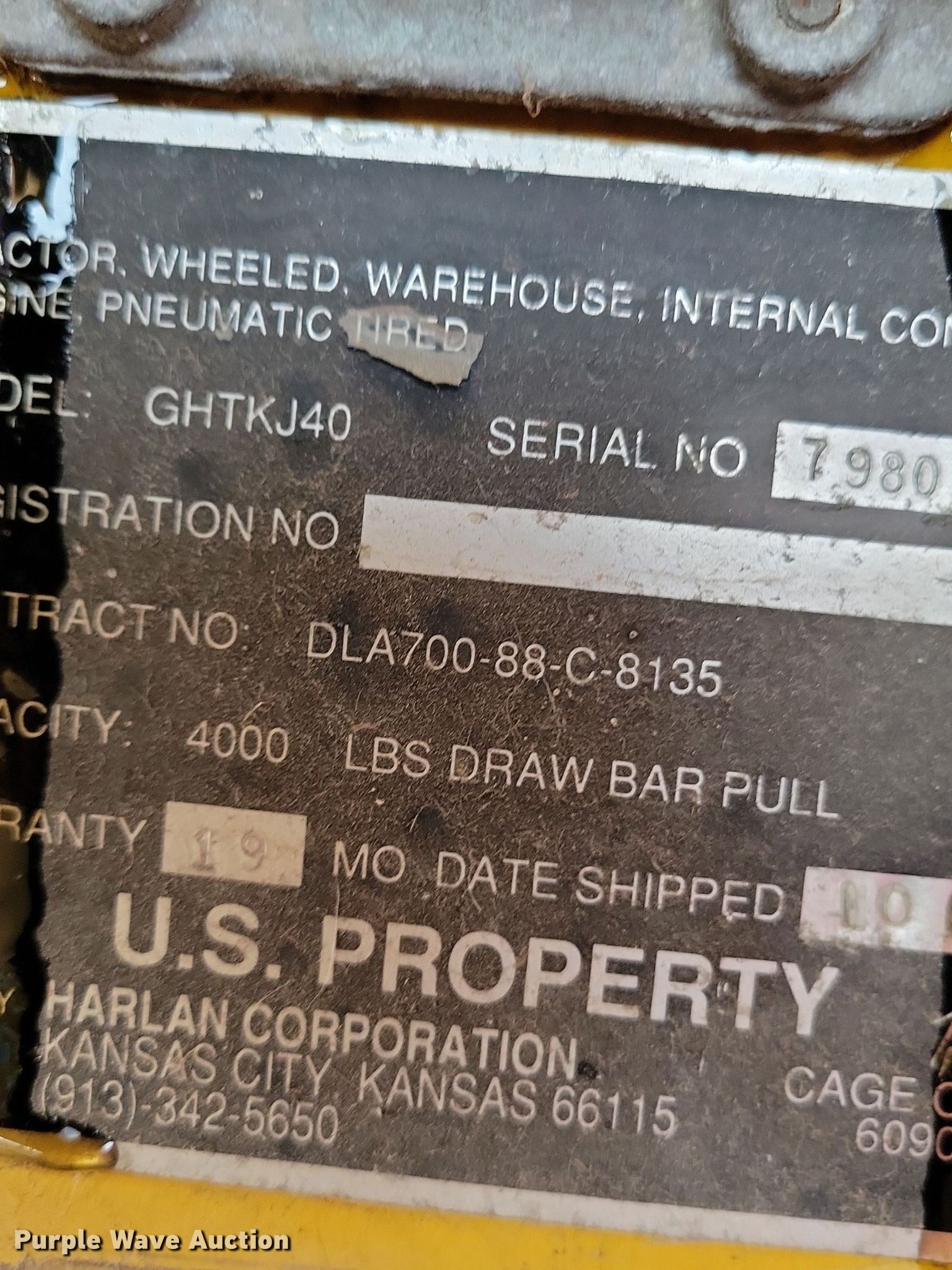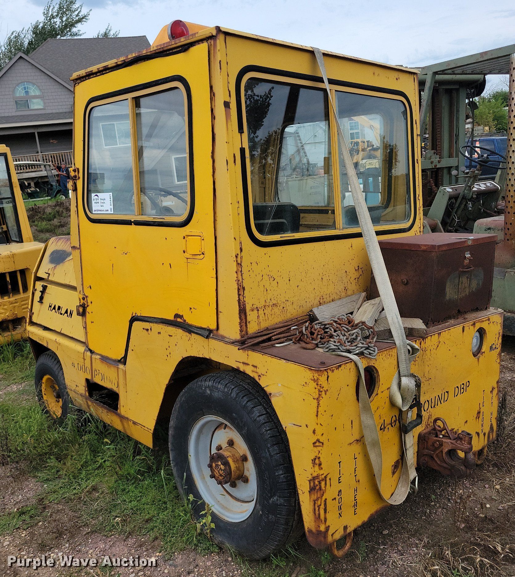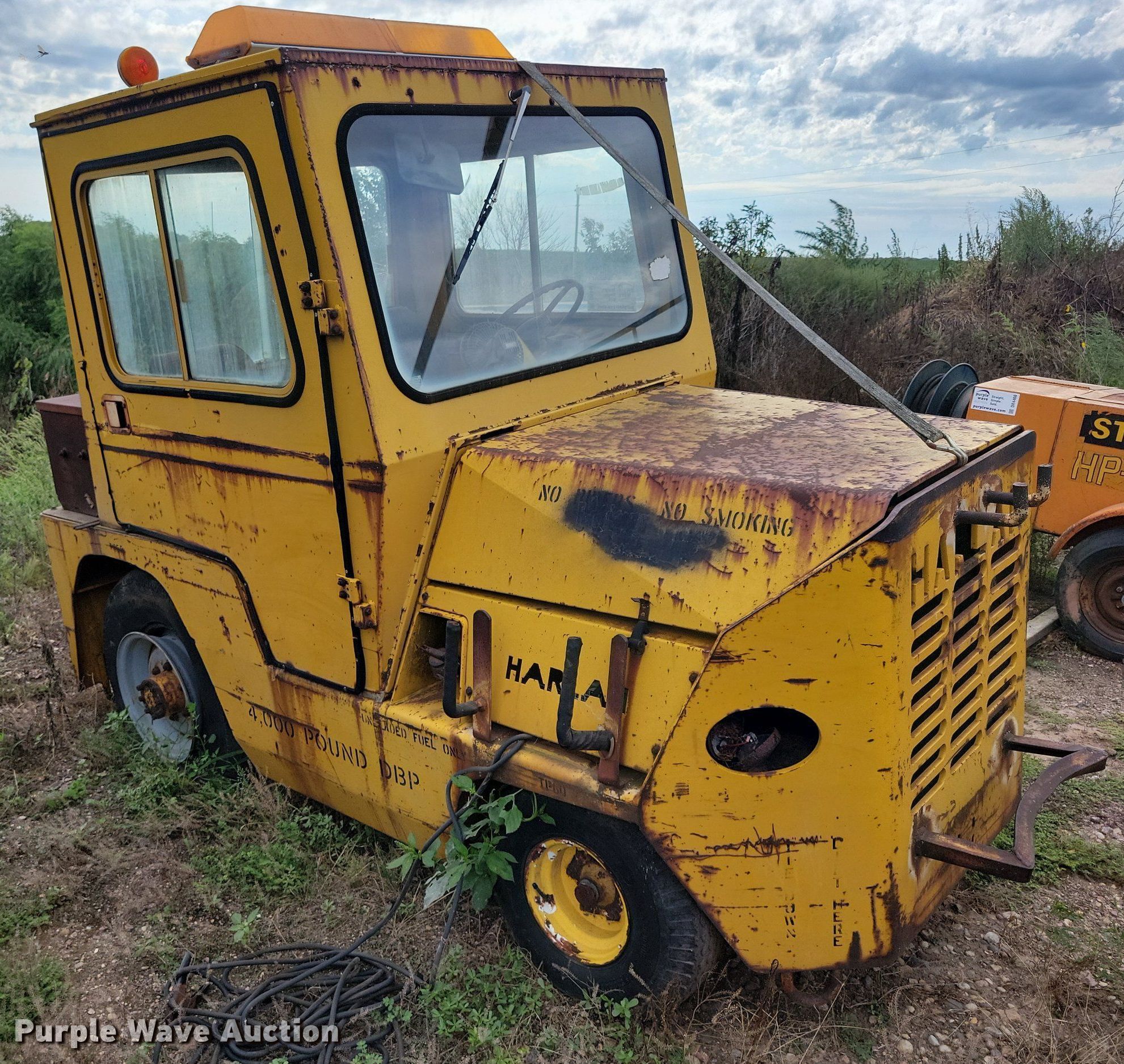 Harlan GHTKJ40 aircraft tug. Hours: 143 on meter, Serial: 7980. Engine Cylinders: 4, Fuel type: Gas. Transmission Automatic. Tires Front: 6.5-10NHS, Rear: ST235/80R16. Notes Unknown operating condition. Canton, SD 57013