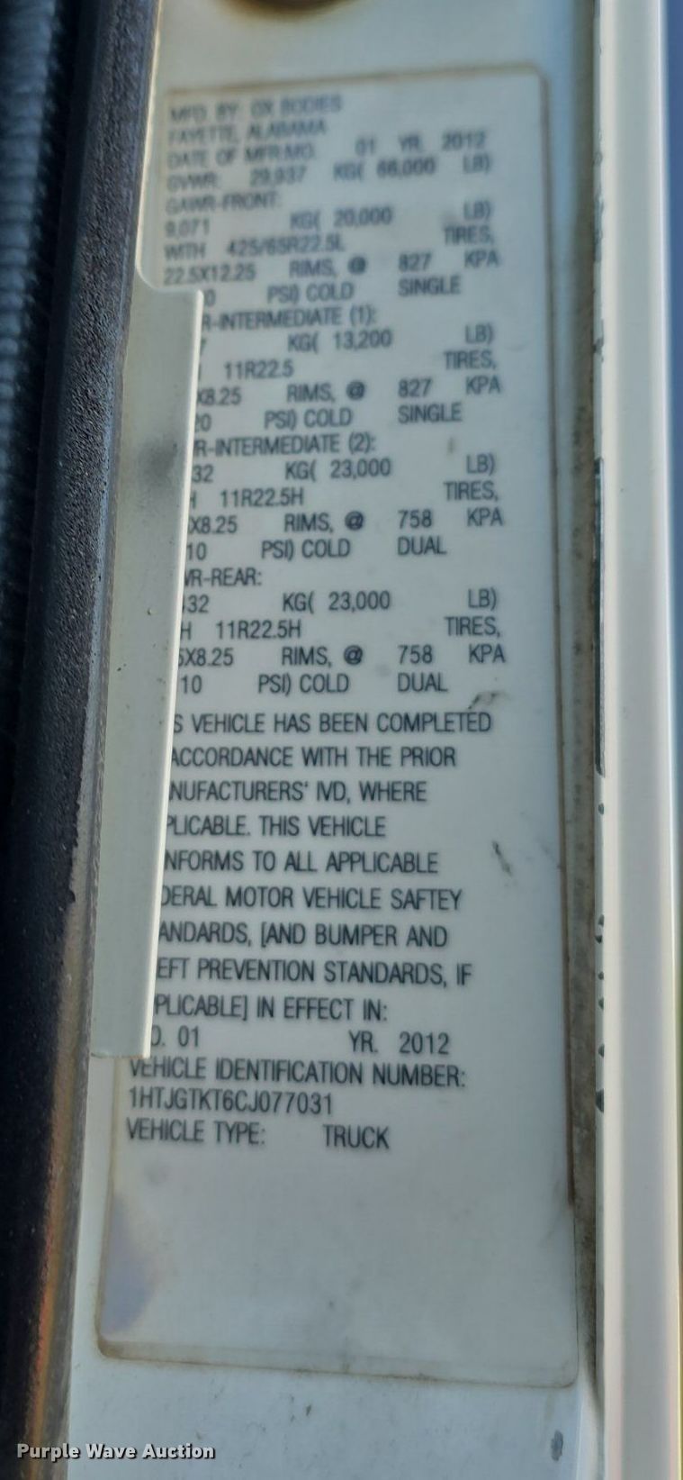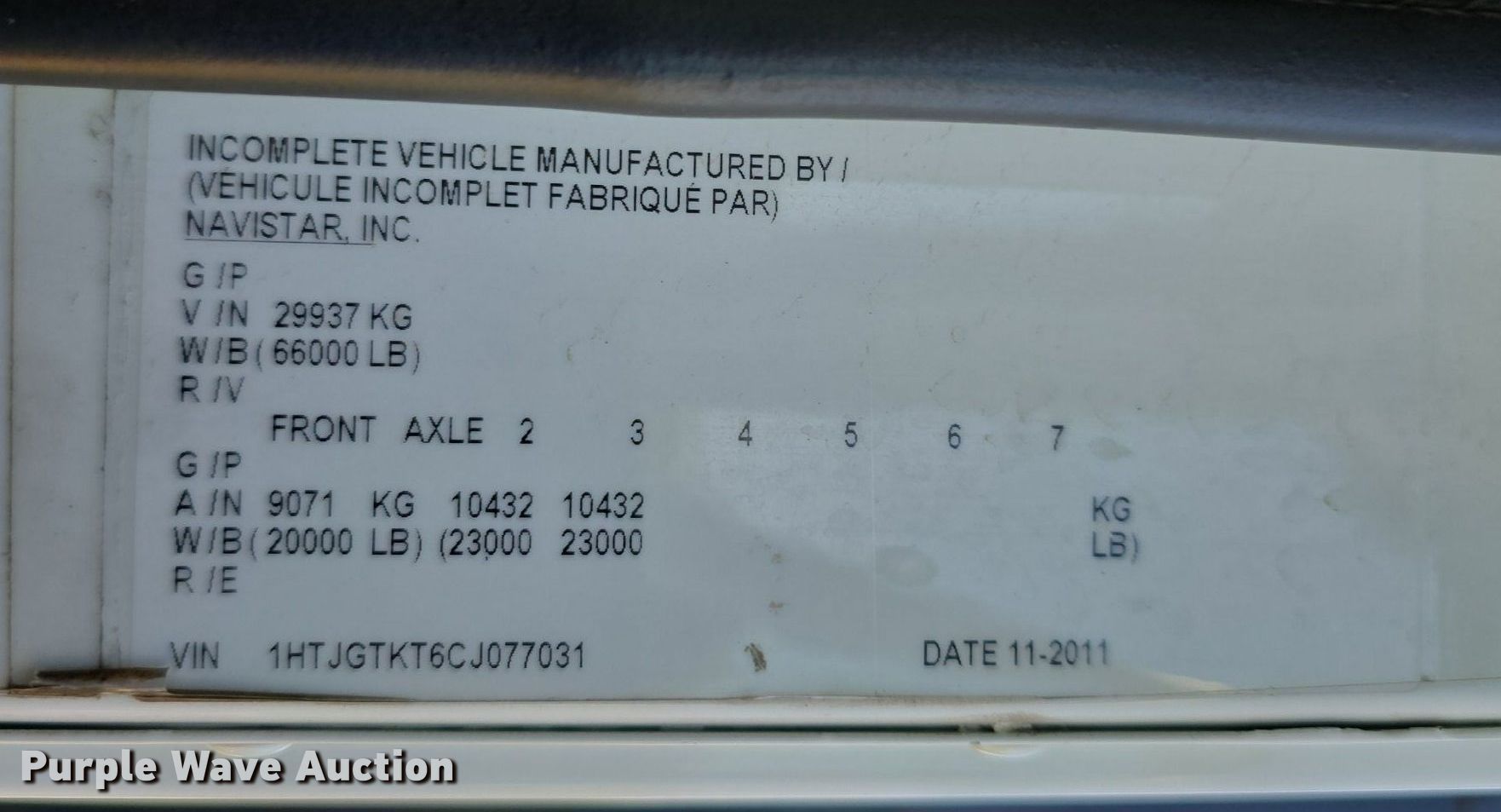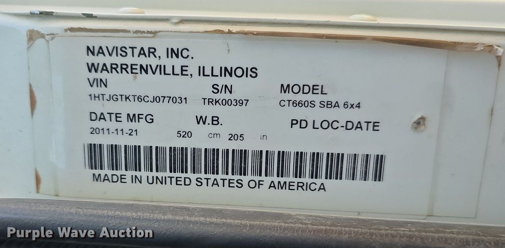2012 Caterpillar CT660 dump truck. Miles: Unknown, VIN: 1HTJGTKT6CJ077031. Engine Caterpillar CT13, Displacement: 13.0L, Cylinders: 6, Fuel type: Diesel, Engine brake. Transmission Caterpillar, Automatic. Chassis Double frame, Axles: Tandem, Differential lock: Full, Suspension: Spring over walking beam, Brakes: Air, PTO, GVWR: 66,000 lbs FAWR: 13,200 lbs, IAWR: 23,000 lbs, RAWR: 23,000 lbs, Wheelbase: 206". Interior AC, Heat, Heated mirrors, Power windows, Cruise control. Features Dump bed Ox Bodies, 16' L x 96" W, Side height: 65", Bed type: Steel, Bed vibrator, Roll tarp, Ram: Single, End gate: Air operated. Tires Front: 425/65R22.5, Rear: 11R24.5. Notes Windshield chipped or cracked, Non-operational dash cluster, Electrical issues, Intermittent transmission electrical issues. Nebraska title. Mileage has not been verified. Odometer discrepancy will be marked on the title. Title distribution may be delayed up to 14 days from verification of funds. Ben Engel Construction LLC. Hastings, NE 68901