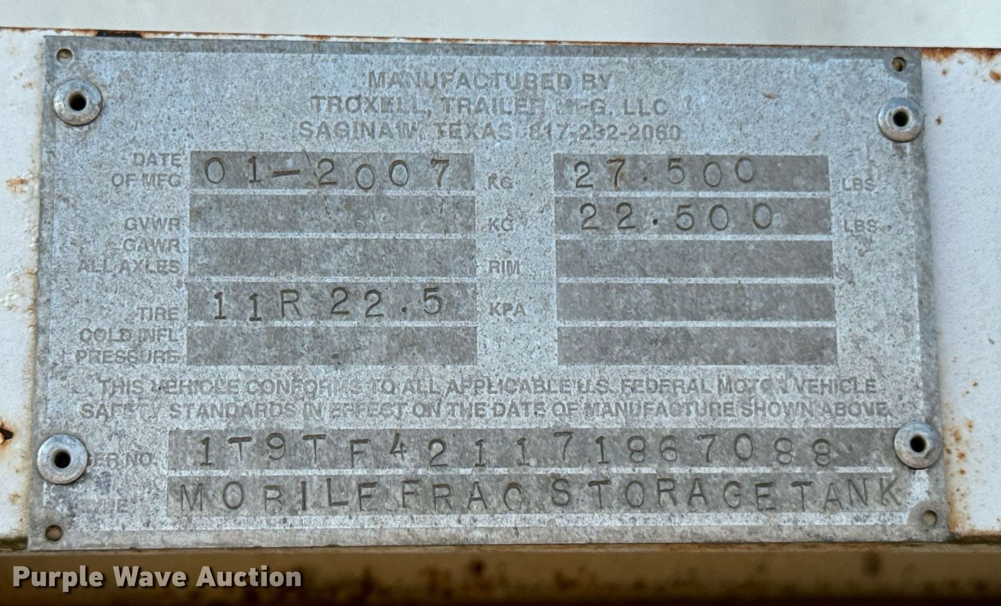 Purple Wave is selling a used Tank Trailer in Oklahoma. This item is a 2007 Troxell frac tank trailer with the following: VIN: 1T9TF421171867088