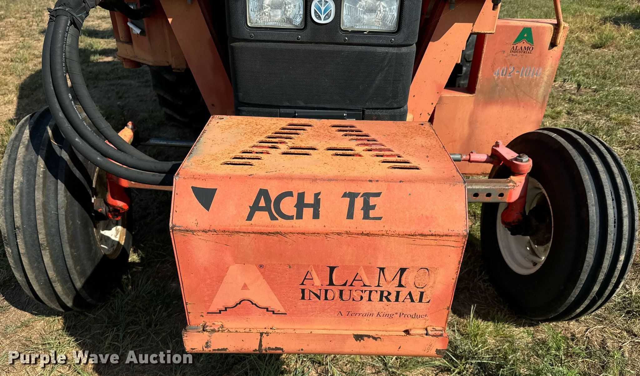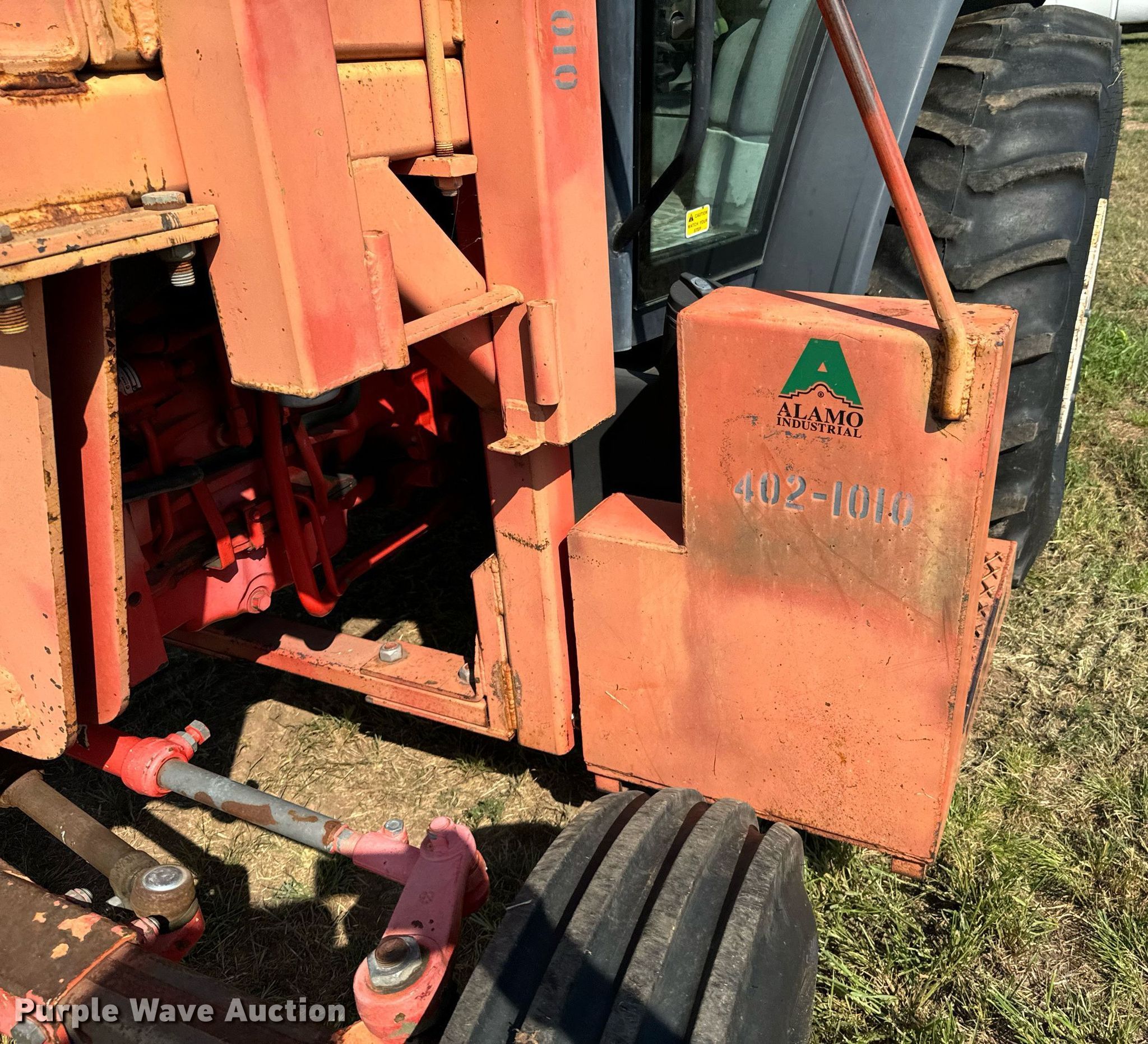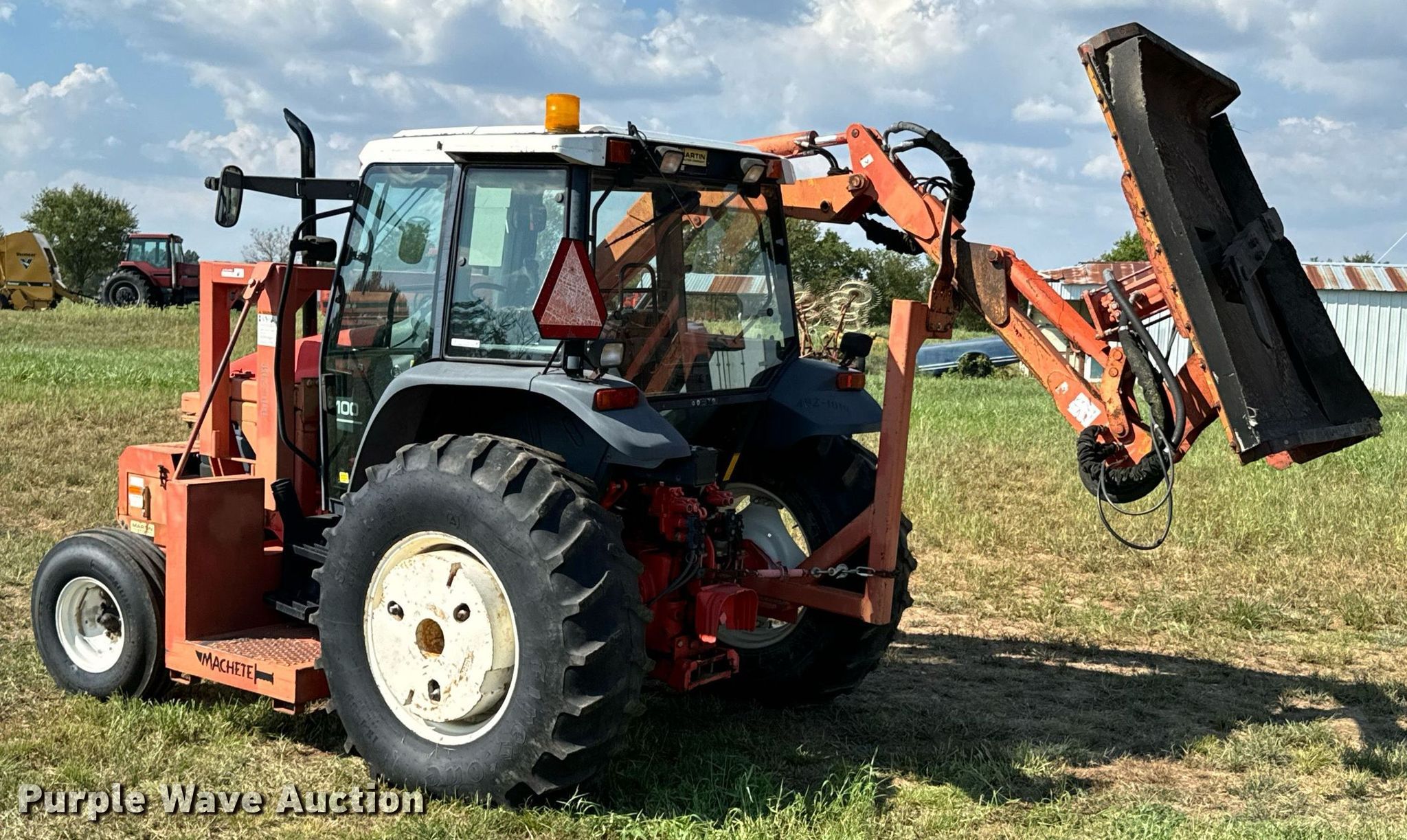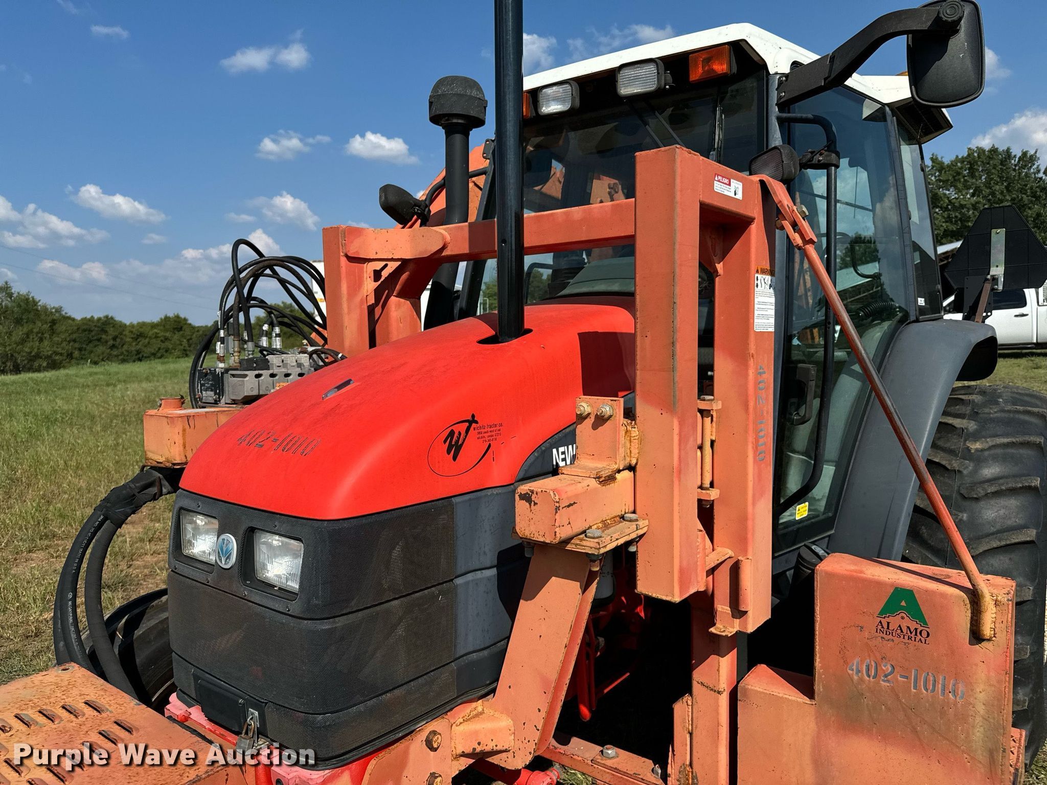 2001 New Holland TS100 tractor. Hours: 3,295 on meter, Miles or hours may vary, unit still in use, Serial: 155887B. Engine Cylinders: 4, Fuel type: Diesel. Transmission Dual power, 12F - 12R, Differential lock. Operators station AC, Heat. Features Seven pin outlet, Hydraulic remote sets Rear: 4, Alamo MR60 side boom mower Width: 66". Tires Front: 10.00-16, Rear: 18.4-30, Wheel weights: 1. OMNI Land Management LLC. Neosho, MO 64850