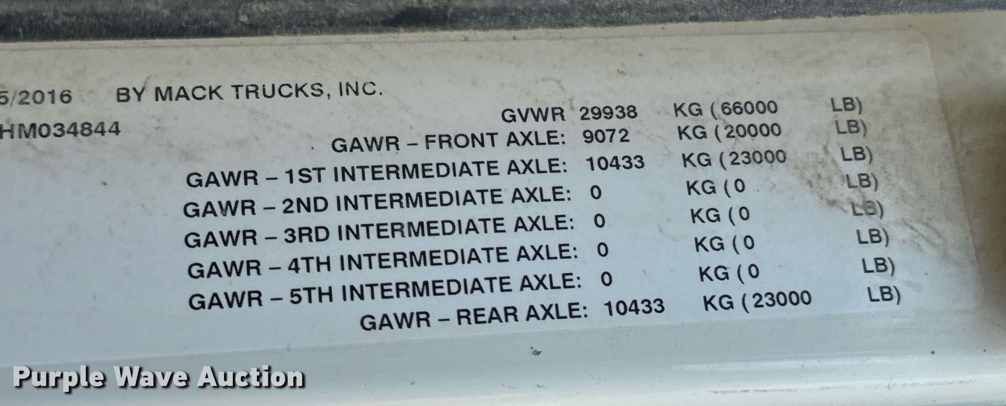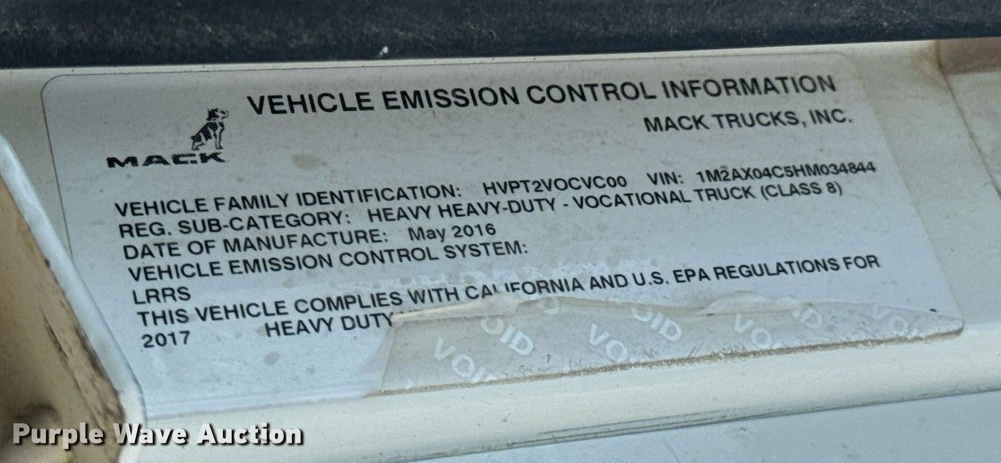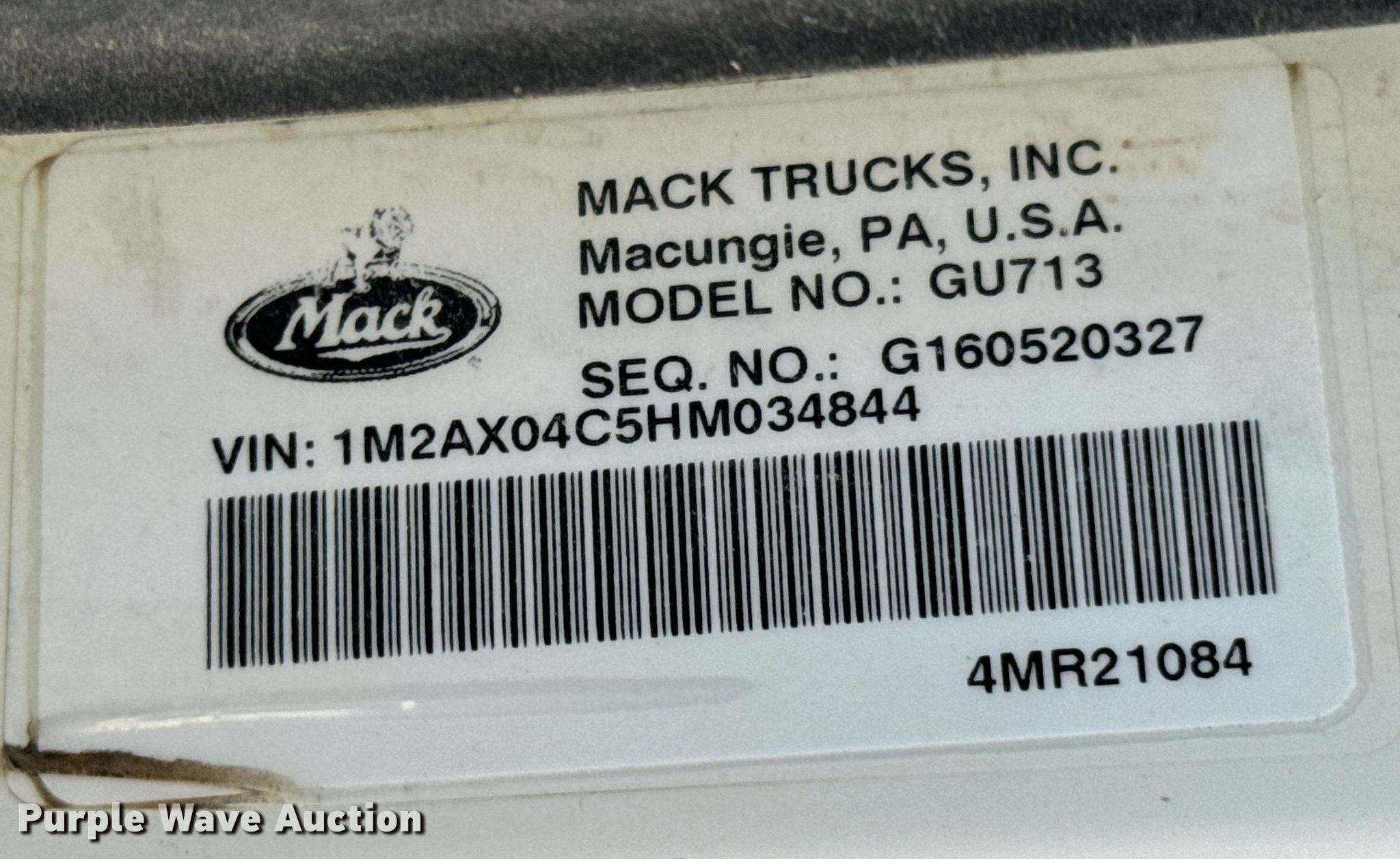 Purple Wave is selling a used Construction Dump Truck in Kansas. This item is a 2017 Mack GU713 dump truck with the following: Miles: Unknown, VIN: 1M2AX04C5HM034844