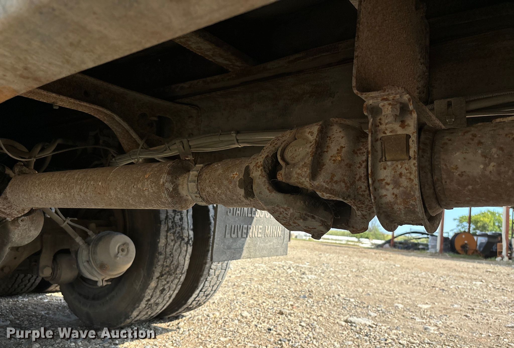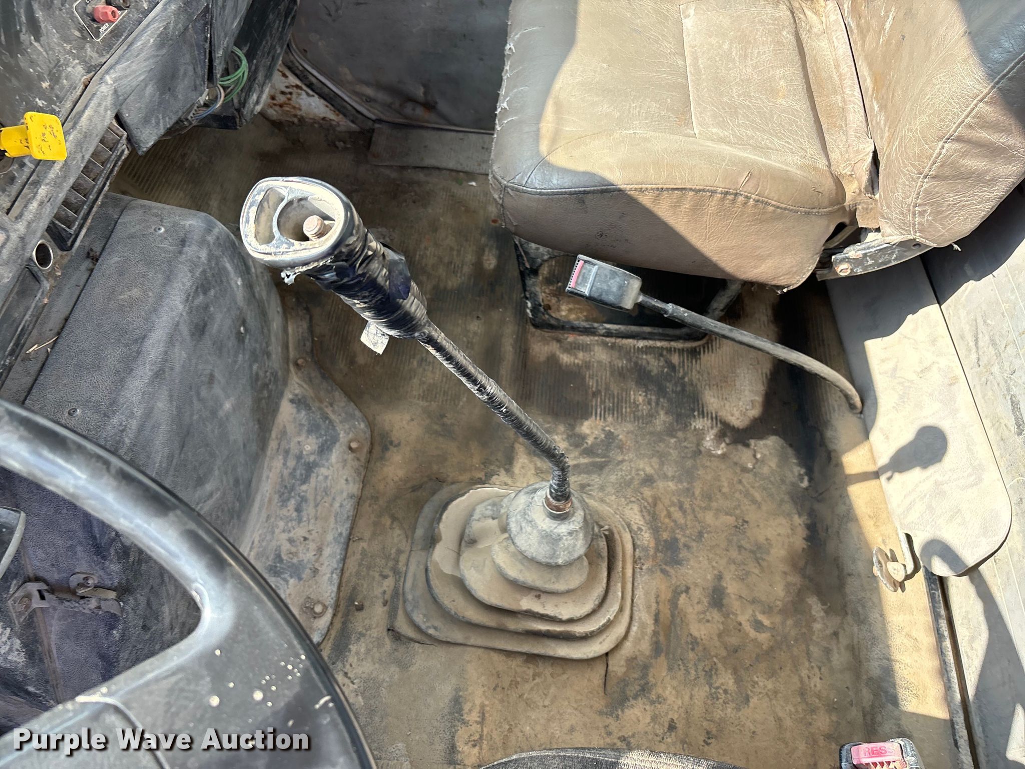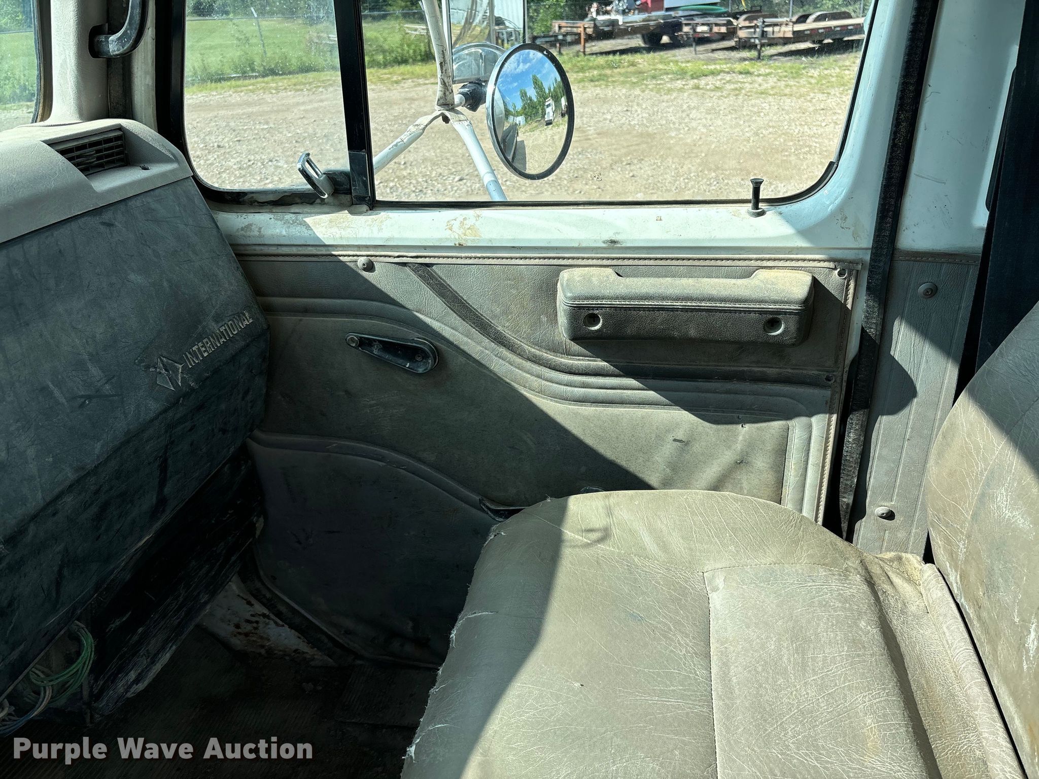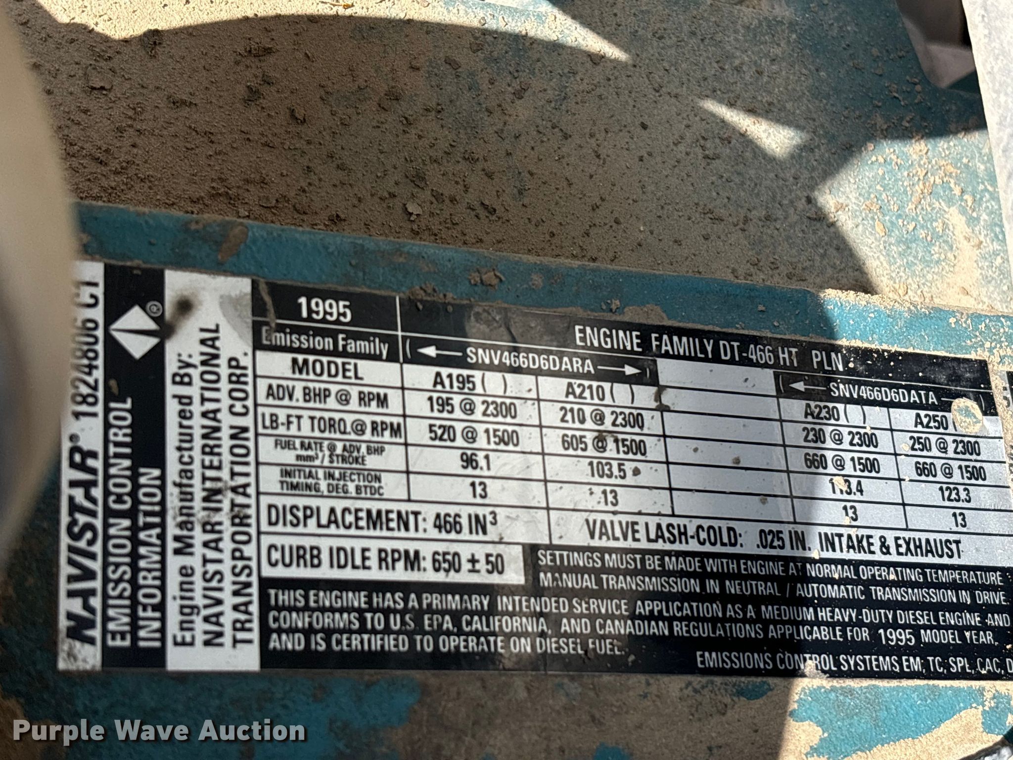 1995 International 4900 tank truck. Miles: 593,866 on odometer, VIN: 1HTSHAAR9SH688155. Engine International DT466, Displacement: 466 C.I.D., Cylinders: 6, Fuel type: Diesel. Transmission Manual, Speed: 7. Chassis Axles: Tandem, Differential lock: Inter-axle, Suspension: Spring over walking beam, Brakes: Air. Interior AC, Heat, Heated mirrors, Brake controller. Features Bed / tank 19' L x 96" W, Top fill, Rear outlet: 4", Double frame. Tires Front: 315/80R22.5, Rear: 11R22.5. Notes Water tank leaks. Kansas title. Associated Drilling, Inc. Olsburg, KS 66520