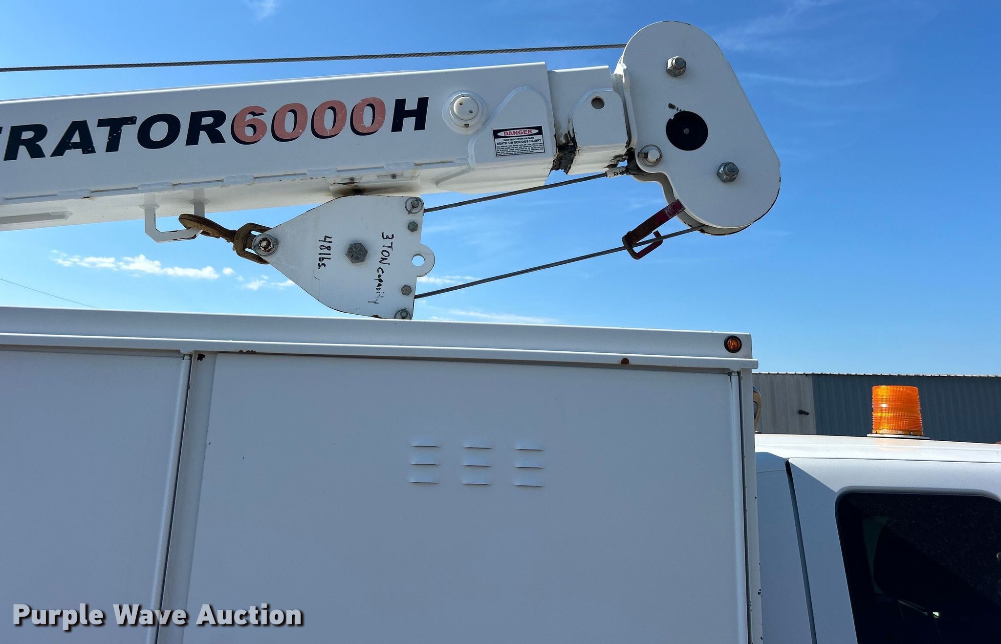 2012 Ford F550 Super Duty XL SuperCab utility / service truck. Miles: 97,161 on odometer, VIN: 1FD0X5HT7CEA71237. Engine Displacement: 6.8L V8 OHV, Cylinders: 8, Fuel type: Diesel. Transmission Automatic. Chassis Four wheel drive, Axles: Single, Suspension: Spring, Brakes: Hydraulic, PTO, GVWR: 19,500 lbs, Wheelbase: 186". Interior AC, Heat, Heated mirrors, Power windows, Power locks, Cruise control, Auxiliary controls, Brake controller. Features Bed 11' L x 96" W, Crane Liberator 6000H, Maximum boom length: 22' Maximum lift capacity: 6,000 lbs, Fabco Power Hydraulic Generator, Air tank. Tires Size: 225/70R19.5. Notes Windshield chipped or cracked, Driver side compartment door handle missing. Oklahoma title. Title distribution may be delayed up to 14 days from verification of funds. Collinsville, OK 74021